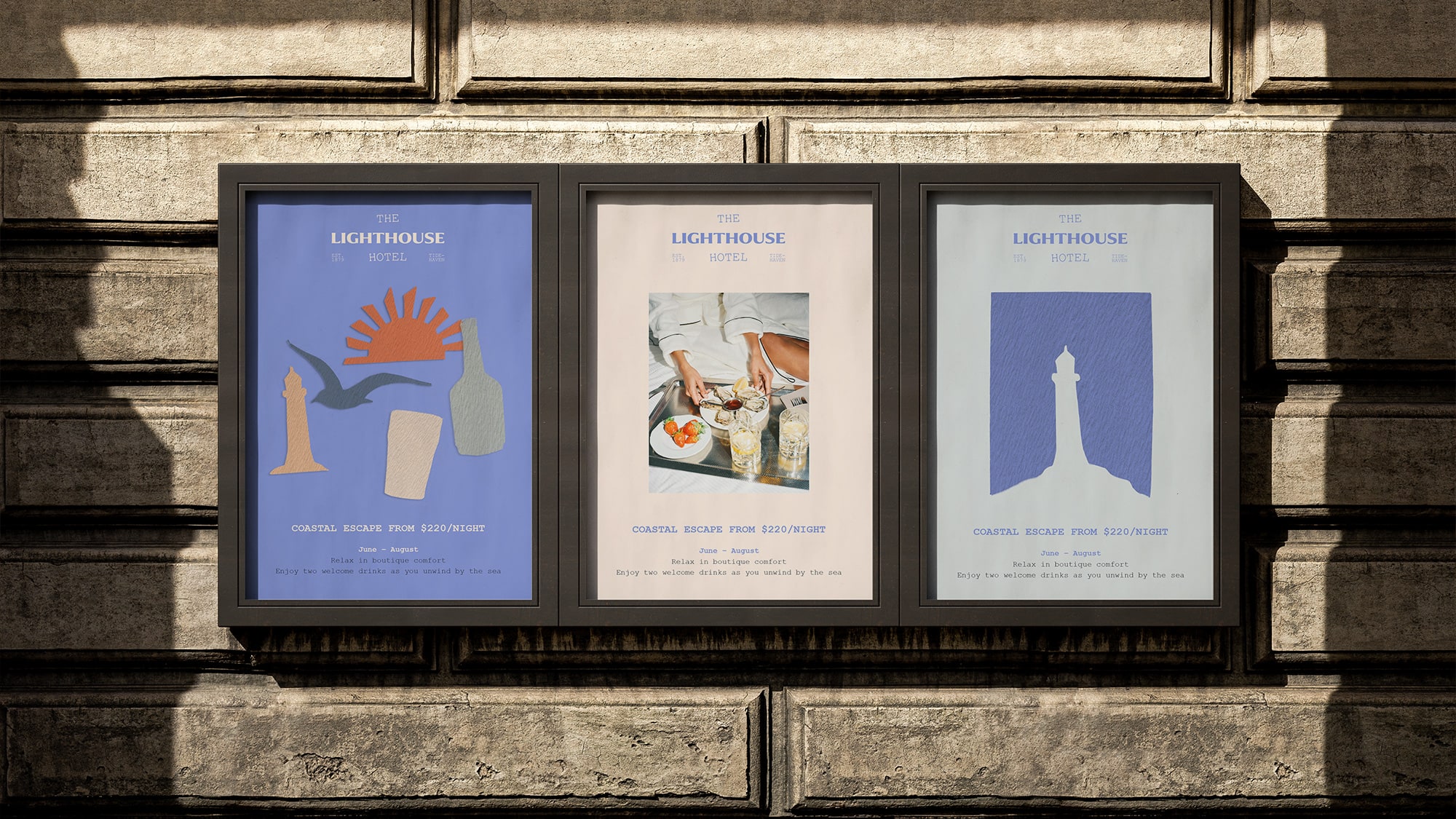 What began as a creative exploration led to a tactile, hands-on process. Drawing inspiration from the immediate environment, Belleville Studio developed a series of hand-cut shapes, which were then scanned and incorporated into the identity — a lighthouse, a cockatoo, a sunset, a carafe, and a glass. This handcrafted approach echoed the hotel’s grounded spirit, celebrating the human touch in a world increasingly defined by speed, technology, and uniformity.
