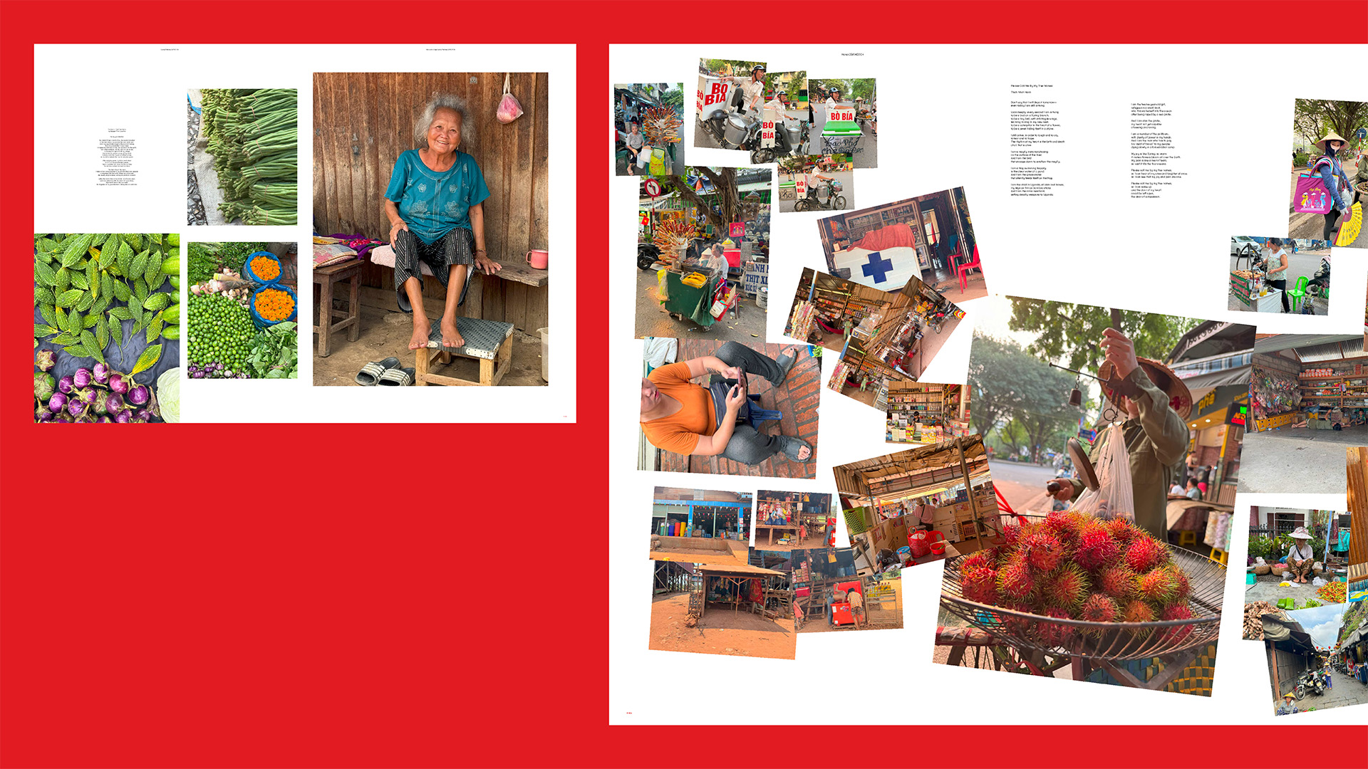 Typography becomes a second voice. Vietnamese poetry appears quietly in the margins or disrupts the page with force, shaping the rhythm of each spread. The book’s visual structure continuously challenges the borders between photography, literature, and graphic design, creating a multidisciplinary field where the three become inseparable.