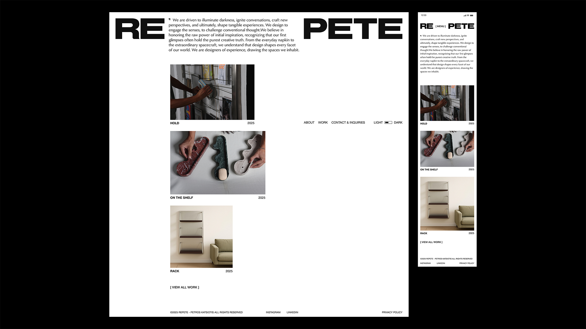 The owner’s background is closely connected to lighting design, therefore REPETE’s identity is built around a fundamental visual and conceptual contrast: light and darkness. This duality forms the foundation of the studio’s graphic language and is expressed through a strict black-and-white typographic system. Contrast functions as a material in itself, revealing form through shadow, presence through absence.