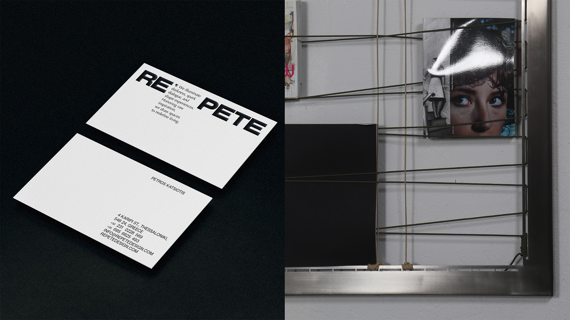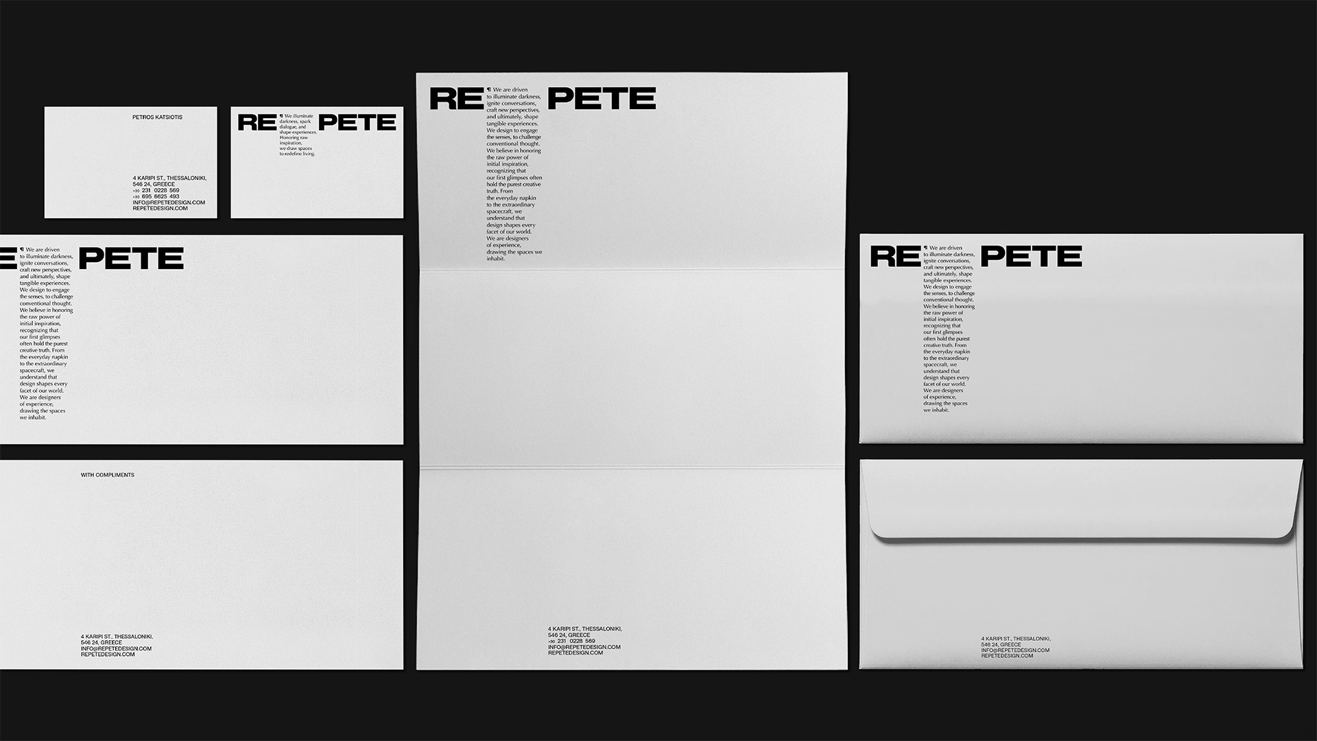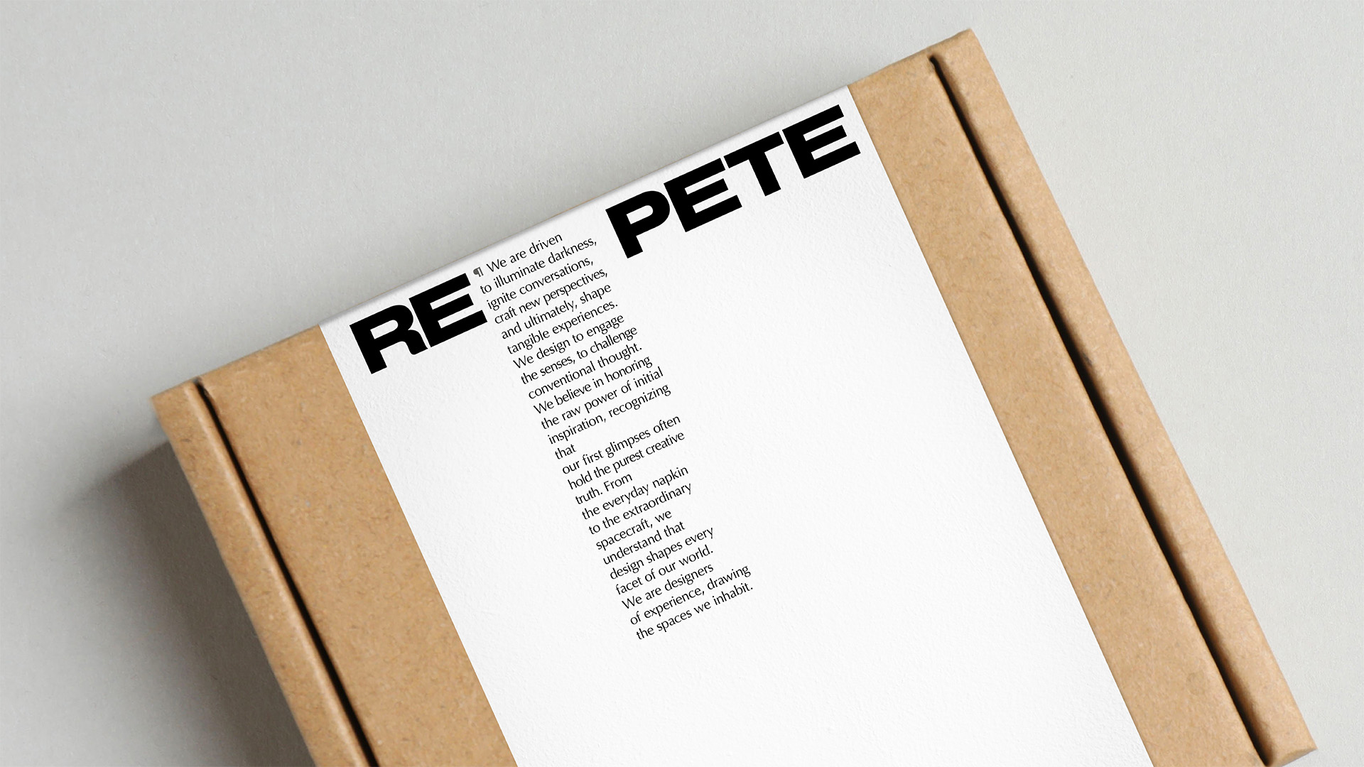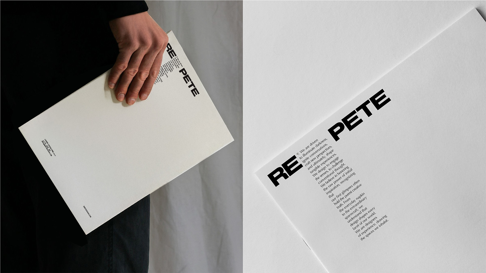At the core of the identity lies the studio’s manifesto, which frames design as an act of illumination: igniting conversations, shaping perspectives, and creating tangible experiences. This philosophy directly informs the construction of the logo. The name REPETE is intentionally divided. After the prefix “re,” a paragraph symbol is introduced, marking the presence of the manifesto and acknowledging text as a structural element of the brand. The second part, “pete,” derives from the founder’s name, grounding the identity in authorship without turning it into a personal signature.