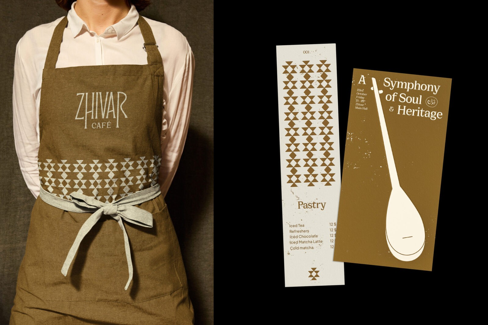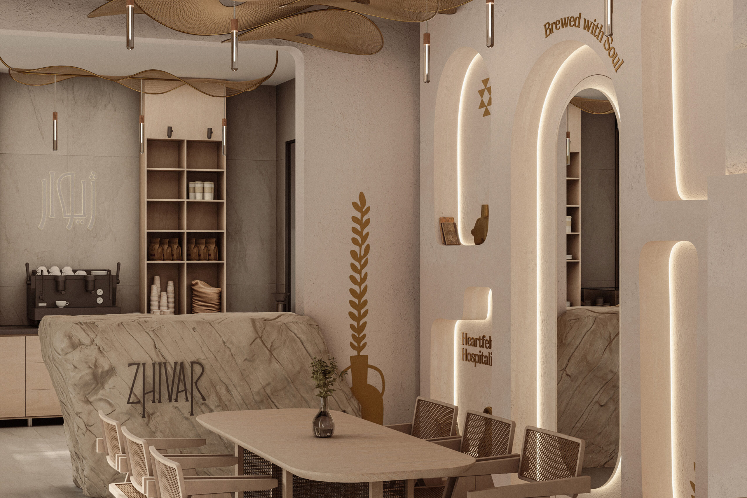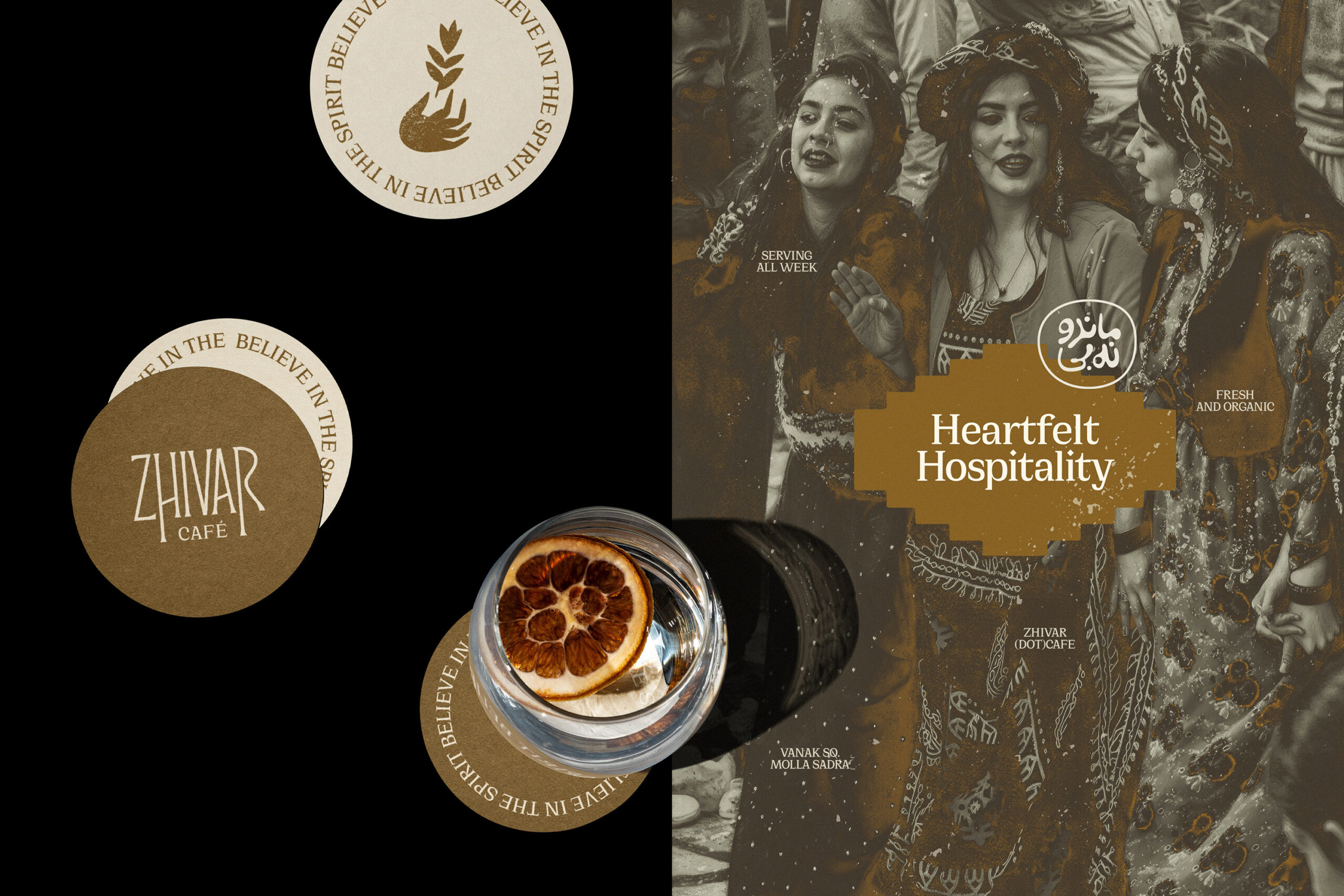 The interior design of the café was developed in alignment with the visual identity as well. With the cohesive aesthetic formed through branding and spatial design, Zhivar quickly became a popular and distinctive gathering place; one that not only provided a pleasant experience but also invited visitors to connect with the culture of the owners. In essence, Zhivar was not only a brand identity design; it was the integration of an entire value system, beliefs, traditions, and the historical memory of a culture into a core identity. Its design embraces eclecticism, combining diverse cultural references with contemporary artistic expression, making Zhivar both profoundly cultural and strikingly modern.