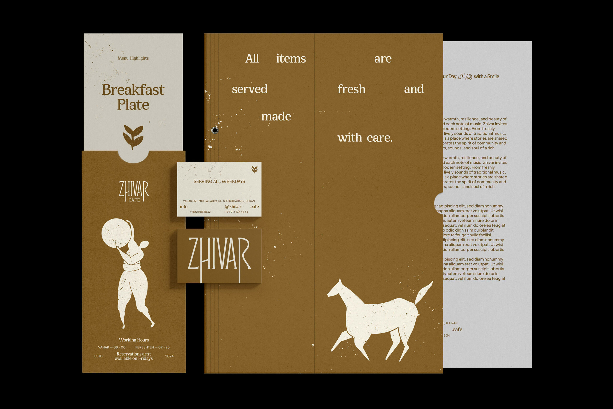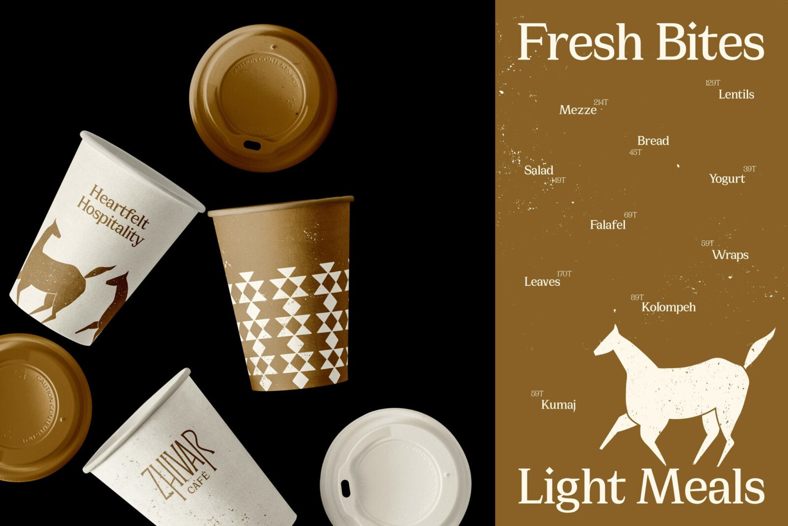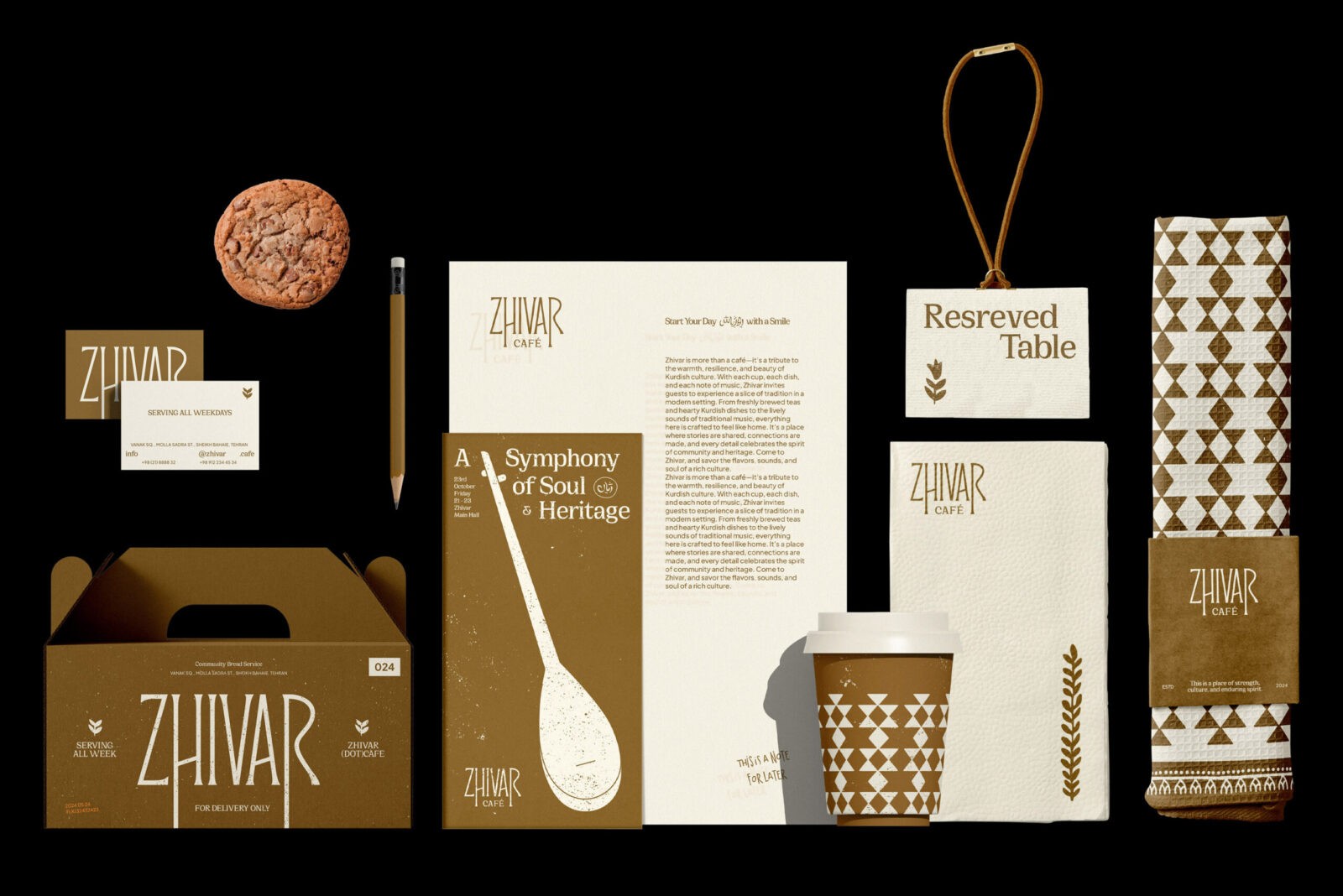 Zhivar is the name of a café inspired by the atmosphere of a specific region in Iran; one rooted in Kurdish culture. The owners of the brand are of Kurdish heritage, and they wanted their cultural identity to be reflected throughout the café experience. For the visual identity design, we turned to their Kurdish roots as well as the café’s name, which itself is a Kurdish word meaning “Life.” We studied the ancient art history of the region expressed through early engravings, pottery, local crafts, and later woven into the traditions of handmade carpets that have evolved over centuries and reached us today.