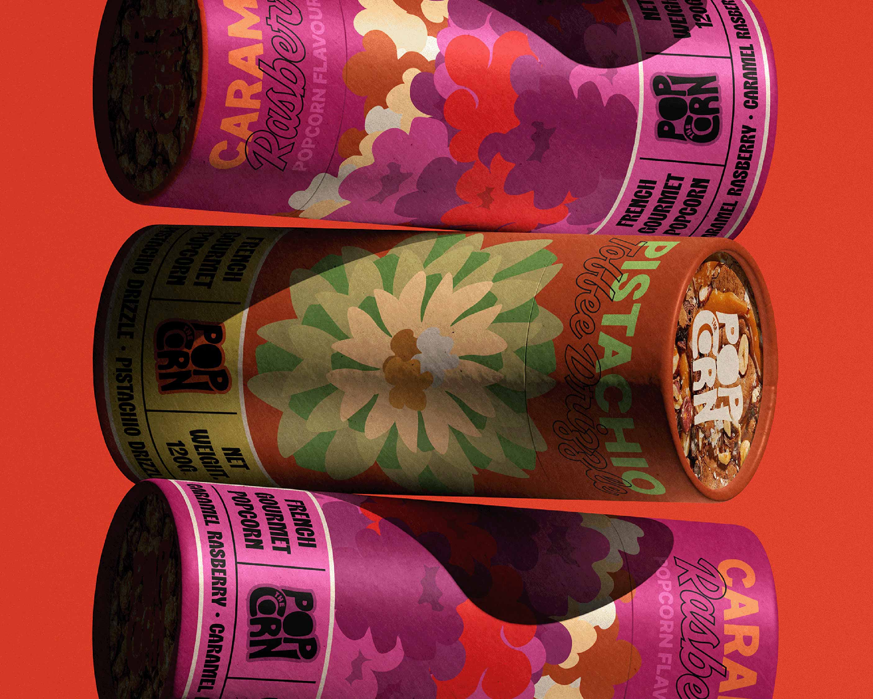 A key challenge was breaking away from the traditional popcorn formats and visual language. Most popcorn packaging relies on buckets, plastic bags, loud photography, and predictable colour schemes. I wanted PoptheCorn to immediately stand apart on the shelf, which led to the decision to use cylindrical tube packaging; a format more commonly associated with speciality chocolate, coffee, or patisserie goods. This shift alone helped reposition the product before any graphics were applied.