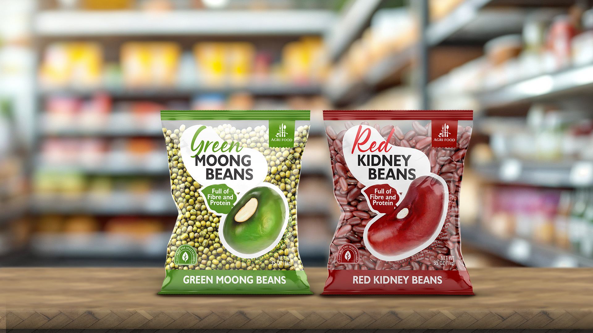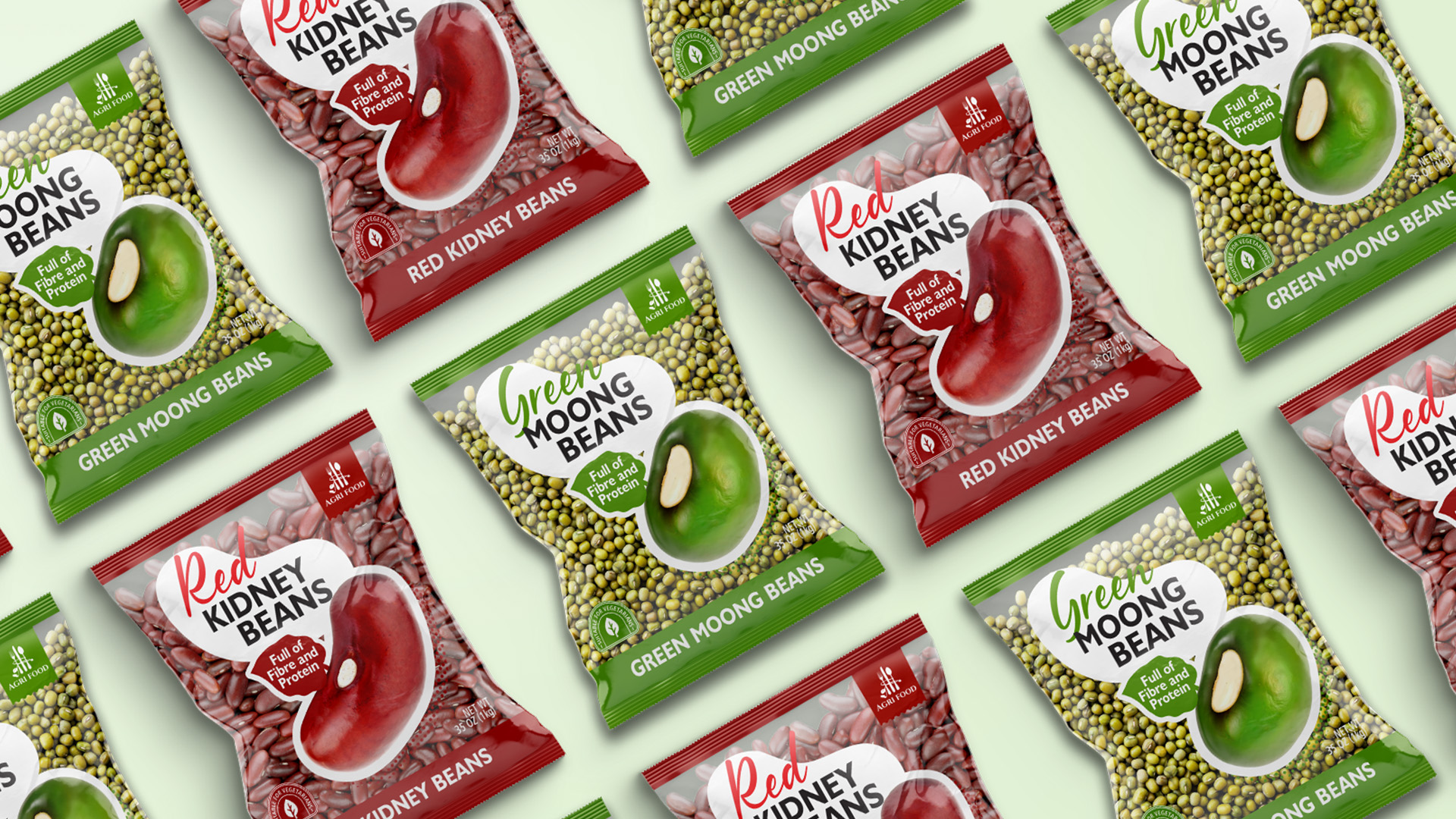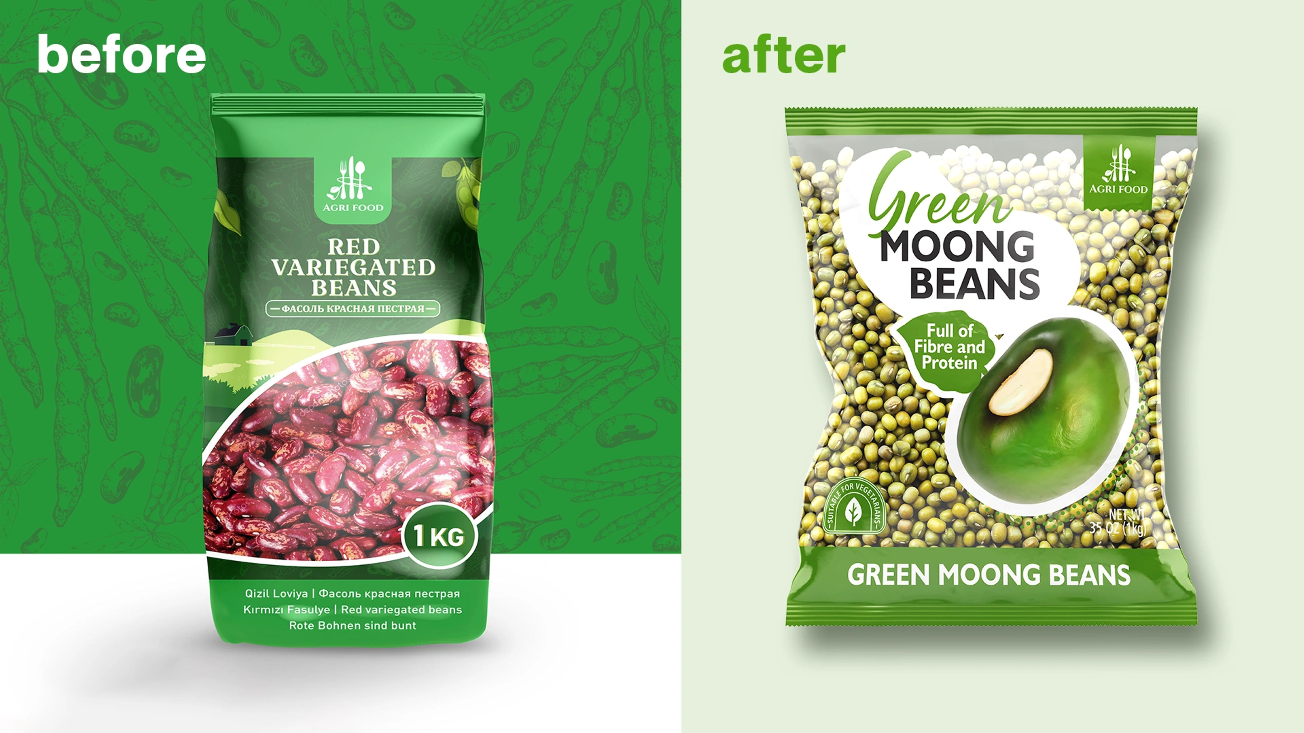 3. European-Focused Information: A soft, organic, handwritten-style font was chosen for the product name (Red Kidney Beans, Green Moong Beans) to create a natural feel. Key triggers for the European consumer (e.g., “Full of Fibre and Protein,” “Suitable for Vegetarians”) are given a prominent place and rendered in a clean, easy-to-read sans-serif font.