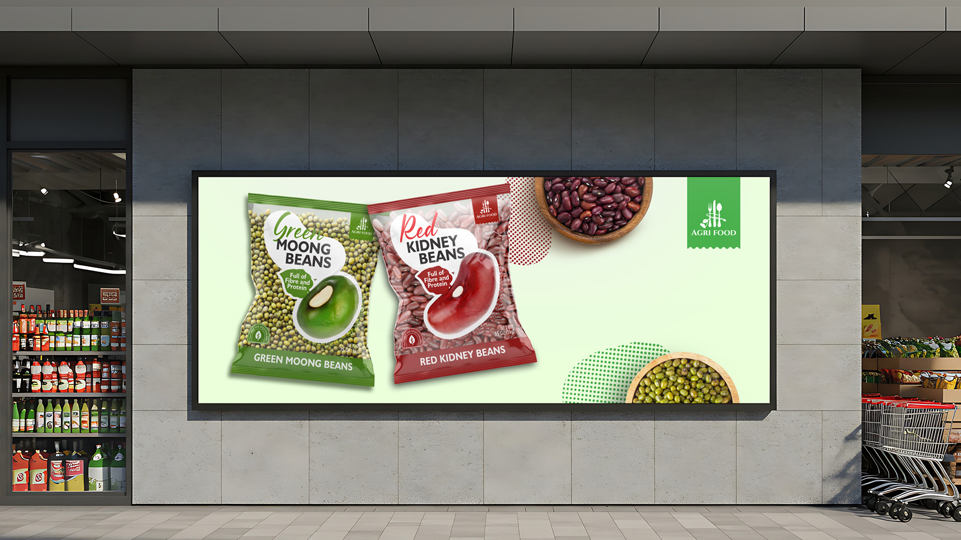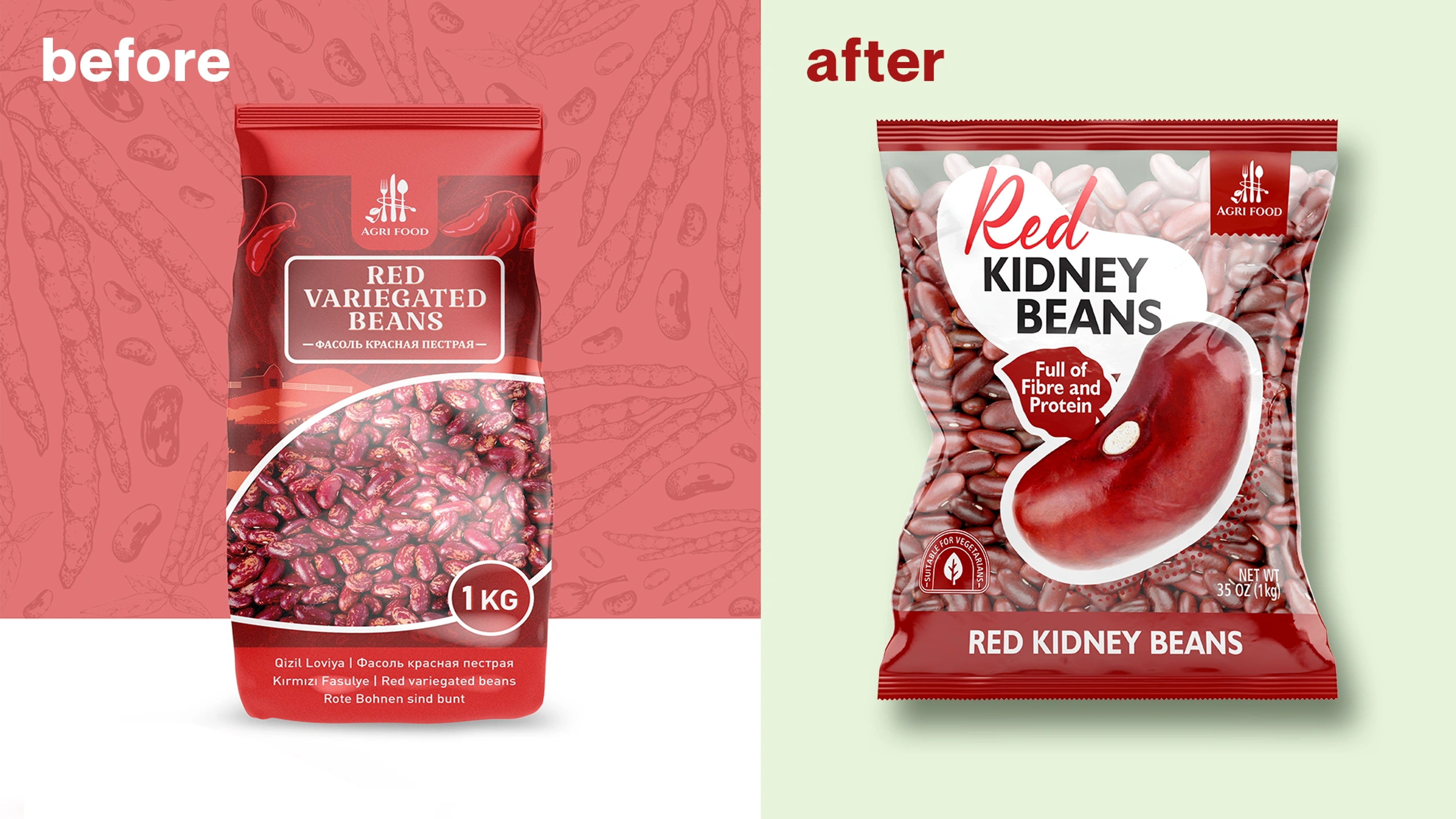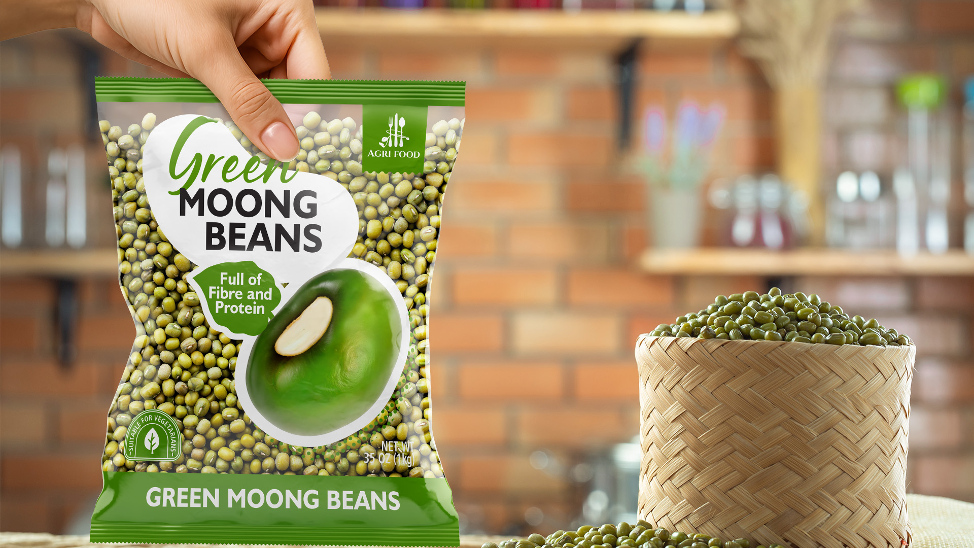 3. European-Focused Information: A soft, organic, handwritten-style font was chosen for the product name (Red Kidney Beans, Green Moong Beans) to create a natural feel. Key triggers for the European consumer (e.g., “Full of Fibre and Protein,” “Suitable for Vegetarians”) are given a prominent place and rendered in a clean, easy-to-read sans-serif font.