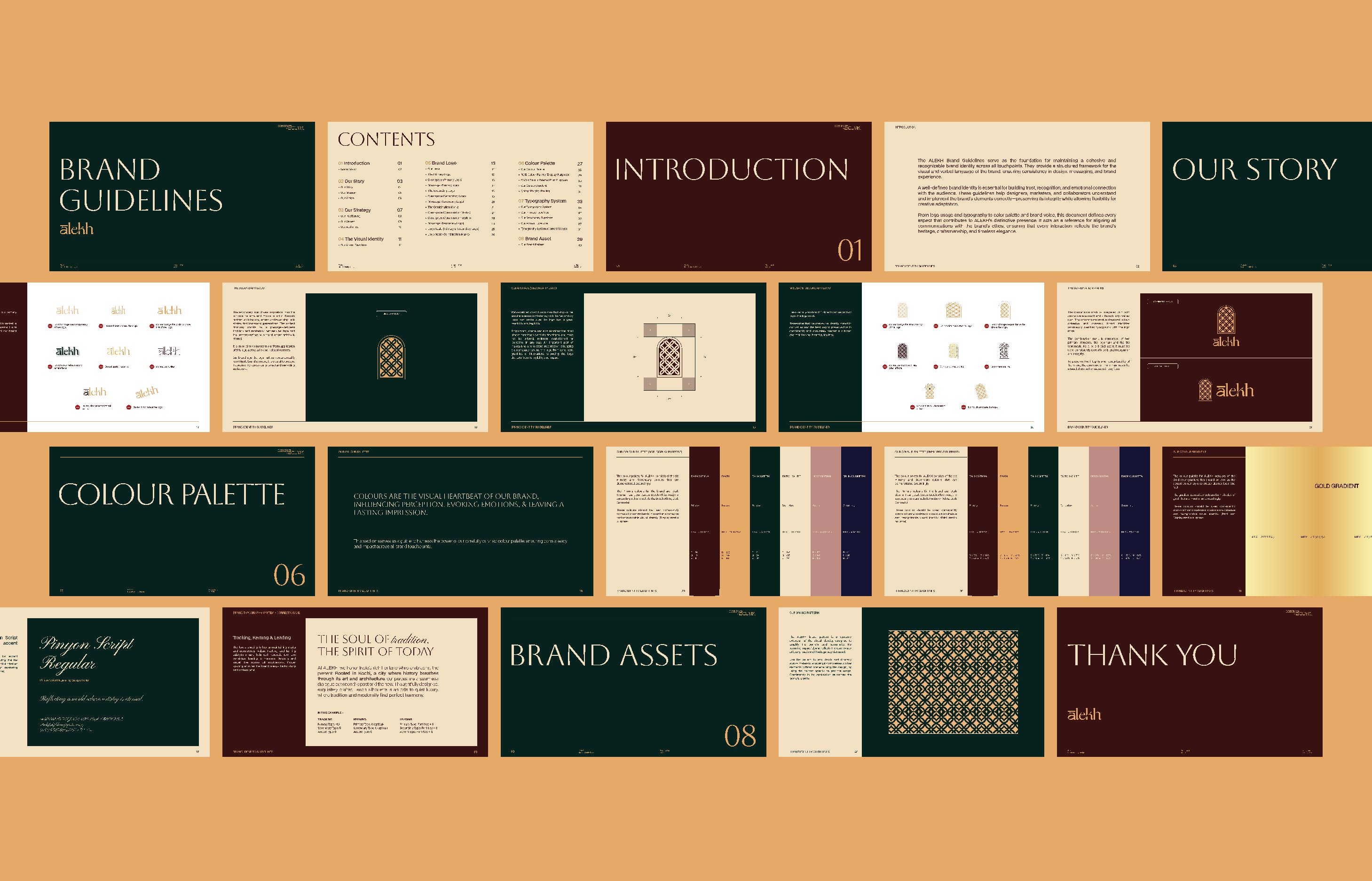 The identity draws from architectural forms and intricate detailing, translated into a minimal yet expressive visual language. The logomark, typography, and colour palette work in harmony to establish a sense of quiet luxury, creating a brand presence that feels both timeless and relevant.