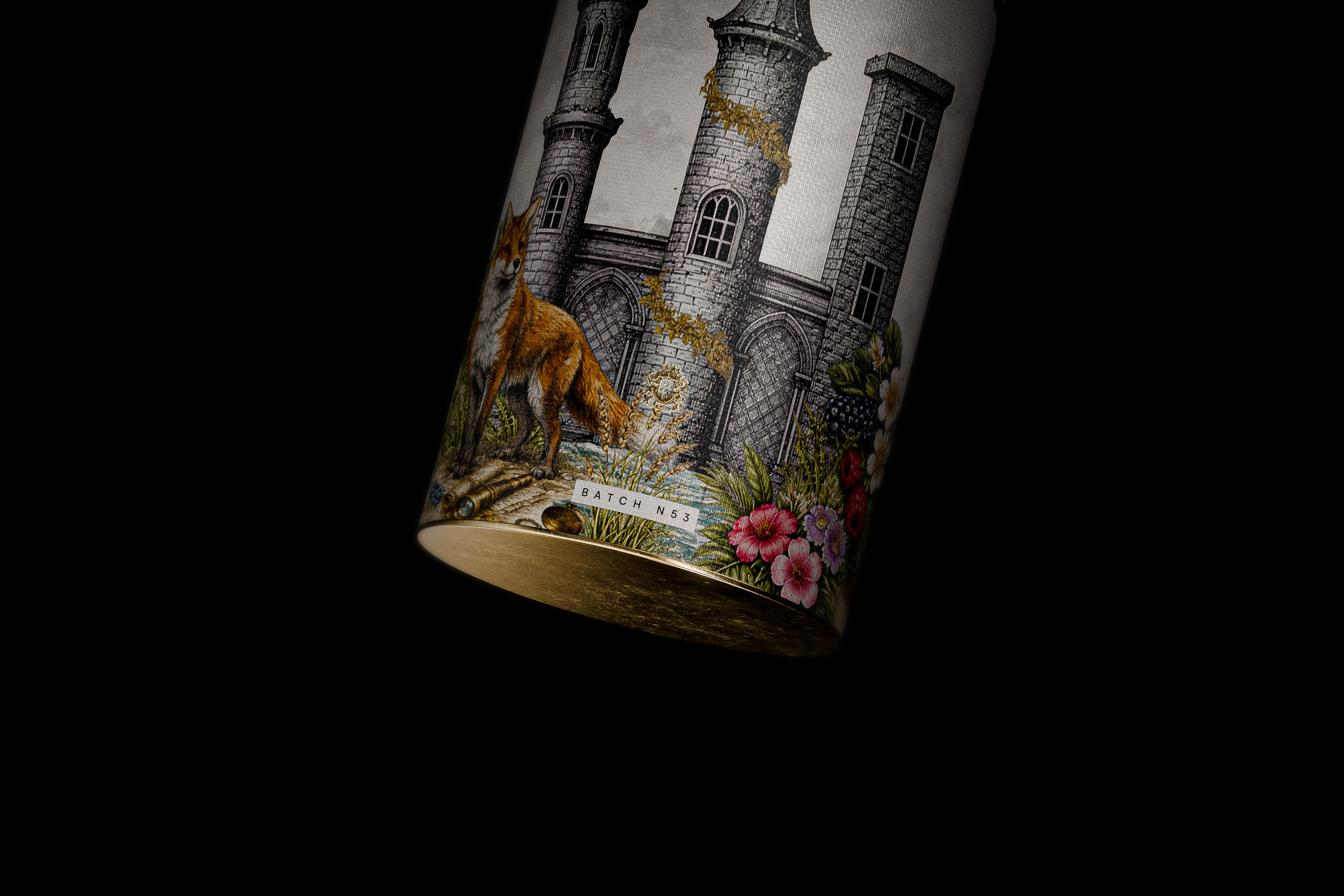 A key design decision was to place the illustrated towers at the centre of the visual language, allowing them to act as a strong symbolic anchor. Their architectural presence introduces structure, rhythm, and stability to the label, creating a sense of permanence and heritage. Surrounding natural elements are integrated more fluidly, softening the composition and adding warmth, depth, and narrative. This contrast reinforces the idea of a spirit shaped through collaboration between human intention and the natural environment.