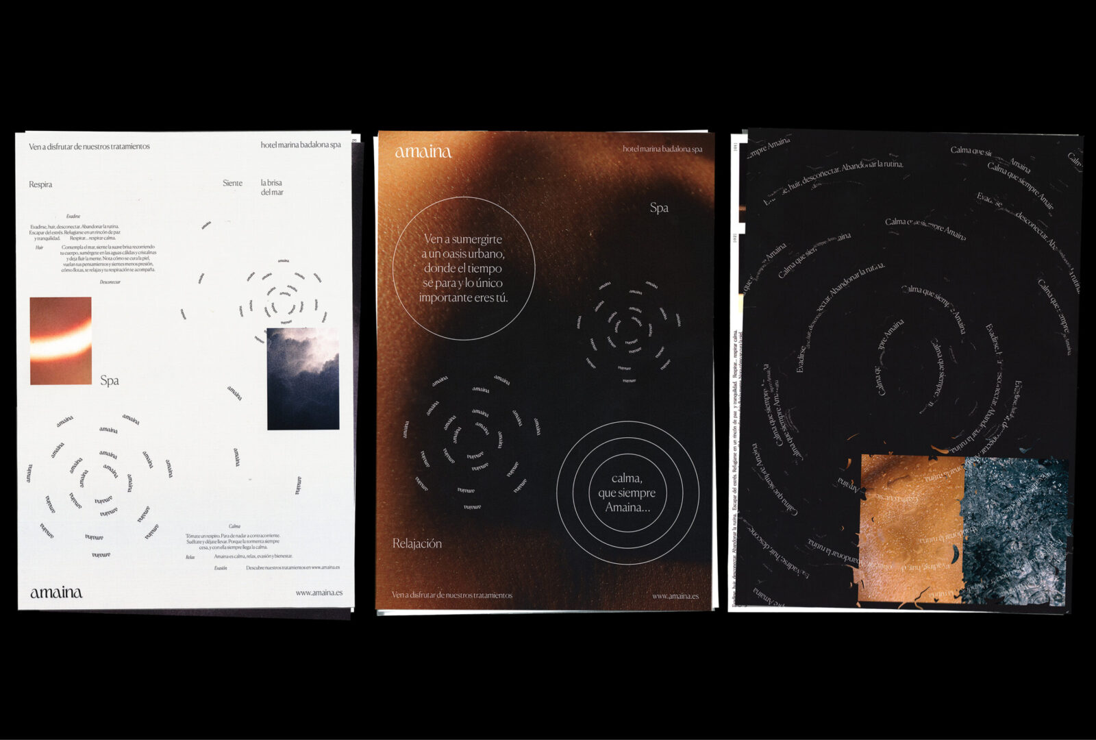 A project for a hotel, focusing on the identity of its most relaxing outlet: the spa at Hotel Marina Badalona, a work that creates an entire metaphoric universe, transporting us to an oasis of tranquility. To bring this sense of relaxation to life, we captured the calm that follows a period of stress through the concept of “the last drop of the storm.” This inspired us to create the name ‘Amaina,’ which signifies the departure of negativity and the arrival of absolute relaxation. Furthermore, we developed a visual language that replicates the sinuous shapes of a drop falling into the water, with a central tension that gradually dissipates until it completely disappears. This approach allows us to construct fluid compositions, drawing a visual poetry that evokes pure calm.