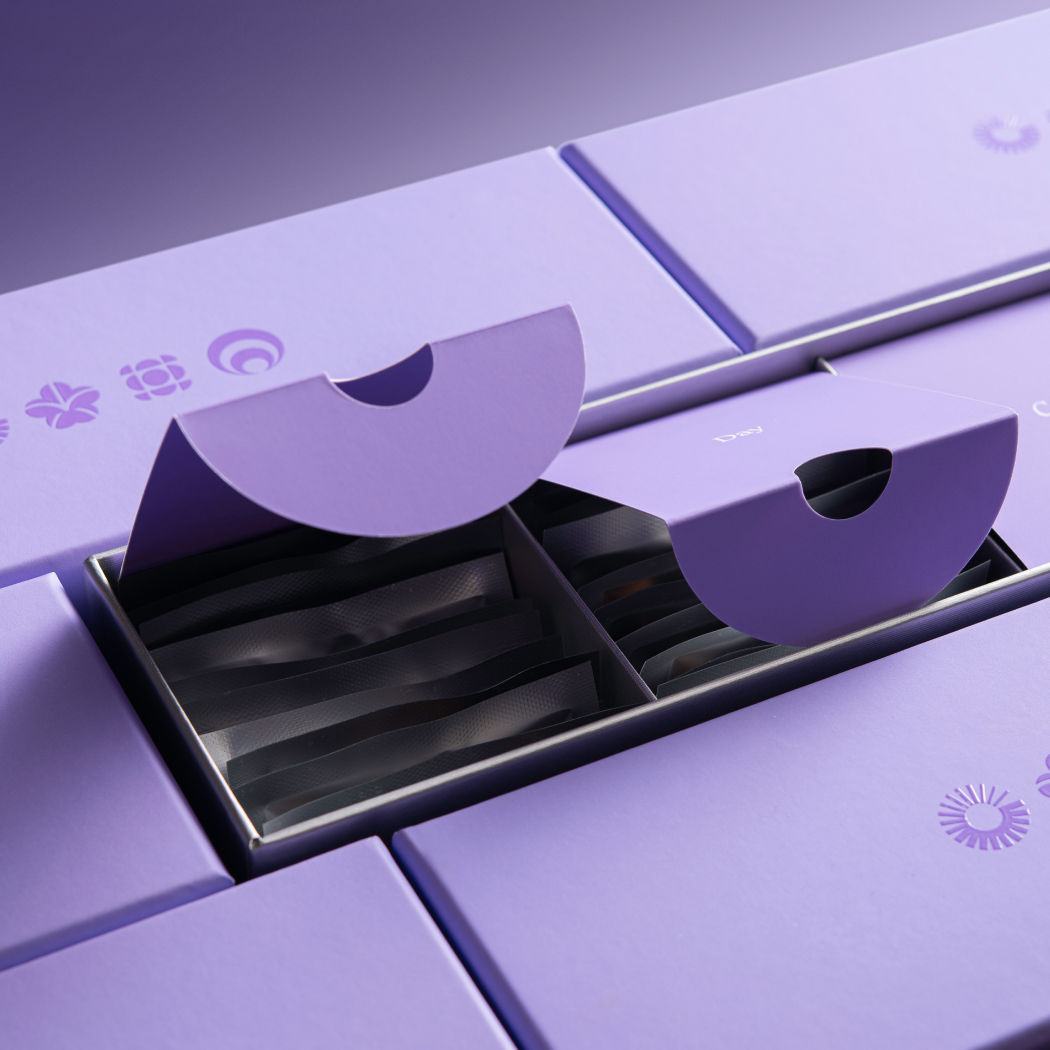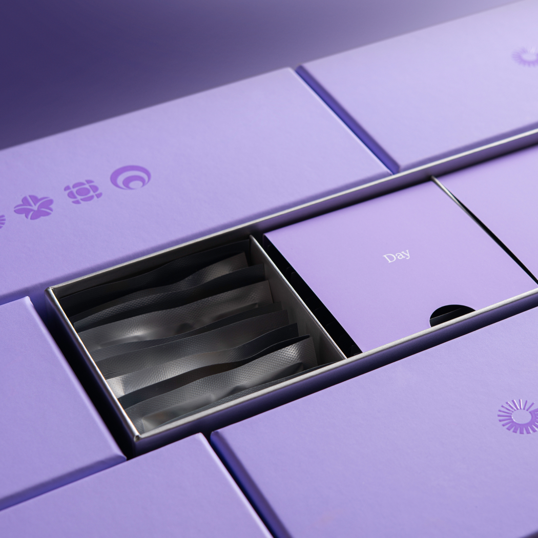 Inside the package, sachets are divided into three functional sections, each representing a ten-day cycle. This simple segmentation, clear labeling and visual hierarchy helps users track their progress and eliminates the need to count or reorganize supplements manually. Every ten days, users encounter a refreshed unboxing moment as they transition to the next section of sachets. This repeated micro-experience reinforces engagement and transforms supplement use into a small but meaningful ritual.