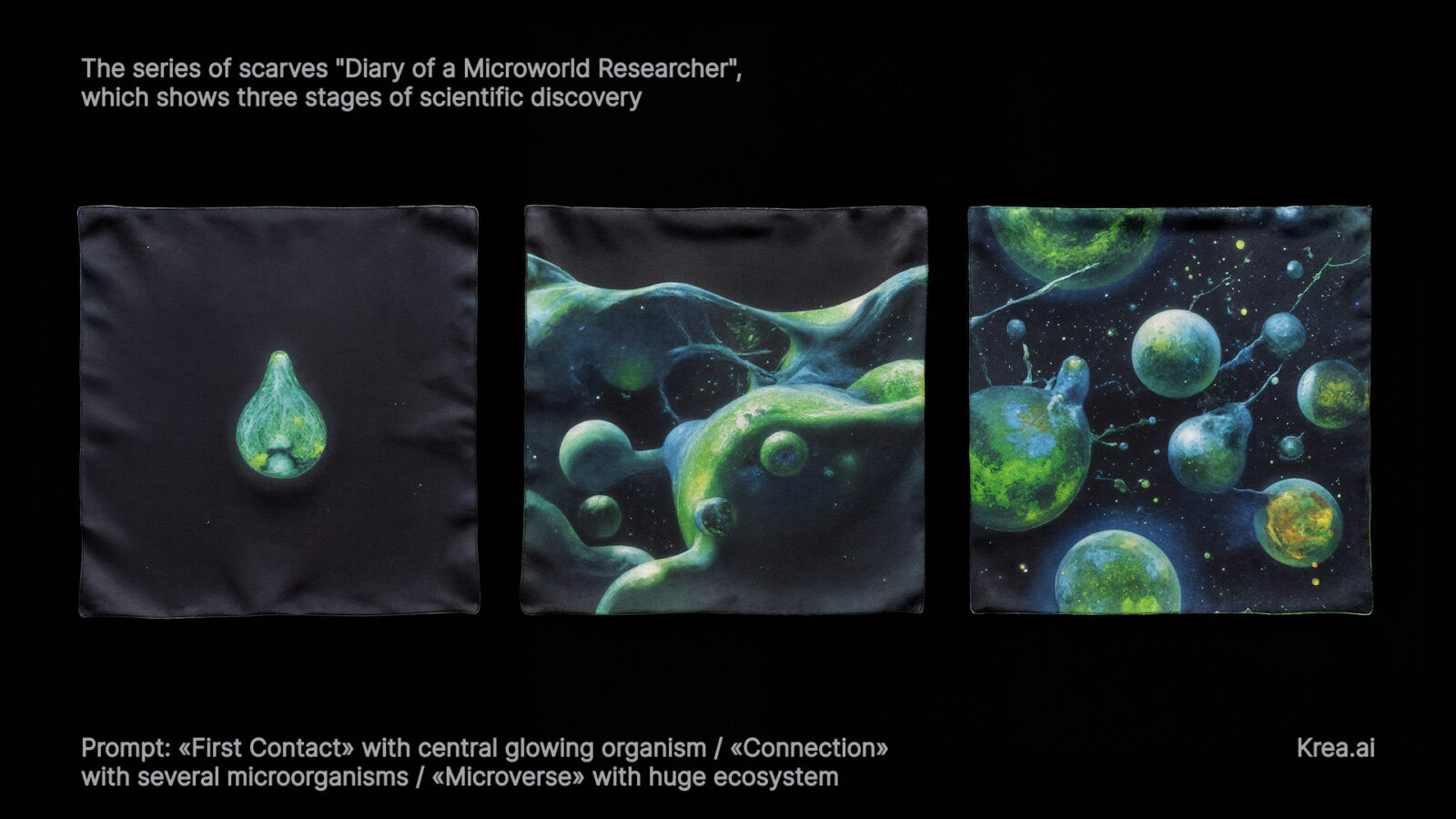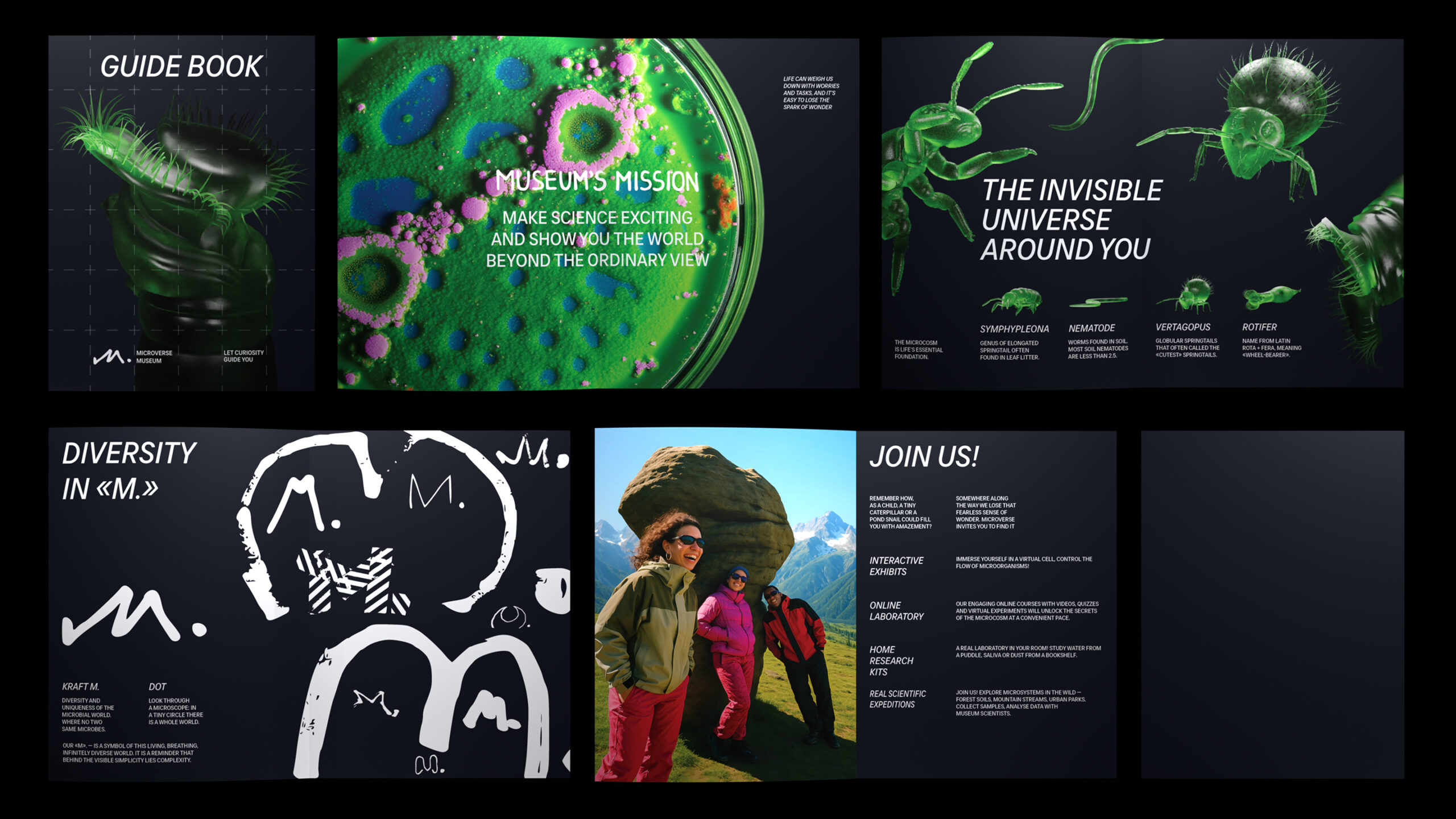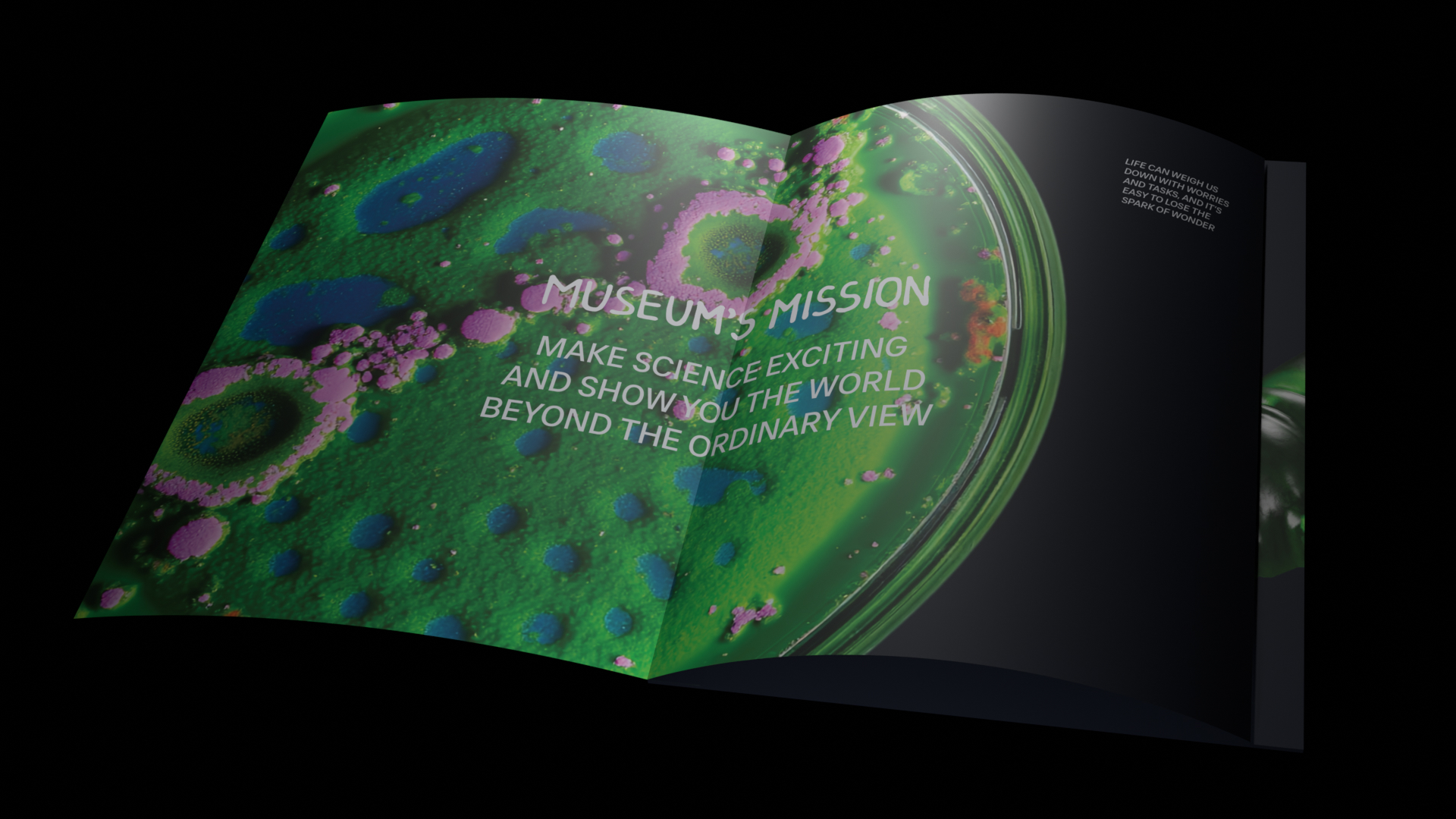 That’s why I came up with the concept of a museum where engaging and accessible science is showcased through interactive exhibits, state-of-the-art simulators, microscopes, and scientific expeditions into real ecosystems. The mission of this museum is to make science exciting. I aimed to convey a tone that blends scientific depth with a spirit of adventure, evoking themes of exploration, personal growth, and inspiration from nature. The identity concept is called “the universe of the micro world.” I created 3D models of microorganisms in Blender, used TT Interphases Pro to ensure scientific accuracy, and incorporated handwritten labels to bring the life of microorganisms to life. The identity features a variable symbol with a dot, which also serves as the logo, reflecting the endless diversity of microorganisms. I also used a neural network in my work. Krea.ai To make a video that tells about the mission and the museum itself, both pictures and a voice are generated there, which accompanies the viewer throughout the narrative.