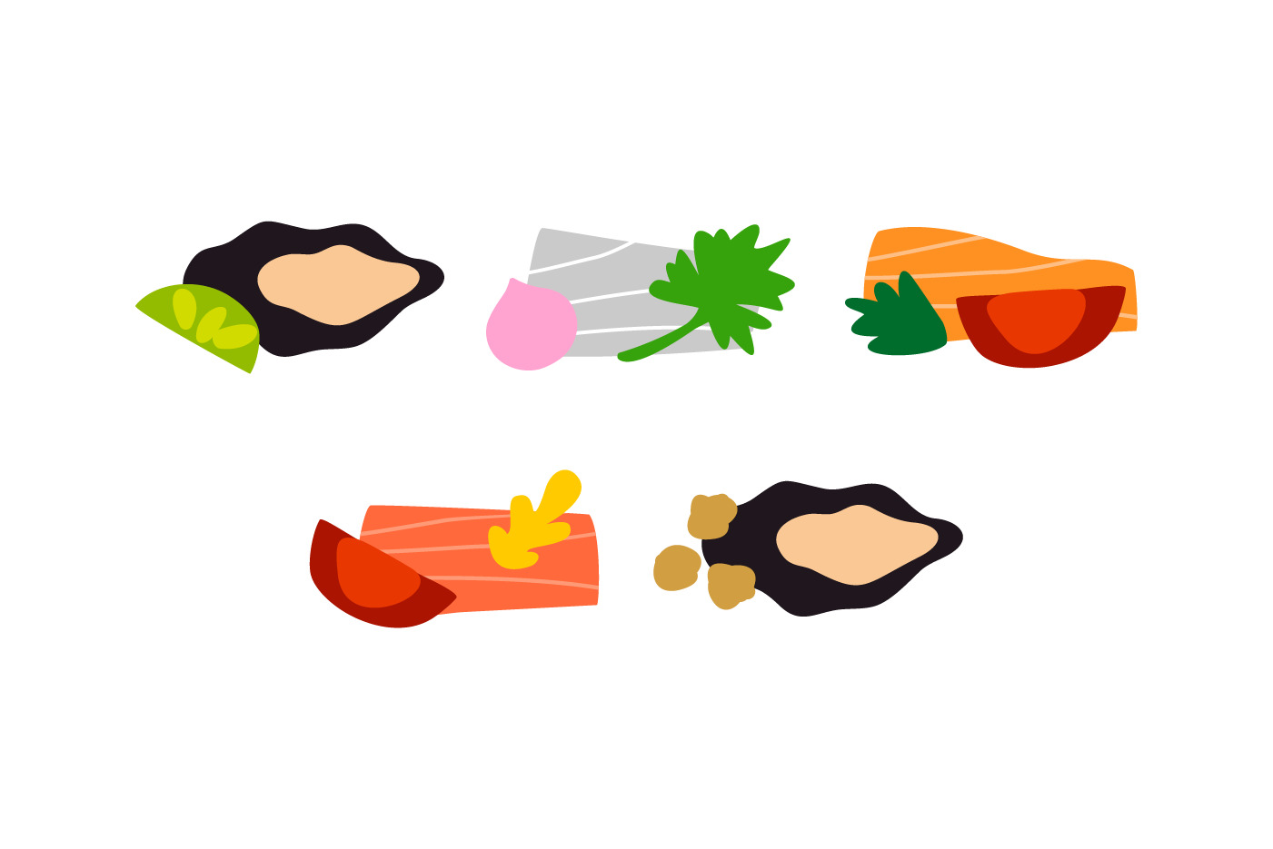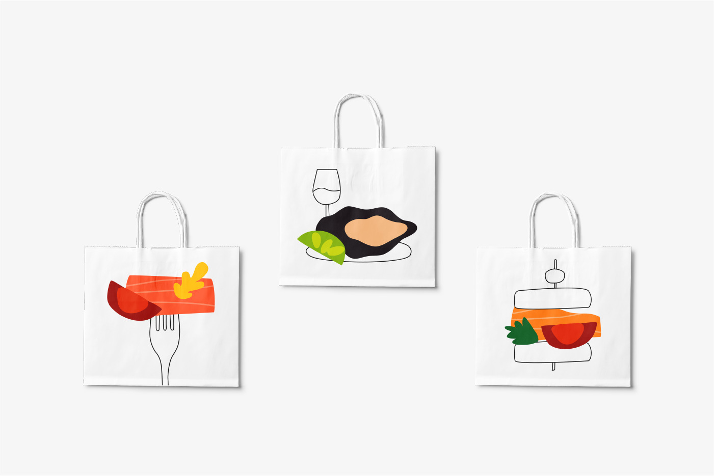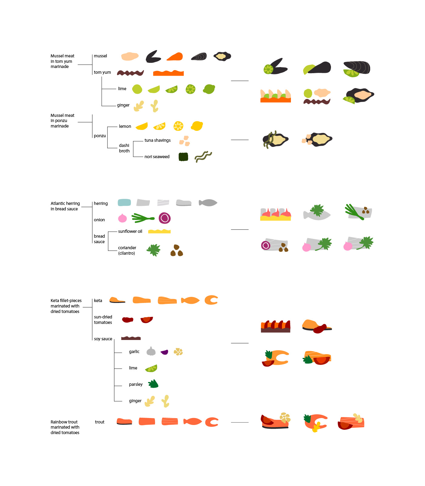 At the beginning of the work, when I received documents describing the composition of dishes, I chose the most interesting and essential ingredients and divided them into groups. I assigned each ingredient its own color and shape. If some products were duplicated, I used one image. Thus, I created a kind of product coding. Further, I began to collect compositions from the received elements.
