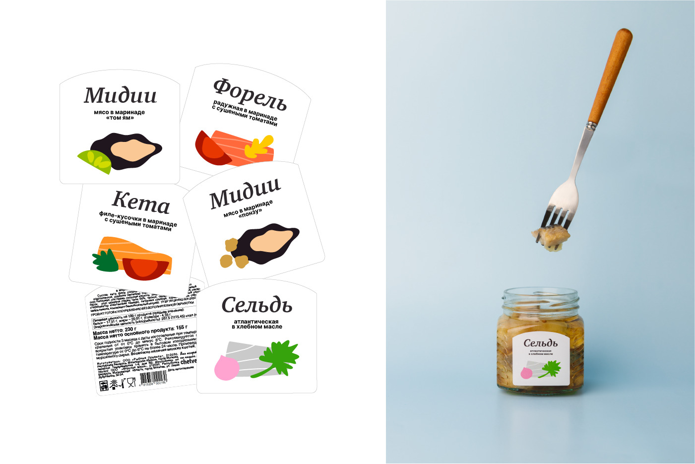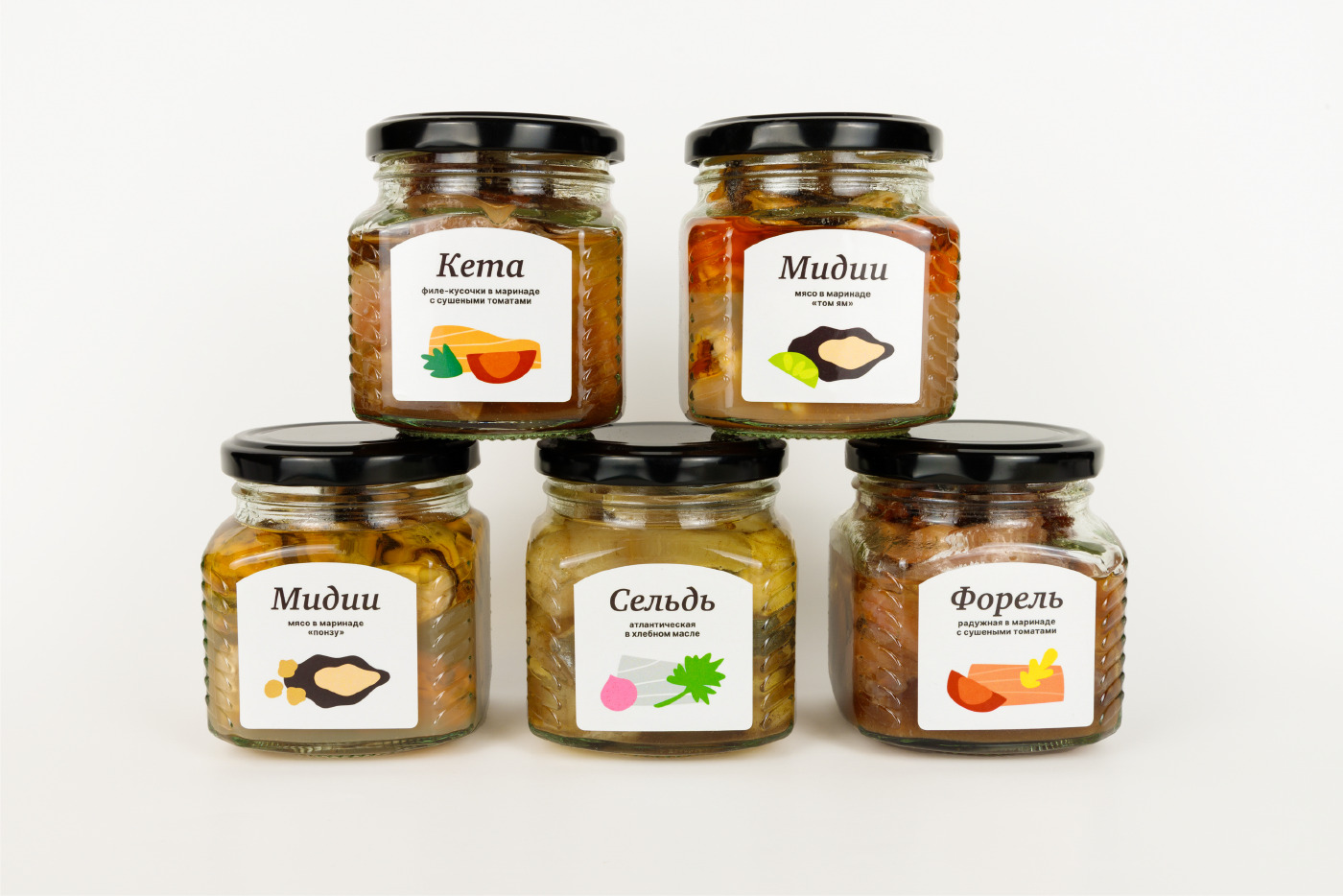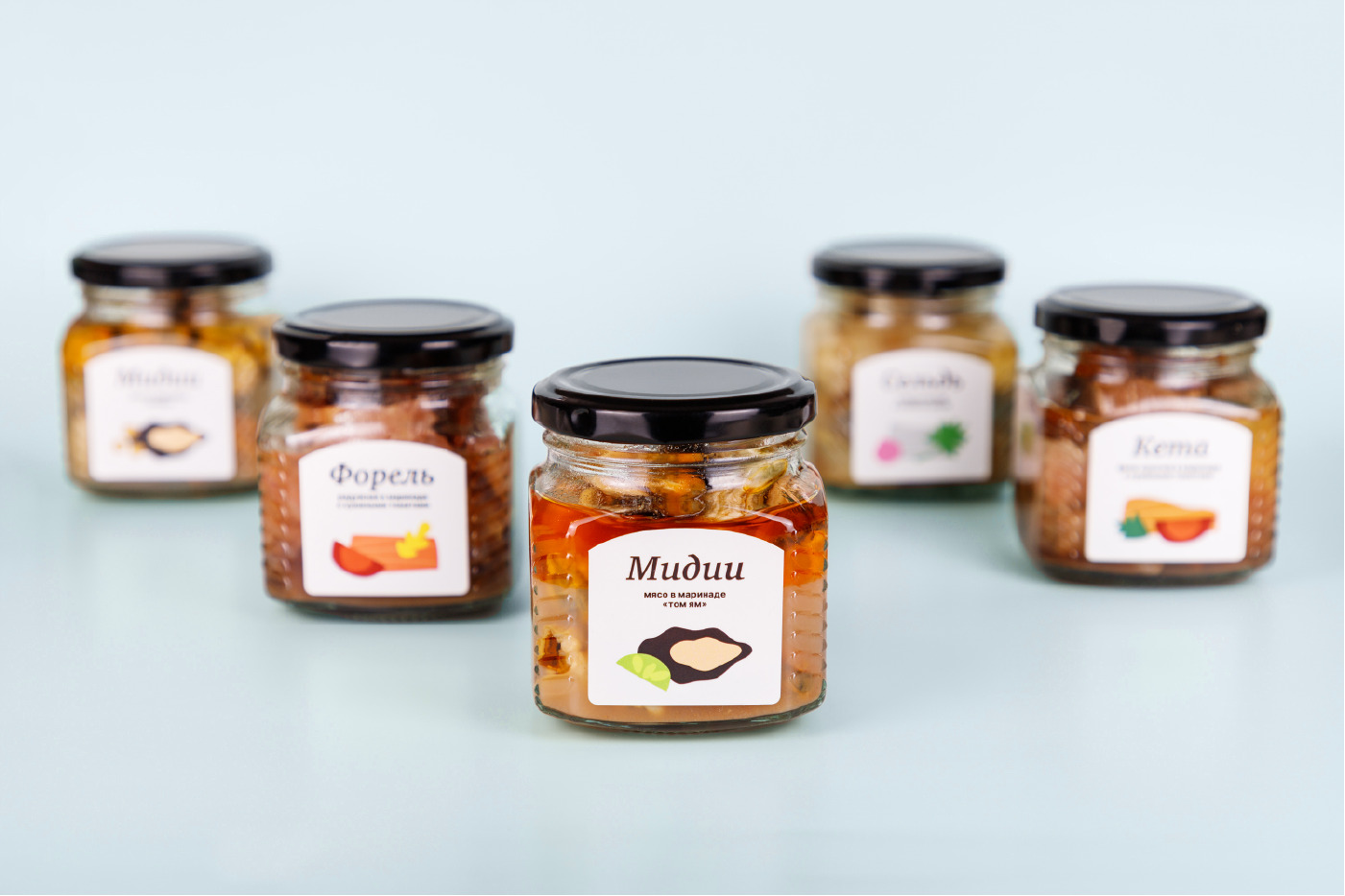 The line of preserves consists of five flavors individually created by a freelance chef for the shop ” Chetverg”. The style of the store is quite dark, black color prevails. However, the design of the preserves label is significantly different. It is light, bright and minimalistic. Here are some reasons why the design is different. Firstly, the full assortment of the store is either finished products from manufacturers from different countries or packaged in-house. Preserves, on the other hand, are an individually assembled mix of fish products, sauces and other ingredients, subjected to special processing (preservation) and completely ready for use. Preserves are made in the store’s own production. Therefore, the task was to make the product line different from other products. To convey the uniqueness of the composition, purity and quality ingredients. Secondly, most of the ingredients are somehow related to Asian cuisine. In addition to fish and seafood, ponzu sauce and soy sauce are used, which belong to Japanese cuisine, as well as tom yum, a national dish of some countries in Southeast Asia.