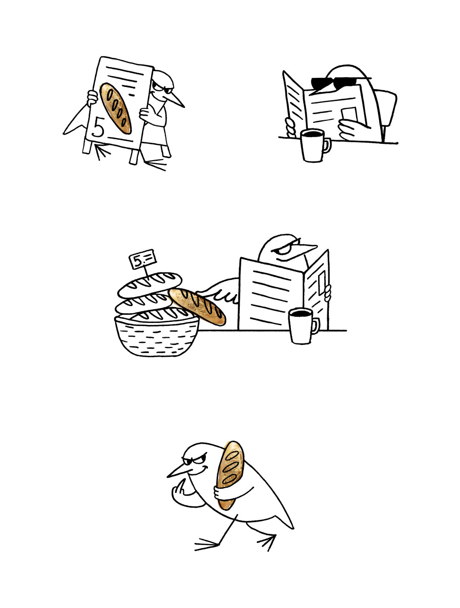 The central hero of Snook’s universe is a bold and mischievous bird thief — a charismatic mascot that defines the entire identity. This cheeky character “steals” fresh loaves right from under your nose, turning a simple purchase into an entertaining moment. The bird is not just a logo element; it is the driving force behind the storytelling, bringing humor, movement, and emotion into every touchpoint of the brand.