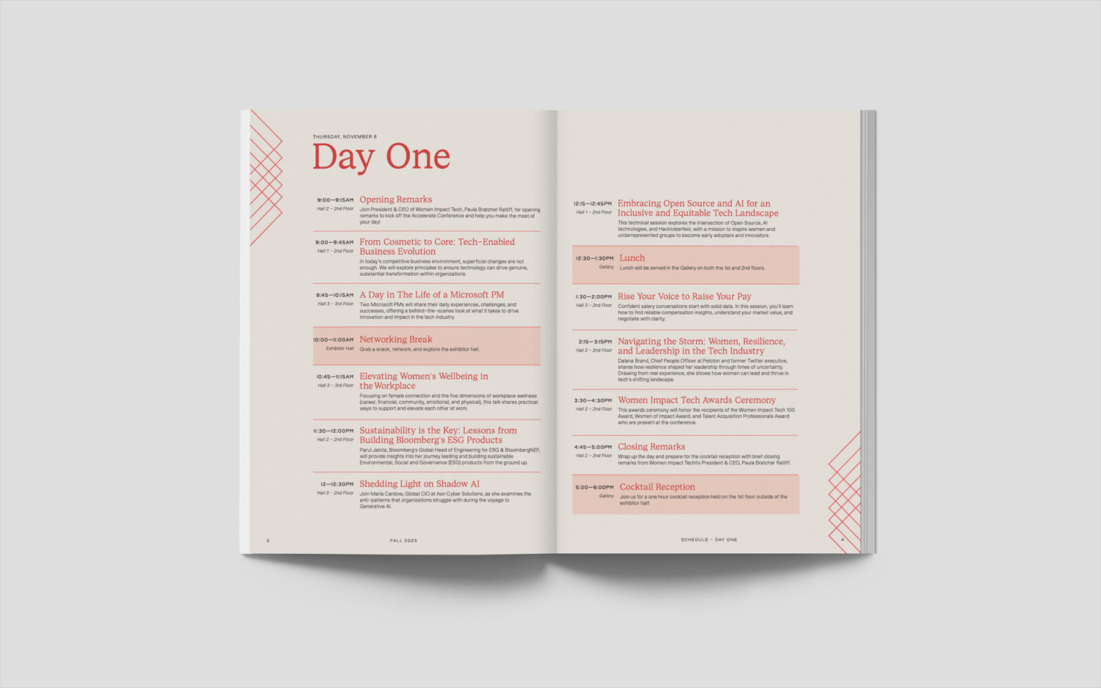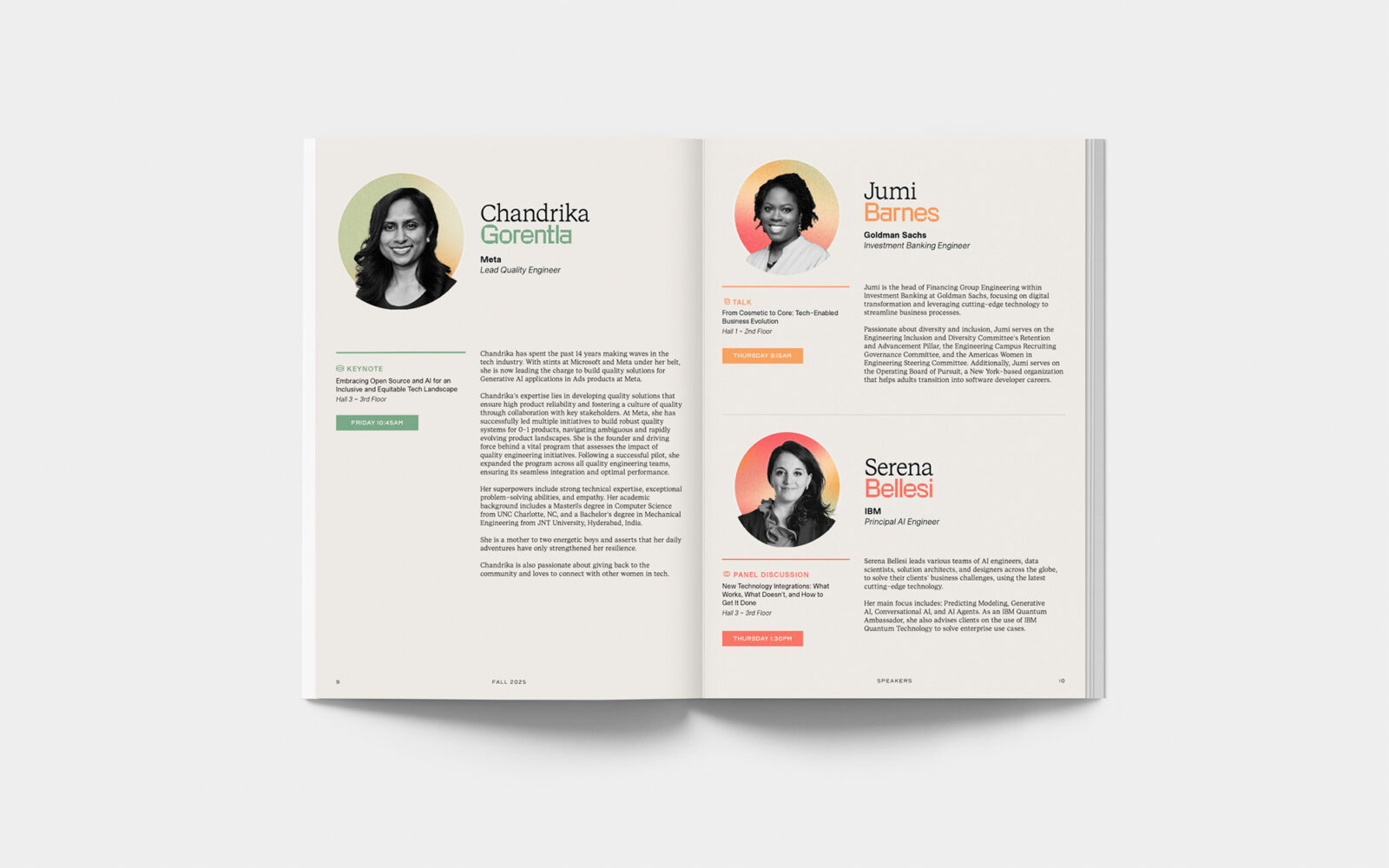 The typographic system is clean and contemporary, balancing the dynamic visual elements with clarity and professionalism. Type scales and spacing choices help organize dense information in a way that is easy to navigate and visually inviting. The design aims to meet attendees where they are by presenting content in a structured yet energizing way that supports focus and accessibility.