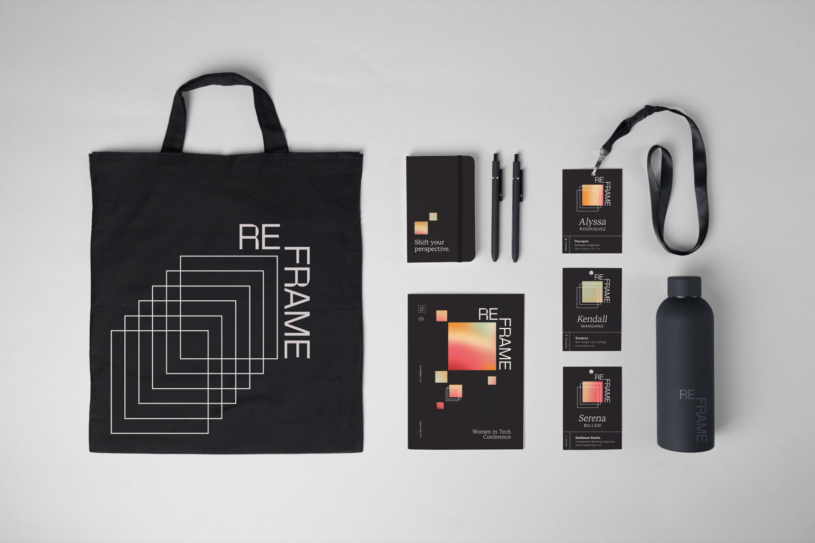 Together, these elements create a brand that is bold but welcoming, innovative but grounded. Reframe positions itself as a catalyst for new ideas, connecting women in tech through design that reflects clarity, momentum, and possibility.