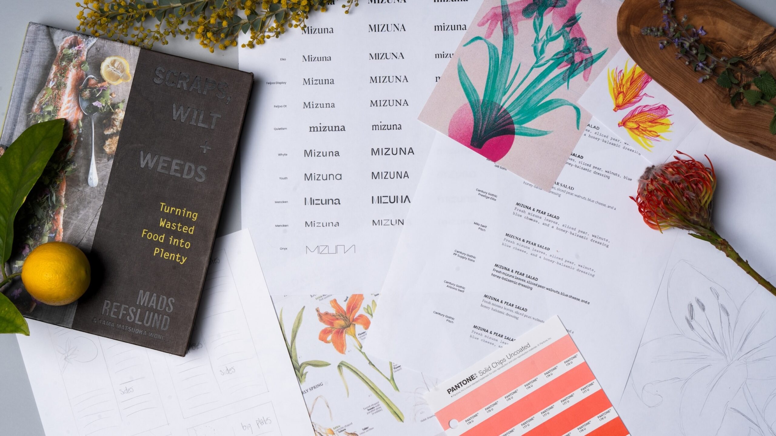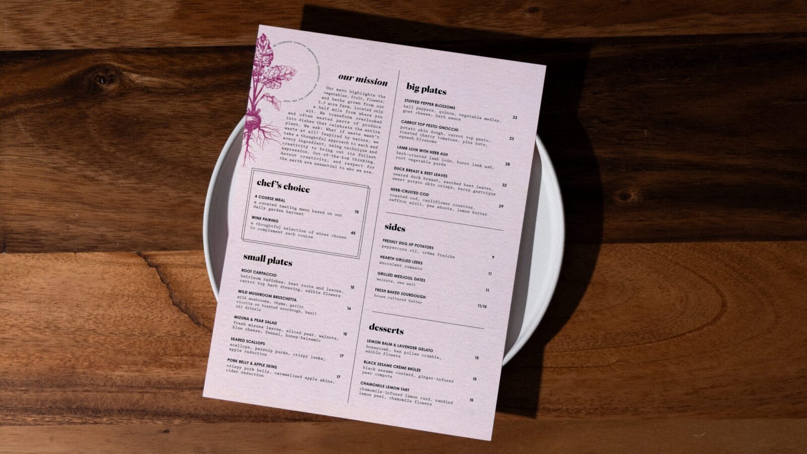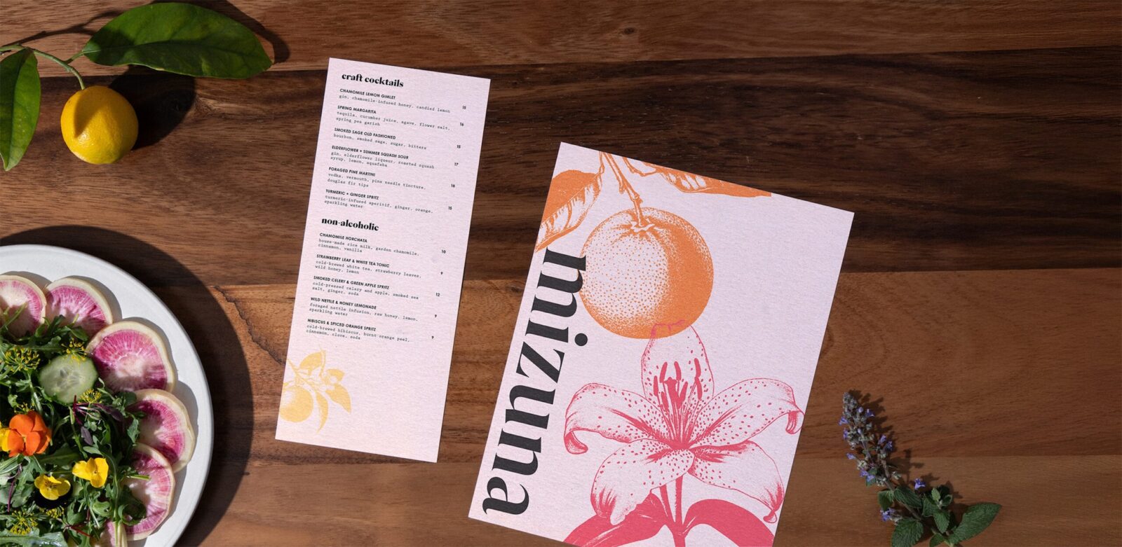 The visual identity reflects the same mindset. It is layered, organic, and built with intention. The palette is sun-washed and inspired by just-picked produce. Warm reds from beets. Soft greens from herbs. Muted yellows from citrus and flowers. Everything feels fresh yet grounded. Botanical illustrations flow across the system in translucent layers. They echo the way flavors overlap in a dish. They also suggest an ecosystem where nothing is wasted. Every piece interacts with another.