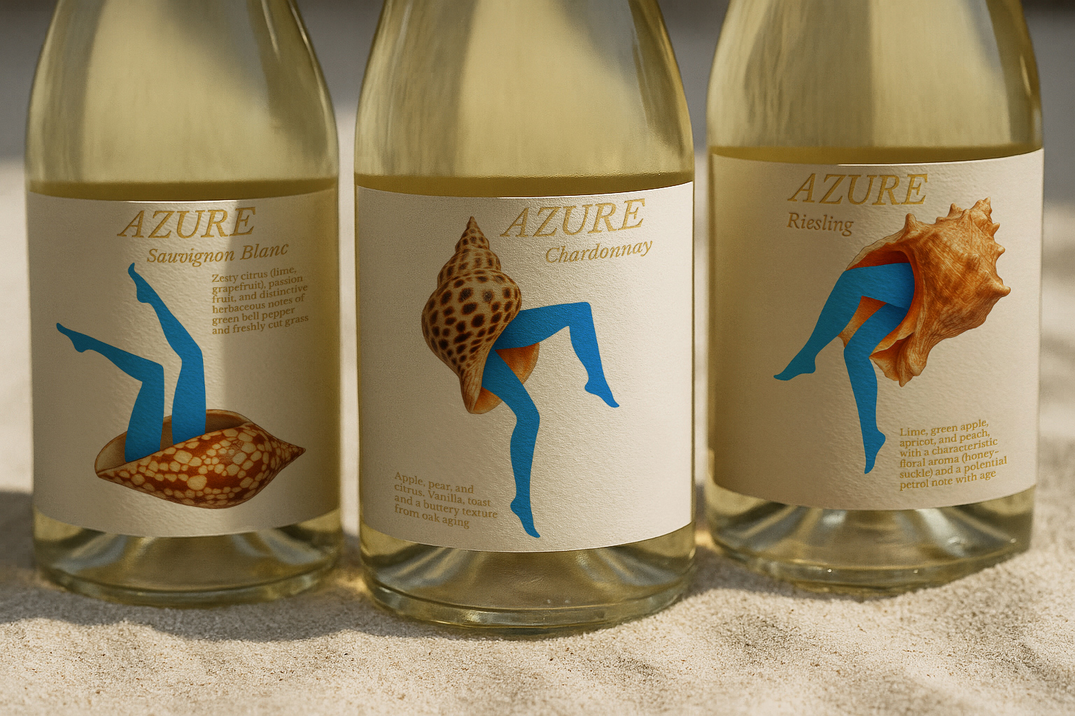 • Keywords: Sea, shells, summer, wine, packaging design, graphic design