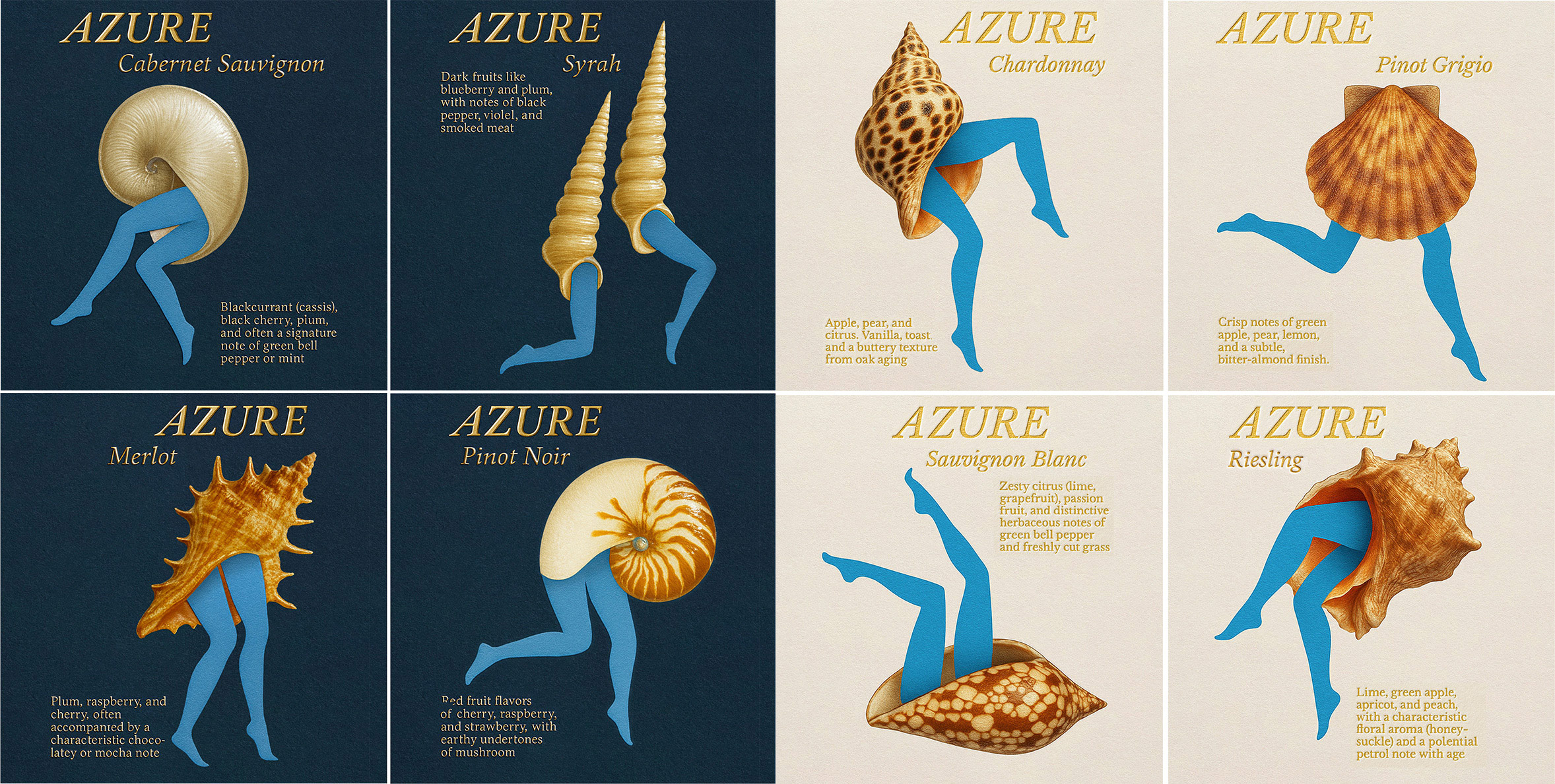 Azure features two wine collections: a white and a red. A light mother-of-pearl shell conveys freshness, coolness, and purity of taste, perfectly matching the character of the white wine. A warm, terracotta-colored shell symbolizes energy, depth, and warmth, reflecting the rich and expressive nature of the red wine. Together, these designs create the atmosphere of a southern evening filled with sun-warmed air, sea breeze, and intense flavors.