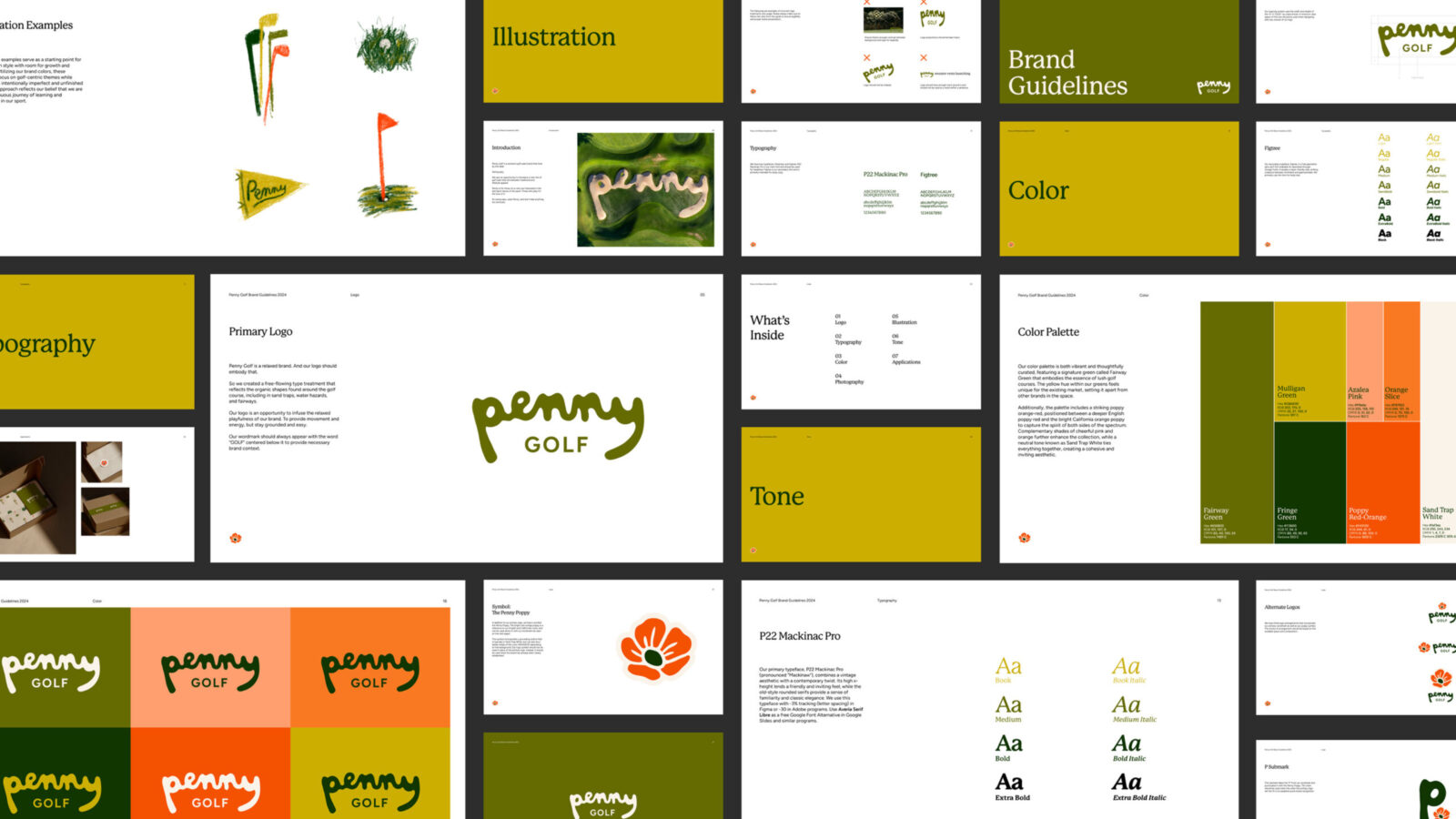 The branding is also an homage to the brand’s namesake, Penny, a golden retriever with a famously relaxed demeanor and a fondness for riding in the golf cart. Her spirit helped steer the tone of the entire system. The identity had to feel like her: warm, grounded, and a little mischievous.