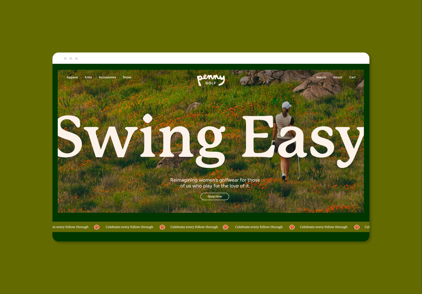 Penny Golf reimagines the course as a space for connection and comfort. This is golfwear that moves with you, branding that draws you in, and a logo that carries just enough curve to remind you not everything needs to be straight down the middle.