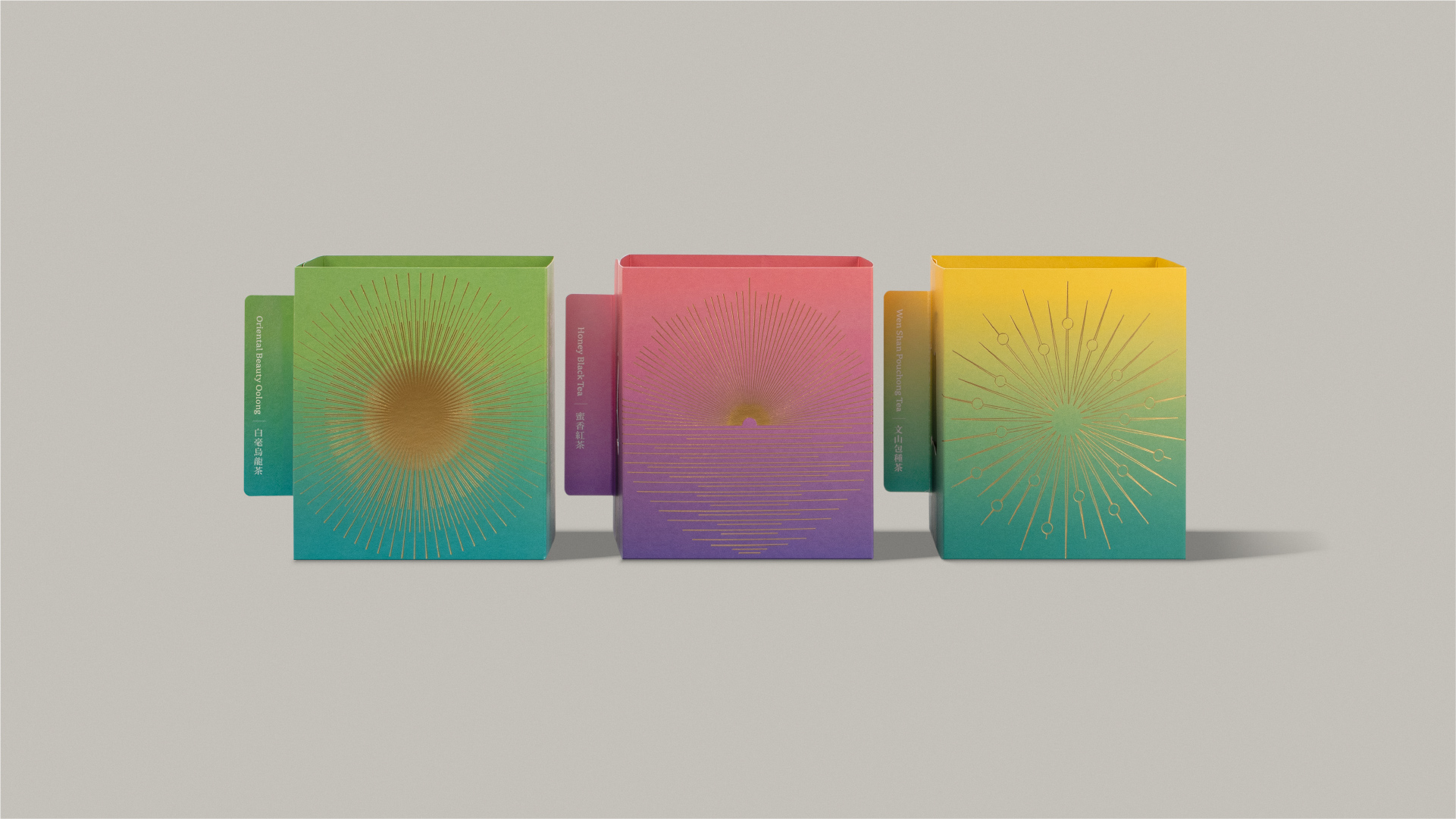 Based on the meaning embedded in the brand name, the identity translates the imagery of the sun into a central visual motif. The logo combines references to mountains, roof tiles, and morning light, reflecting both the tea’s mountain-grown origin and the calm ritual of beginning a new day. A palette of rice grey and warm orange establishes a clean and approachable tone, while colour coding and gold-foil textures distinguish tea varieties and build a consistent product hierarchy across the range.