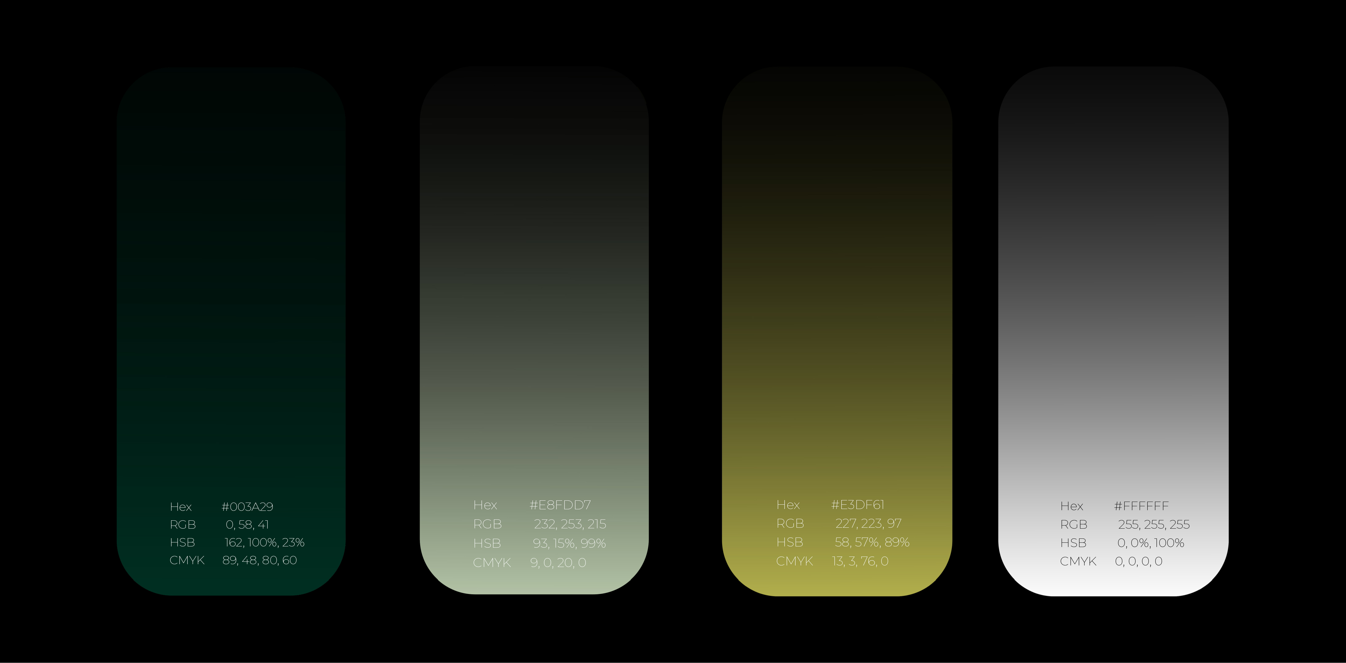 The color palette—composed of soft green, mint, white, and black—was selected to evoke an atmosphere of inner peace and clarity. Green and mint tones bring freshness and balance, while white introduces purity and openness. The use of black grounds the design, adding contrast and depth that enhances the overall harmony. Together, these colors form a visual language that soothes the viewer while maintaining a refined, modern presence.
