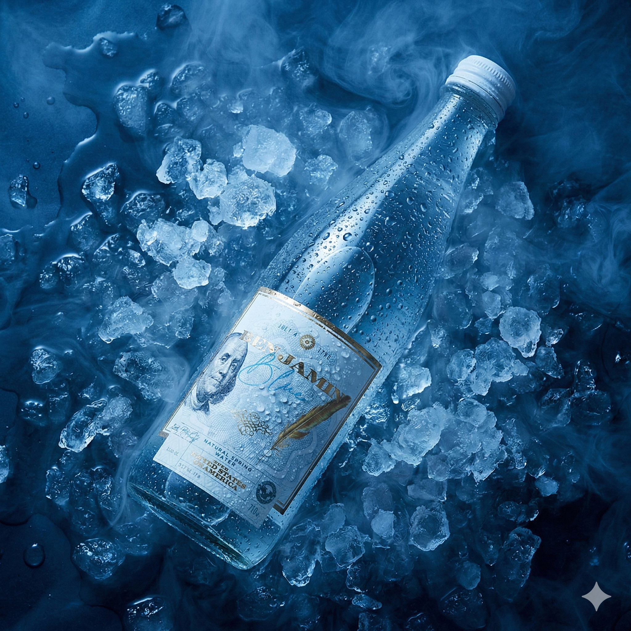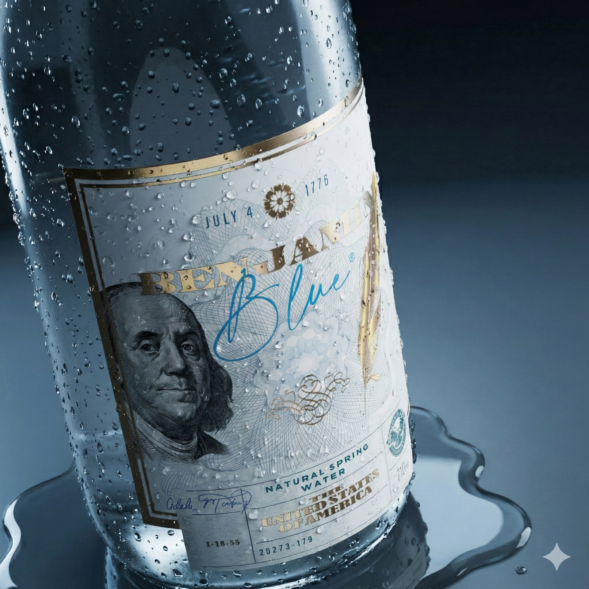 The Benjamin Blue label draws inspiration from historical documents and security printing aesthetics, engravings, guilloché patterns, signatures, and seals, reinterpreted through a contemporary lens. Every element serves a strategic purpose: to convey authenticity, authority, and trust, three critical brand assets in a highly commoditized category such as bottled water.