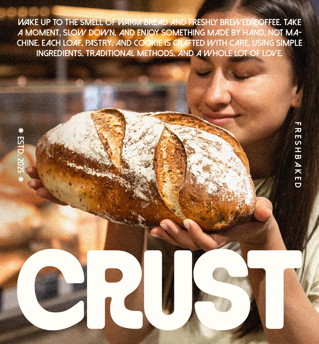 More than visuals, Crust’s brand identity tells an emotional story. It celebrates the slow art of baking and the joy that comes from sharing something real. The identity was built to create a moment of pause in a busy world — a reminder that good design, like good bread, takes time. Each customer interaction, whether online or in-store, is designed to feel personal, grounded, and genuine. Crust isn’t just about baked goods; it’s about connection, creativity, and community. Through this thoughtful visual identity, we’ve given Crust a face that feels human, a voice that feels kind, and a presence that endures.