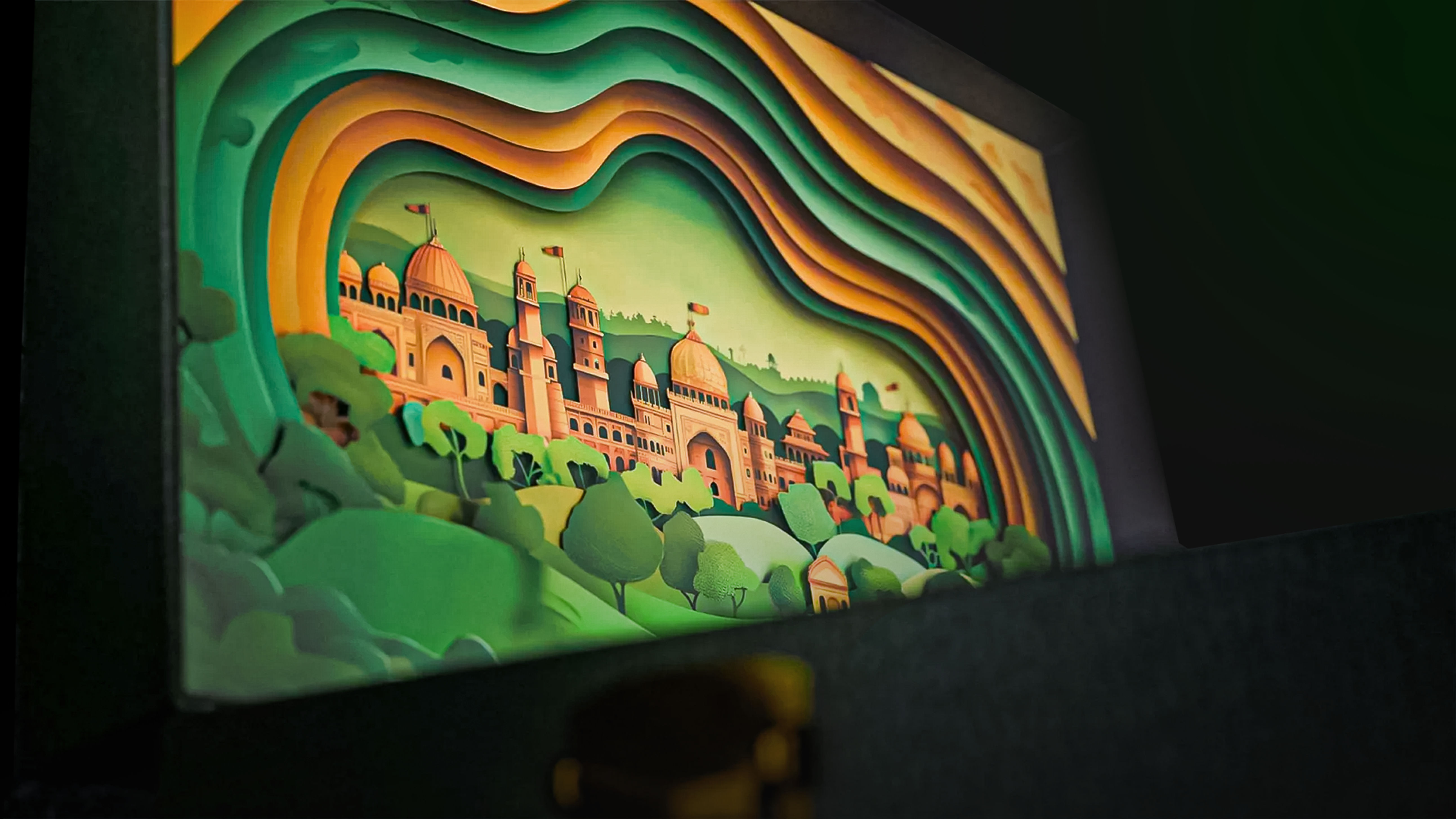 We delved into the world of miniatures, poetry, and architecture of the Babur era, and studied his personal records and interests (for example, his love for gardens and flowers). The richness of Eastern stained-glass (colored patterned glass) art and its ability to refract light, creating a magical atmosphere, became our key finding.