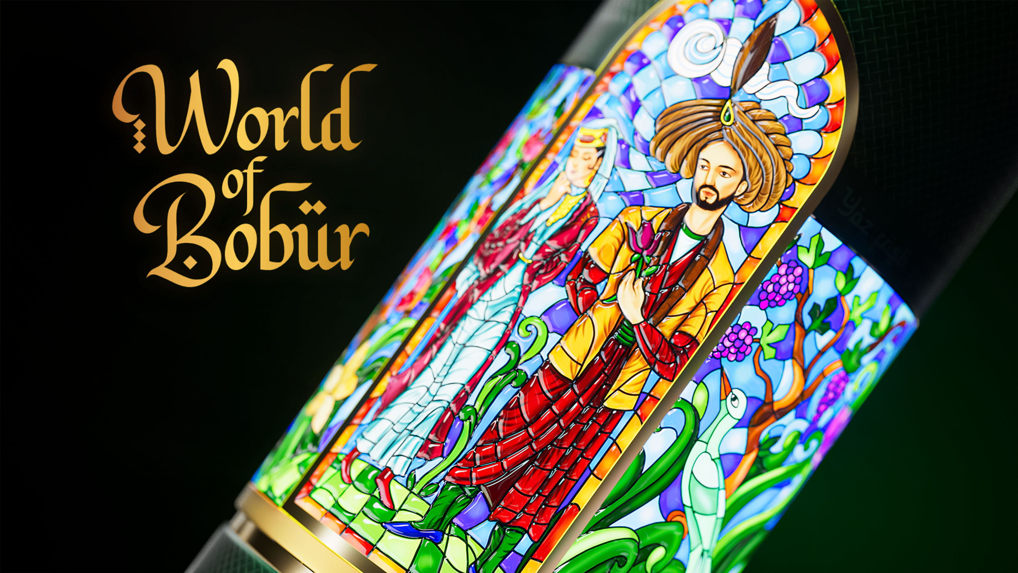 Stained-Glass Art: The central part of the cylindrical packaging is designed in the form of stylized stained glass, illustrating important scenes from Babur’s life (court scenes, poetic reflections, palace personnel).