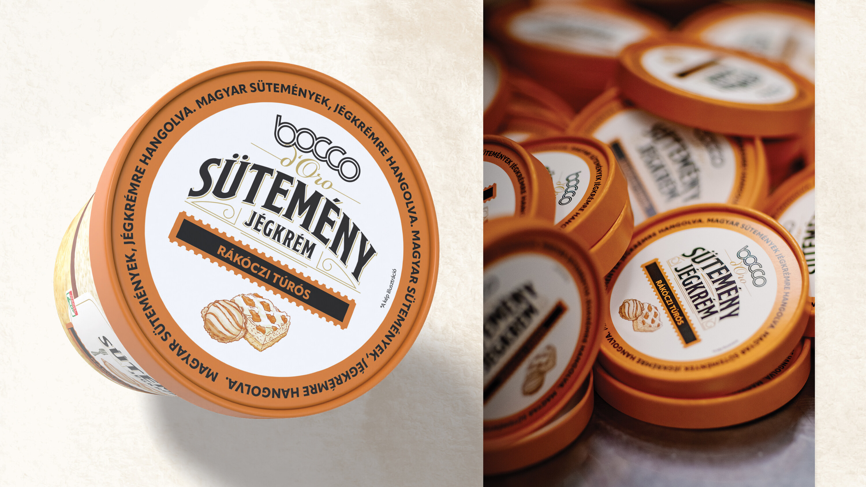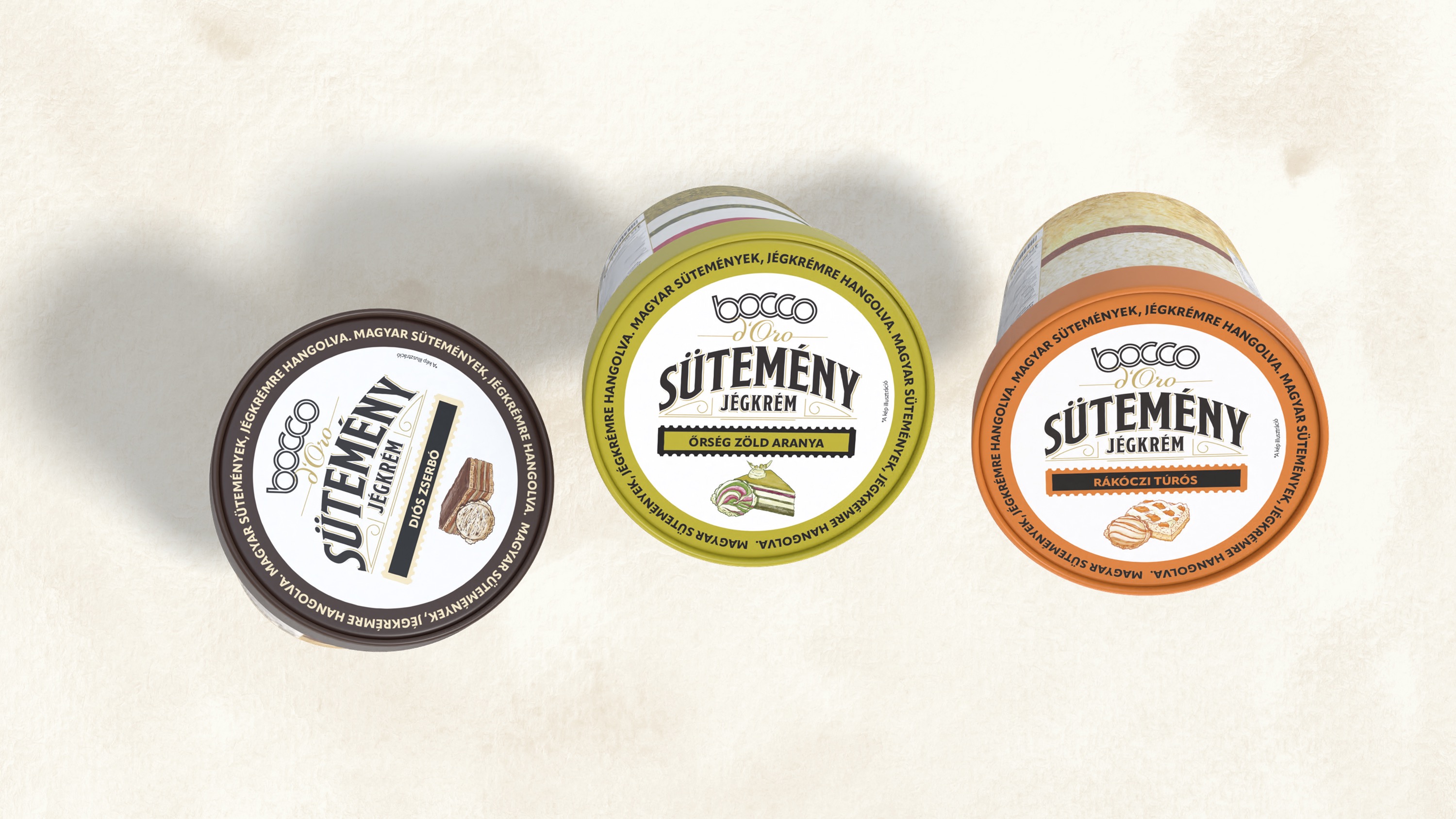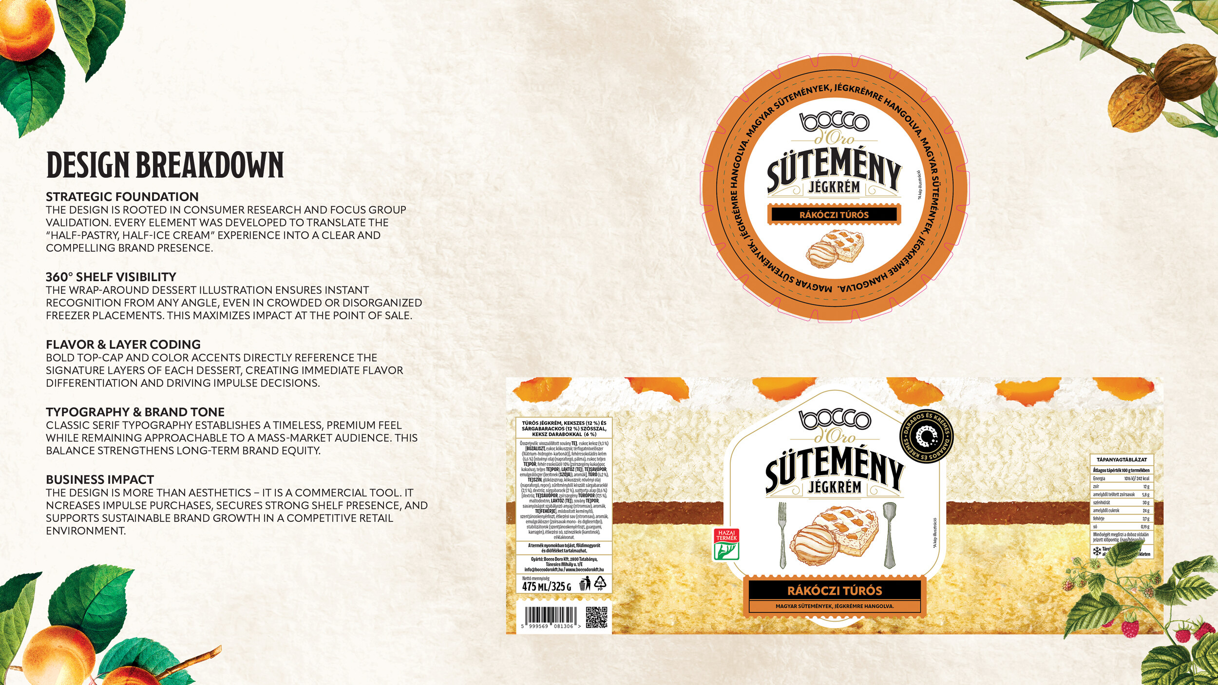 Bocco d’Oro Pastry Ice Cream is a category-defining innovation: iconic Hungarian desserts reimagined as indulgent ice creams. Creamy, scoopable, yet layered with real pastry chunks, the product delivers a unique “half-pastry, half-ice cream” experience. This concept bridges culinary tradition with modern indulgence, appealing both to nostalgic consumers and younger audiences looking for something new. For Solid Agency, the challenge was to translate this duality into a packaging system that is not only visually engaging but also commercially effective in a highly competitive national retail environment. The design had to work across different freezer placements, secure strong brand recognition, and stand out in the cluttered impulse-buy segment.