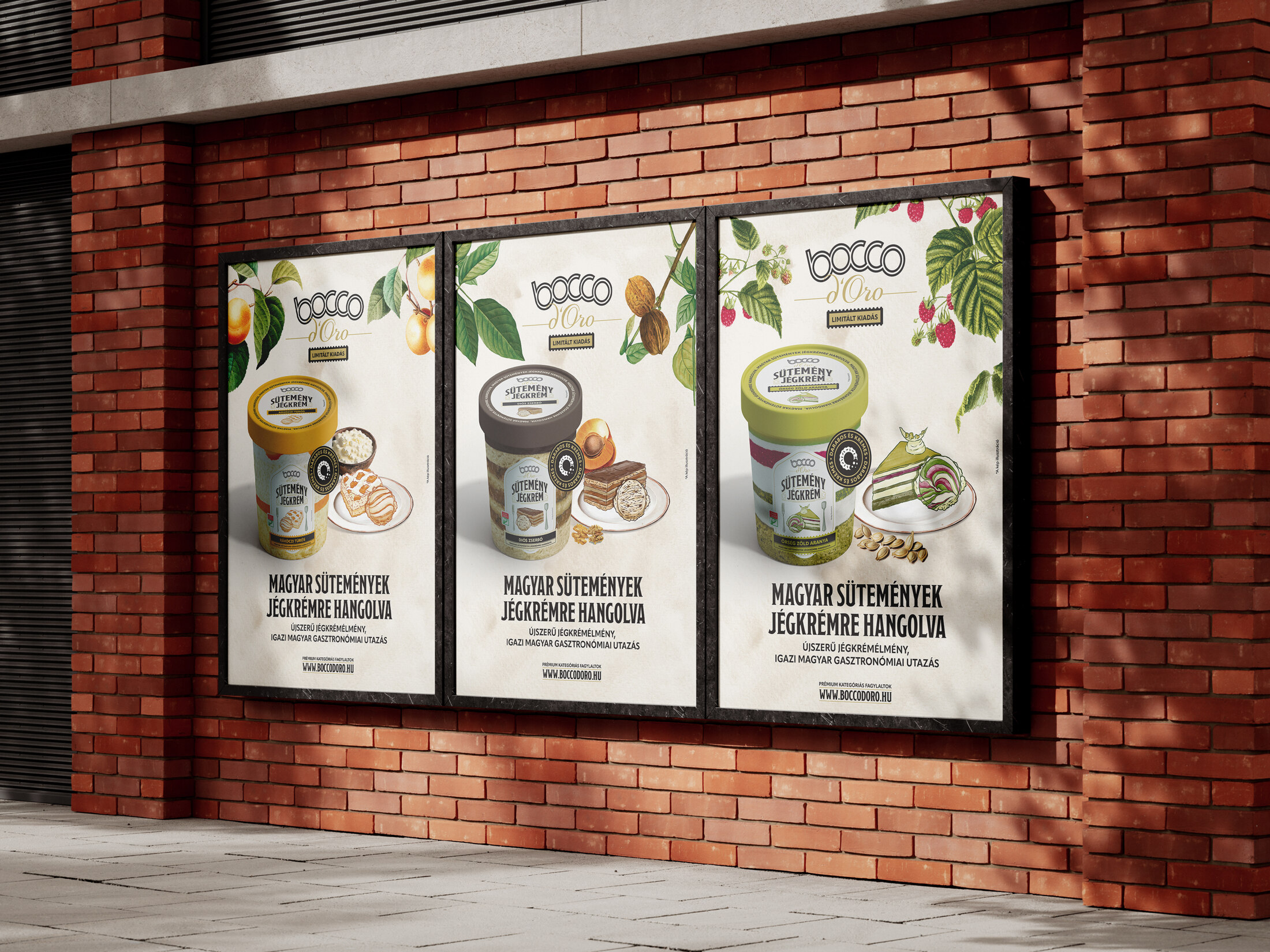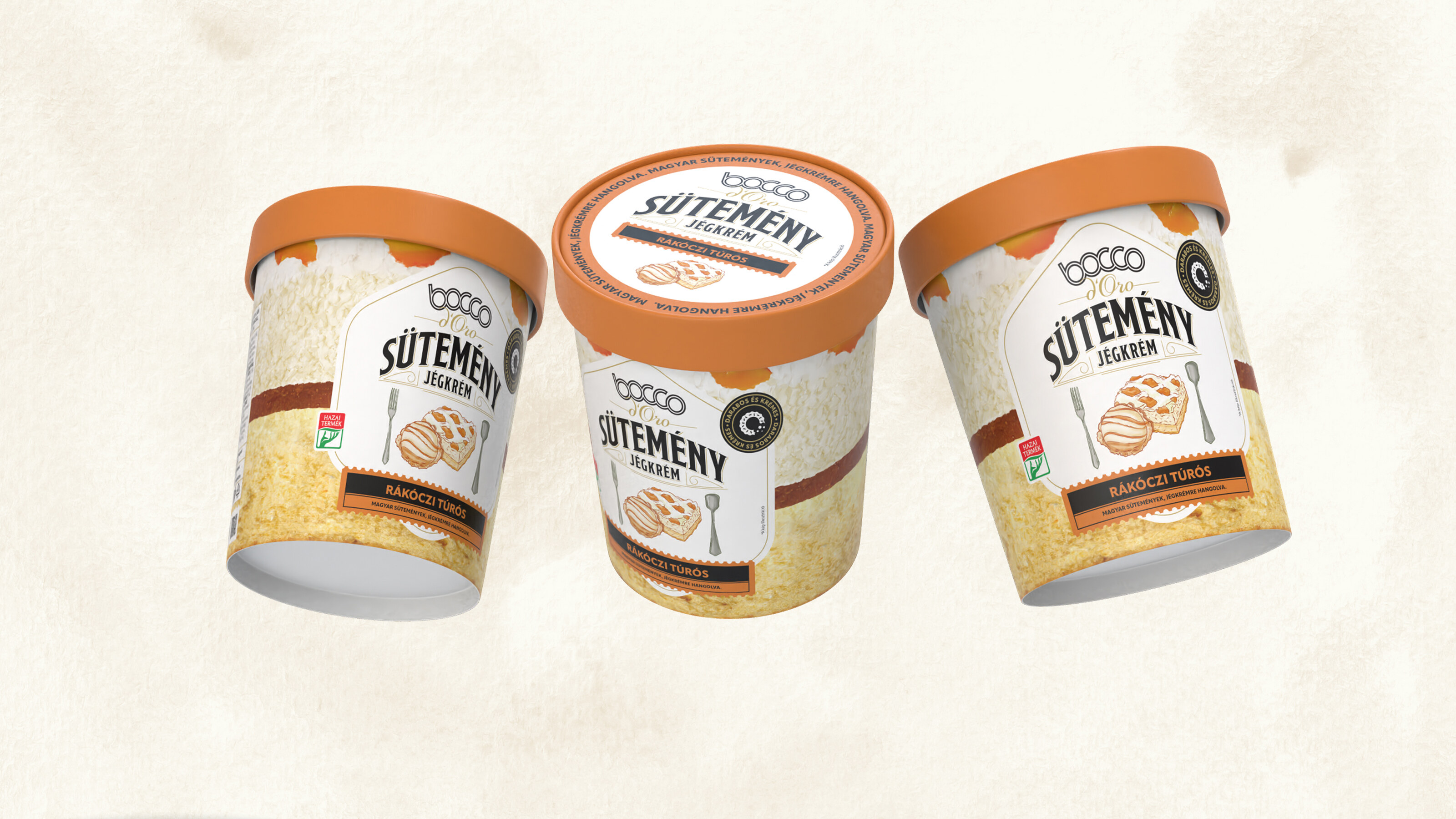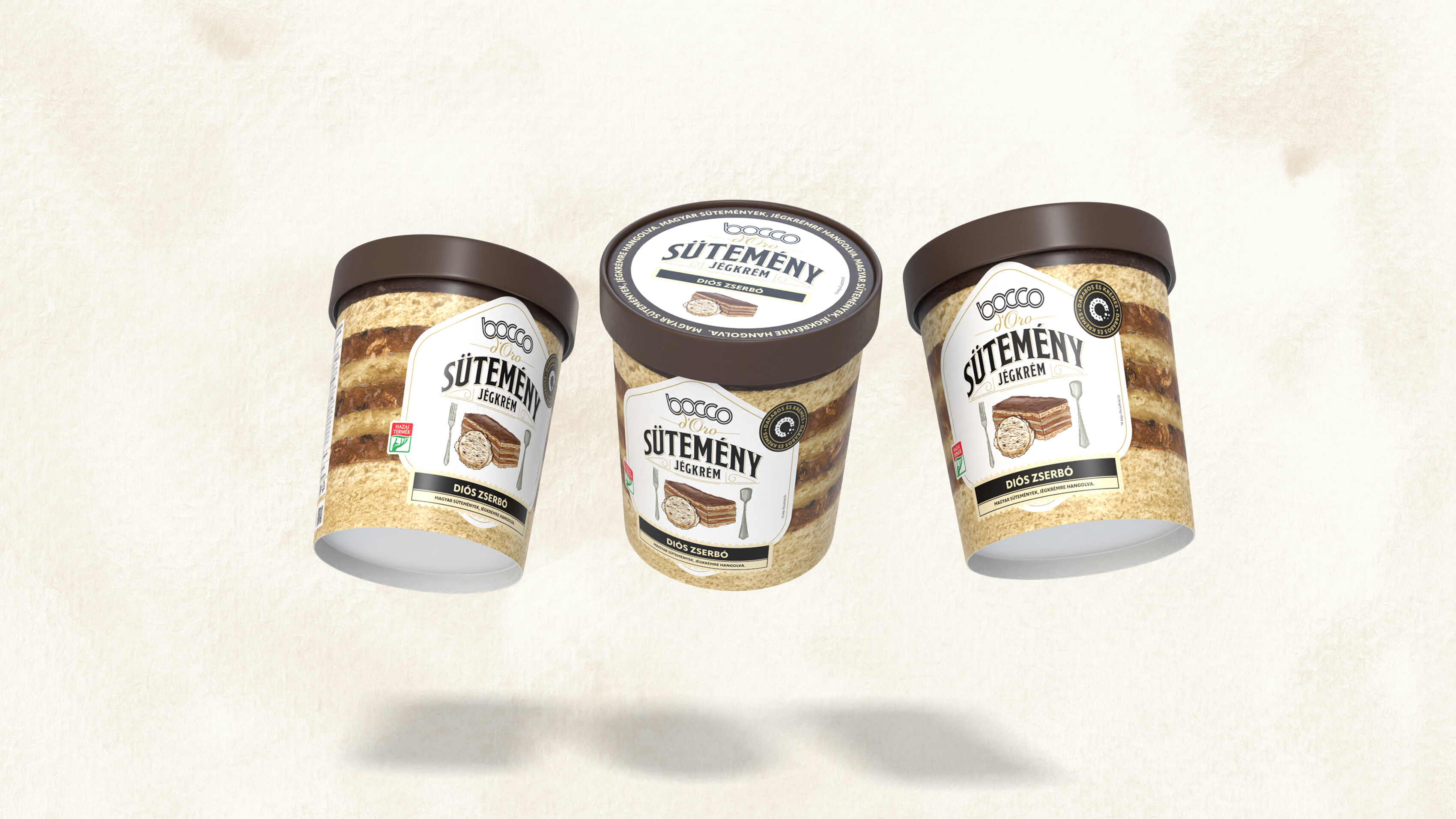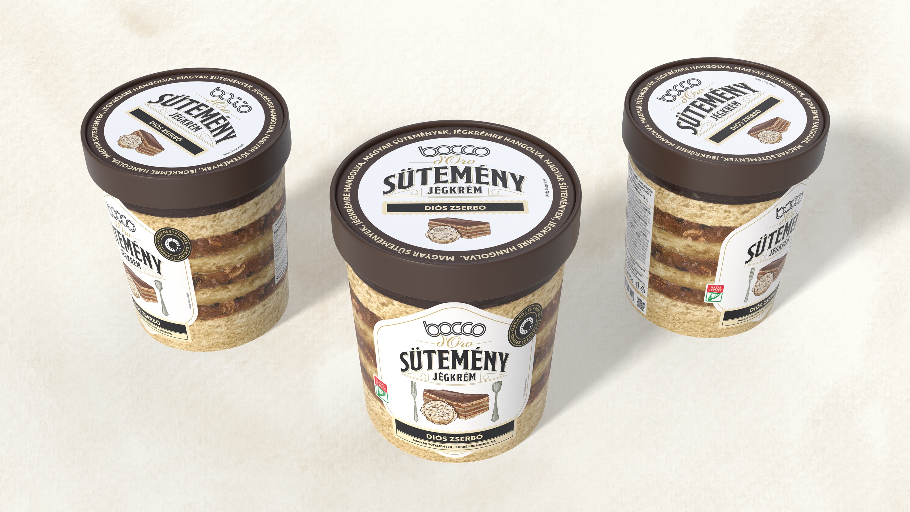 Bocco d’Oro Pastry Ice Cream is a category-defining innovation: iconic Hungarian desserts reimagined as indulgent ice creams. Creamy, scoopable, yet layered with real pastry chunks, the product delivers a unique “half-pastry, half-ice cream” experience. This concept bridges culinary tradition with modern indulgence, appealing both to nostalgic consumers and younger audiences looking for something new. For Solid Agency, the challenge was to translate this duality into a packaging system that is not only visually engaging but also commercially effective in a highly competitive national retail environment. The design had to work across different freezer placements, secure strong brand recognition, and stand out in the cluttered impulse-buy segment.