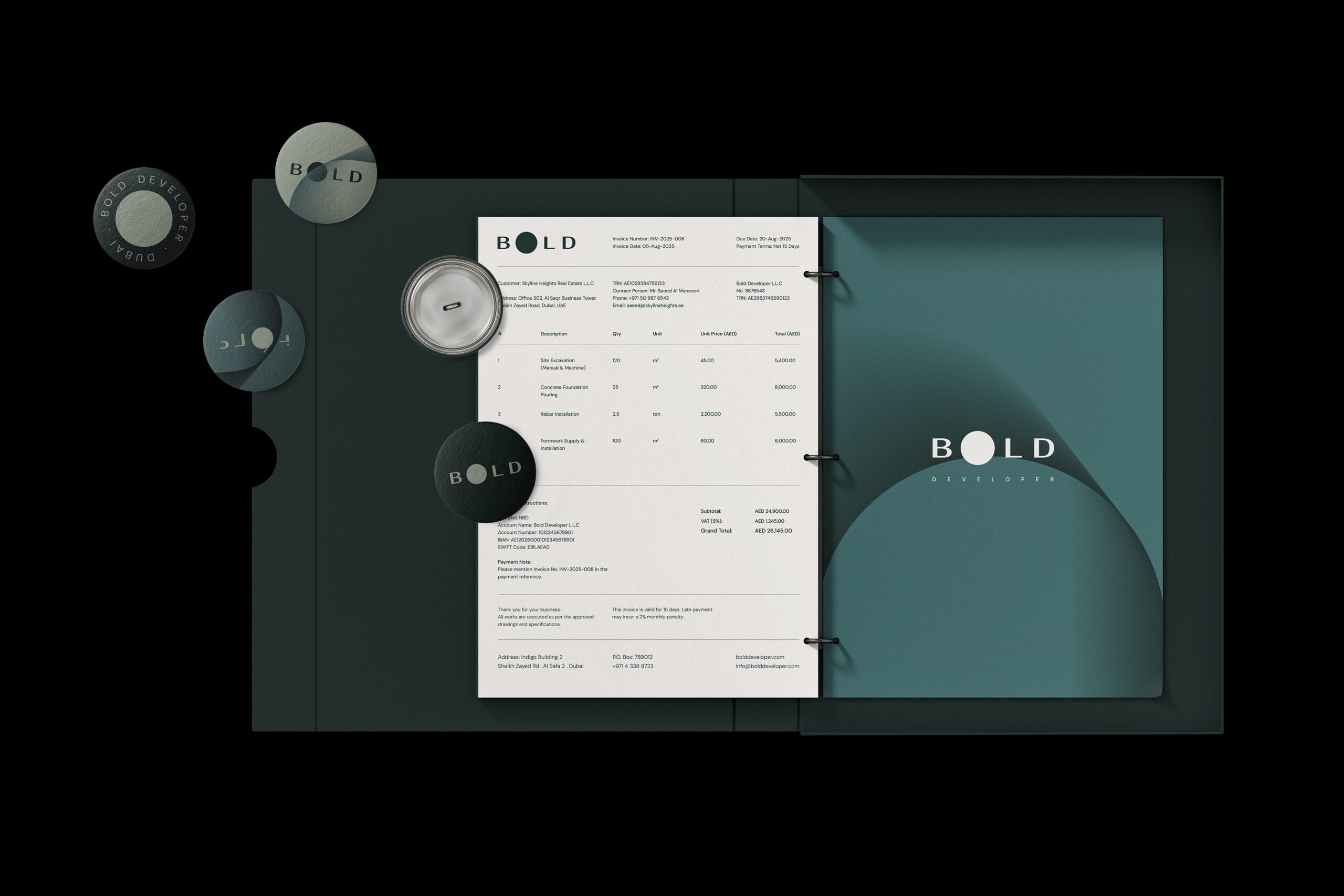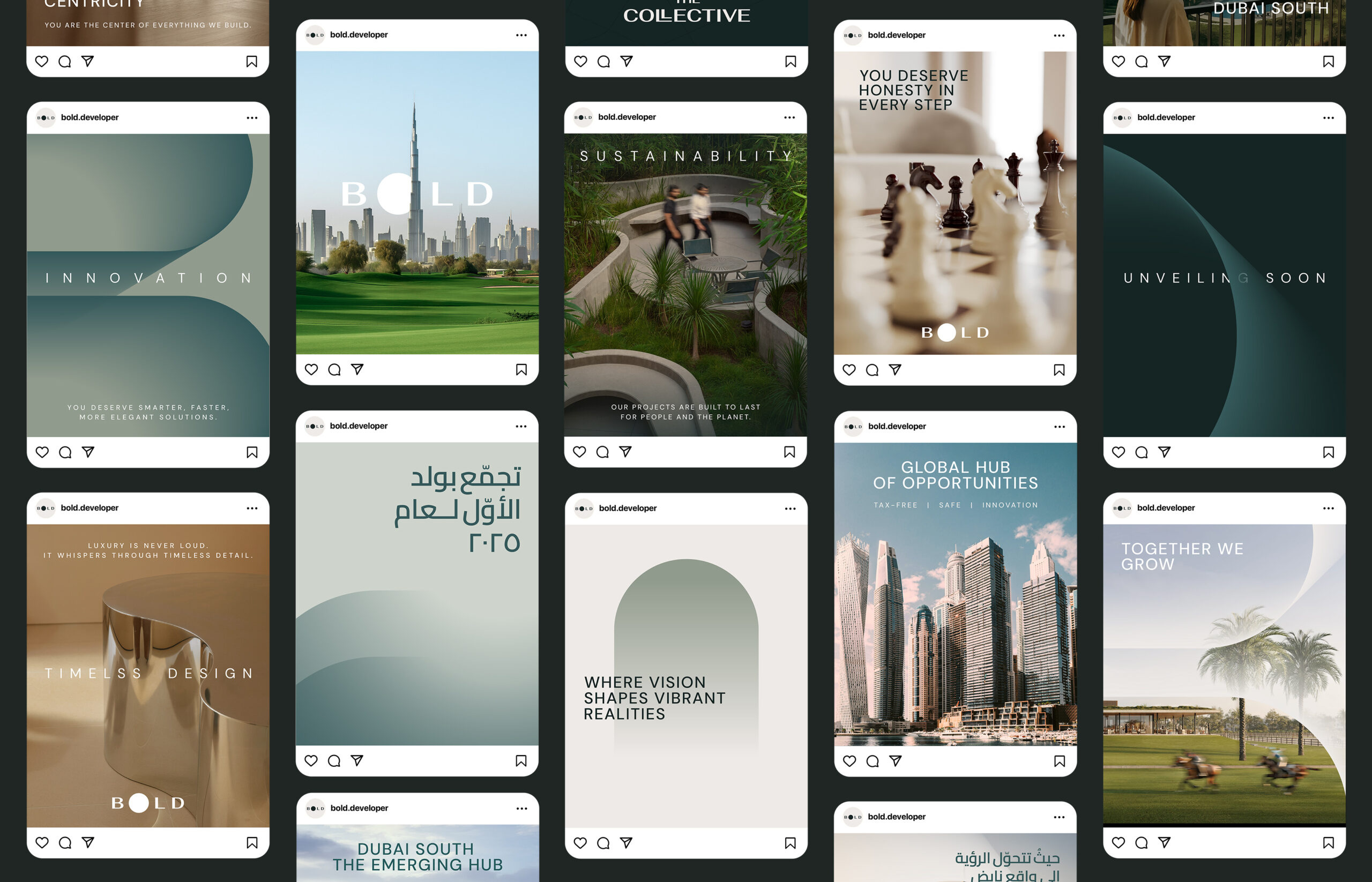 Bold is a Dubai-based real estate developer operating in one of the most competitive construction landscapes in the region. The design challenge was clear from the outset: the brand needed a visual identity capable of standing apart in a saturated market, while still echoing the essence of what it does.
