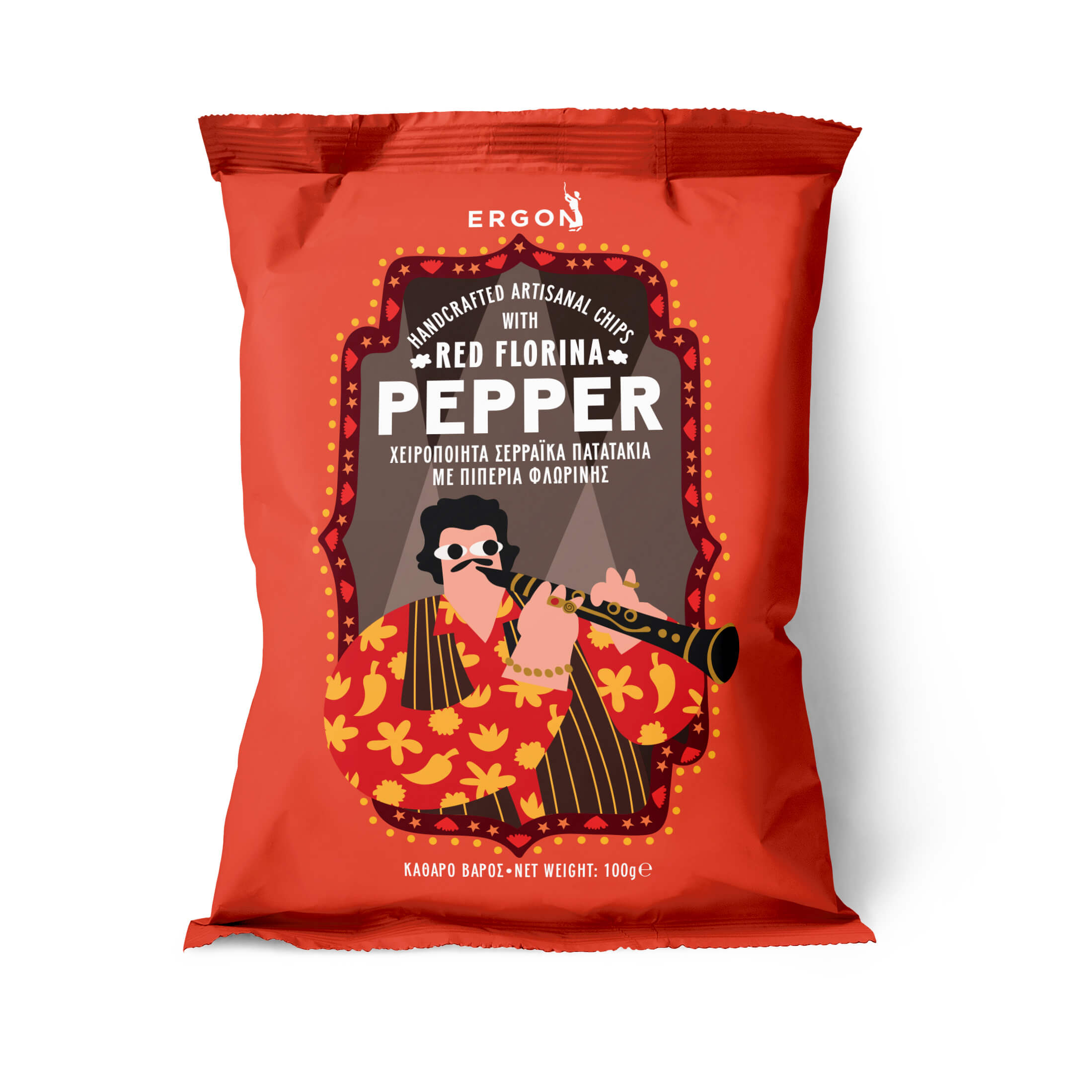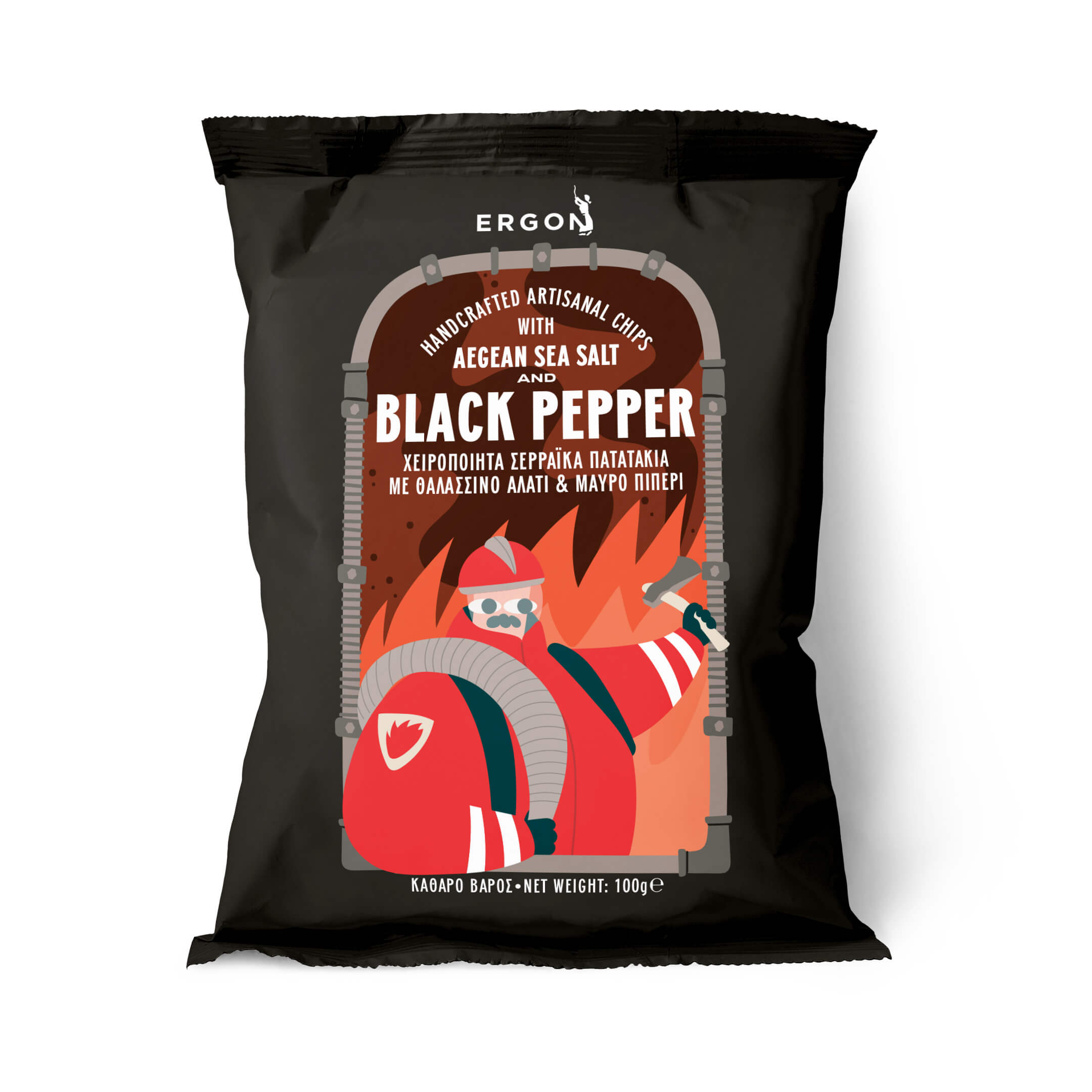 Stereotypically, the flavours on potato chips packaging are differentiated by depicting their highlighted ingredient, either using using photography or illustration. We wanted to go down a different path and create a range that stands out on the shelves both in terms of look and concept. The flavours of Ergon chips – Aegean Sea salt, red Florina pepper, wild oregano, wild black truffle, Aegean Sea salt and black pepper – are very distinct, without much overlapping. That allowed us to think of contrasting characters that could express and represent every flavour, each accompanied by their unique colour palette. And when combined, a rainbow of bold, fun colours is born.