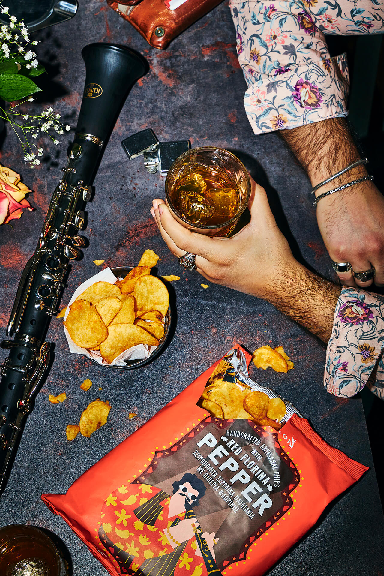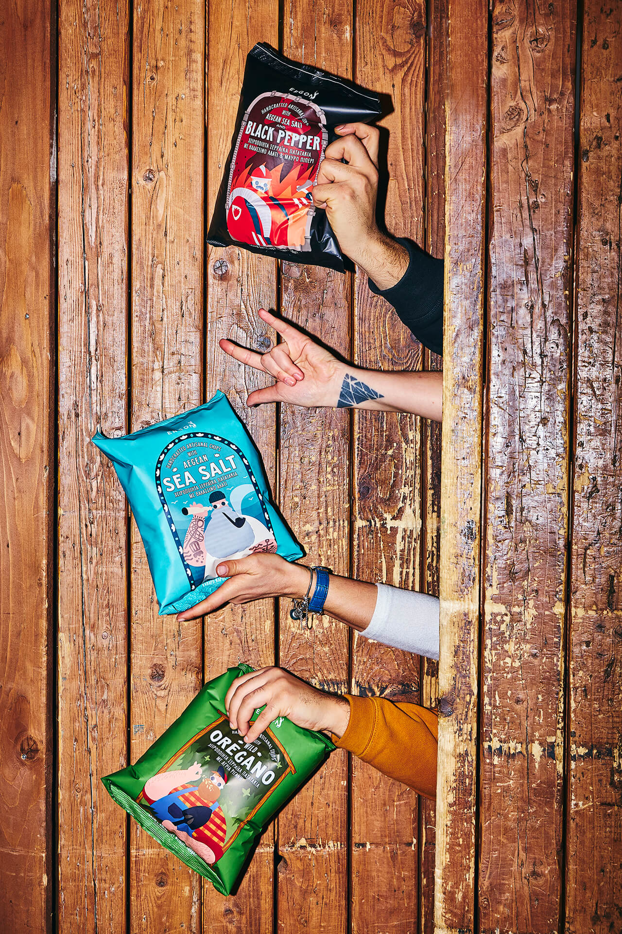 The characters we created speak directly to their respective flavours with a humorous intention and an illustration style that is straightforward, funny, and adapts well to every composition’s need. A scruffy captain for the sea salt, a sympathetic farmer for oregano, a sparkly clarinet player (common figure to a type of folk Greek music) for red Florina pepper, a snooty rich lady for black truffle and a firefighter for black pepper because things can get spicy hot. And like so, flavour selection turns into a pick-your-style situation. It’s fun, it’s in your face, relatable yet fresh, embodies all that a tasty snack is.