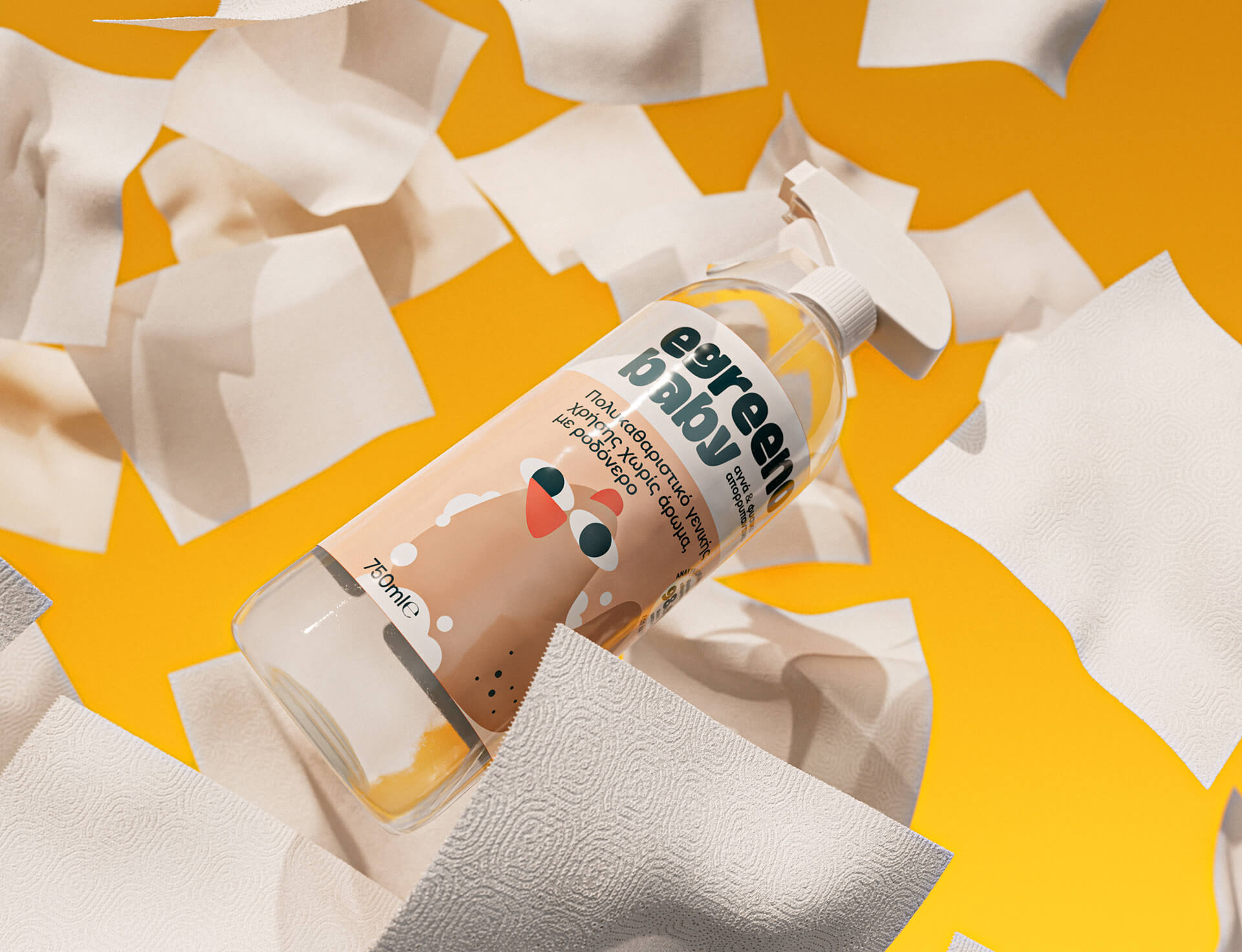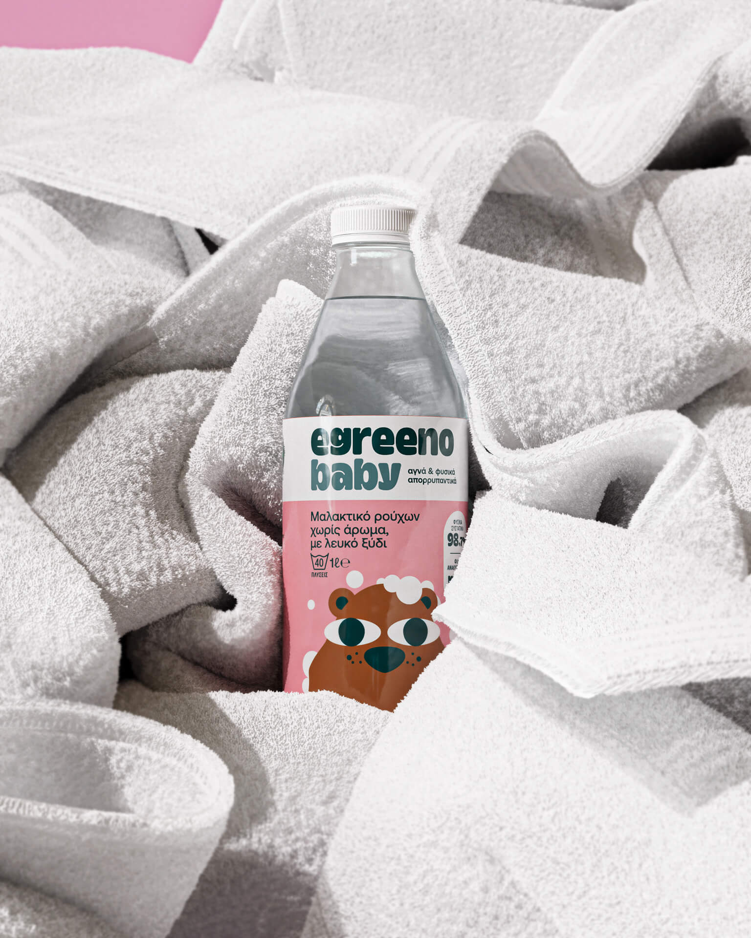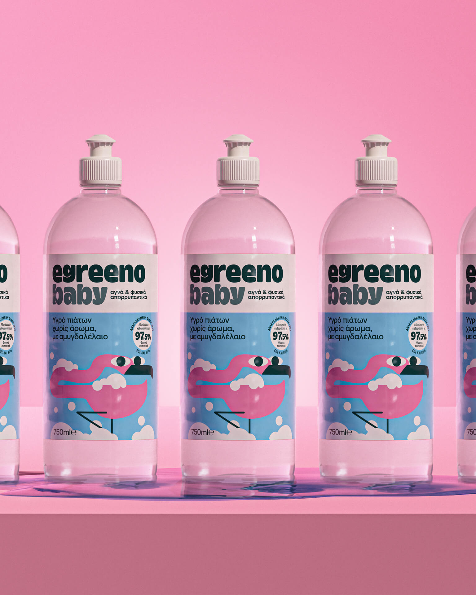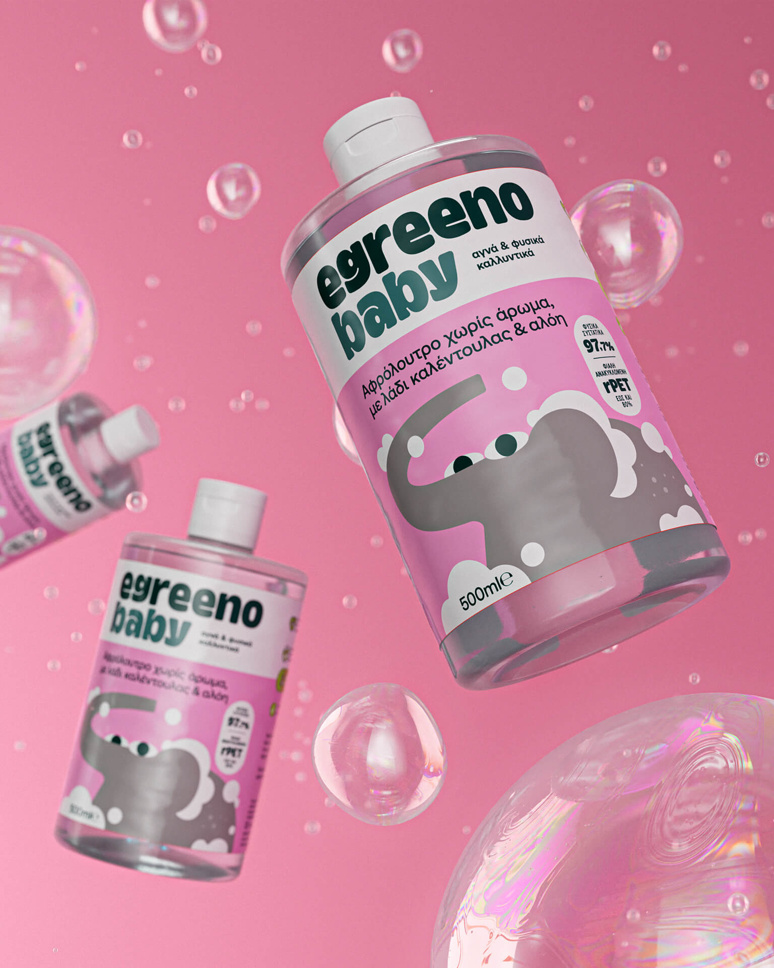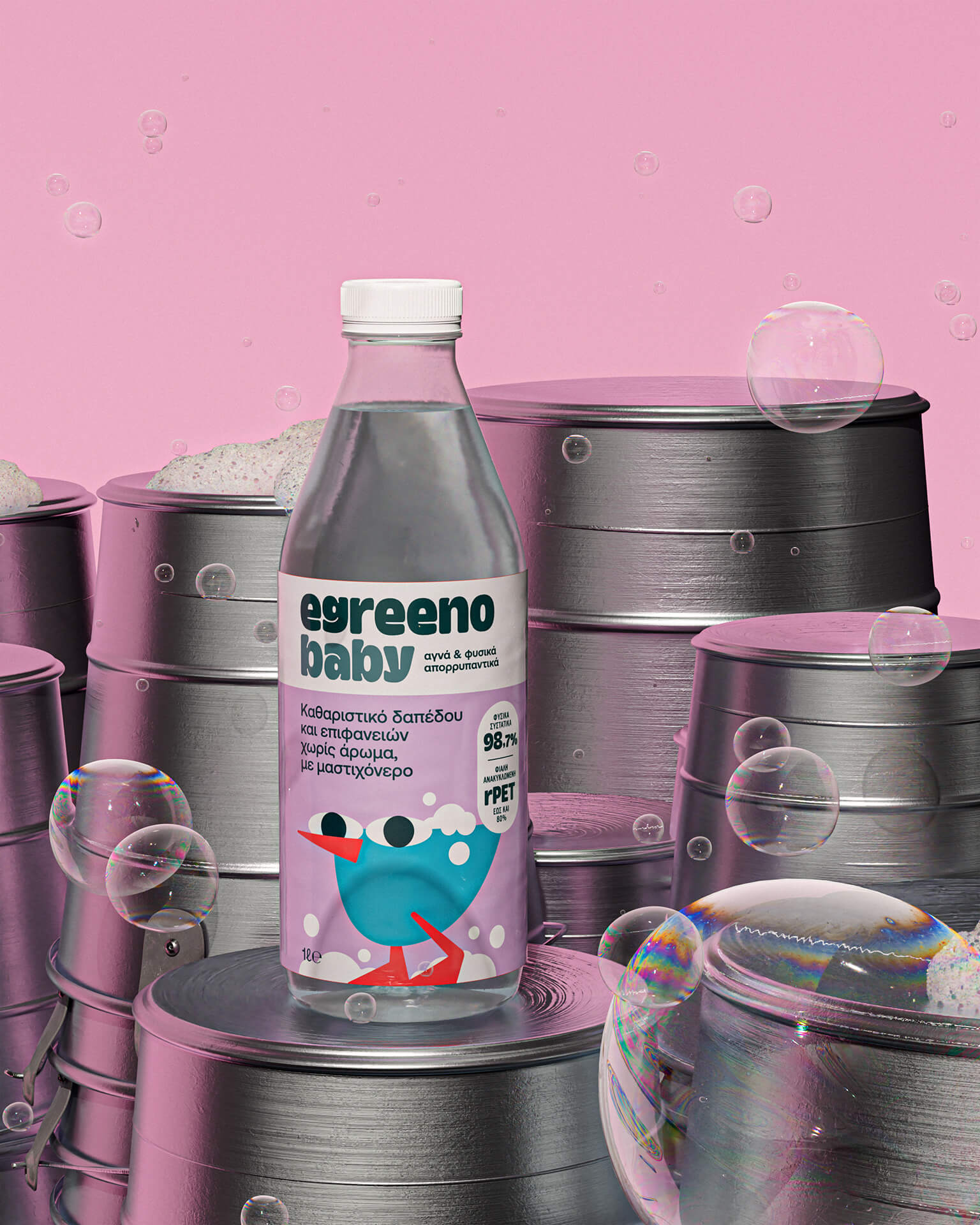 By introducing rPET bottles made from recycled raw material (up to 85% recycled material) in all products of the range. While at the same time by choosing container forms, we managed to break the rules of traditional detergent bottles, which have a peculiar shape and form, are not ergonomic and make little use of shelf and cupboard space. After our research, we came to the conclusion that the familiar form of the milk bottle, carries a positive meaning – implying the daily use of the contents. With the introduction of this bottle, all Egreeno Baby labels have become more prominent, as the cylindrical shape dictates a larger printable surface. The information well displayed and vibrant images produce an overall visually appealing effect on shelves – in literally half the space of a traditional detergent bottle.