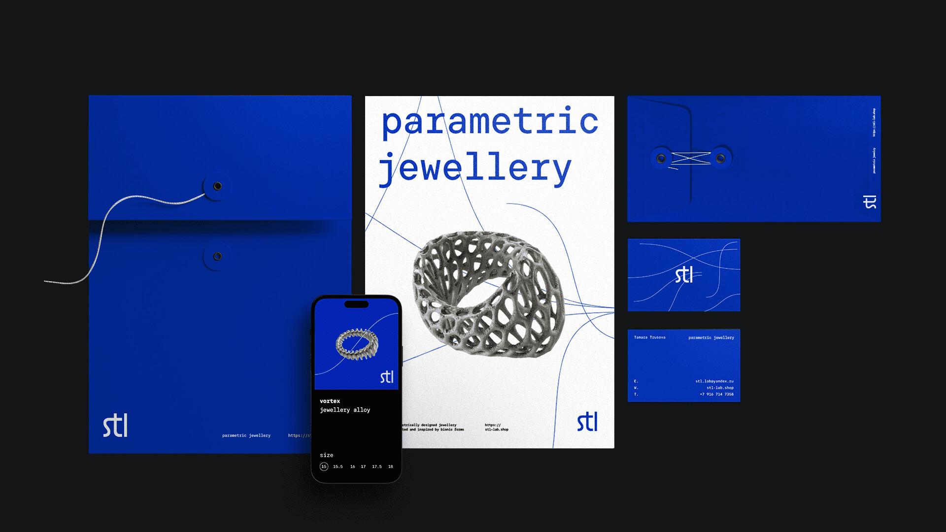 Stl (short for “stereolithography”) is a 3D model format that is used for 3D printing. The accessories are inspired by bionic forms, parametrically designed and manufactured using 3D printing technology. The brand’s creator Tamara Trusova is a certified architect. Her passion for programming led her to experiment with complex sculptural forms in jewelry. As part of the company’s rebranding, our task was to create packaging that would reflect the uniqueness of the product.