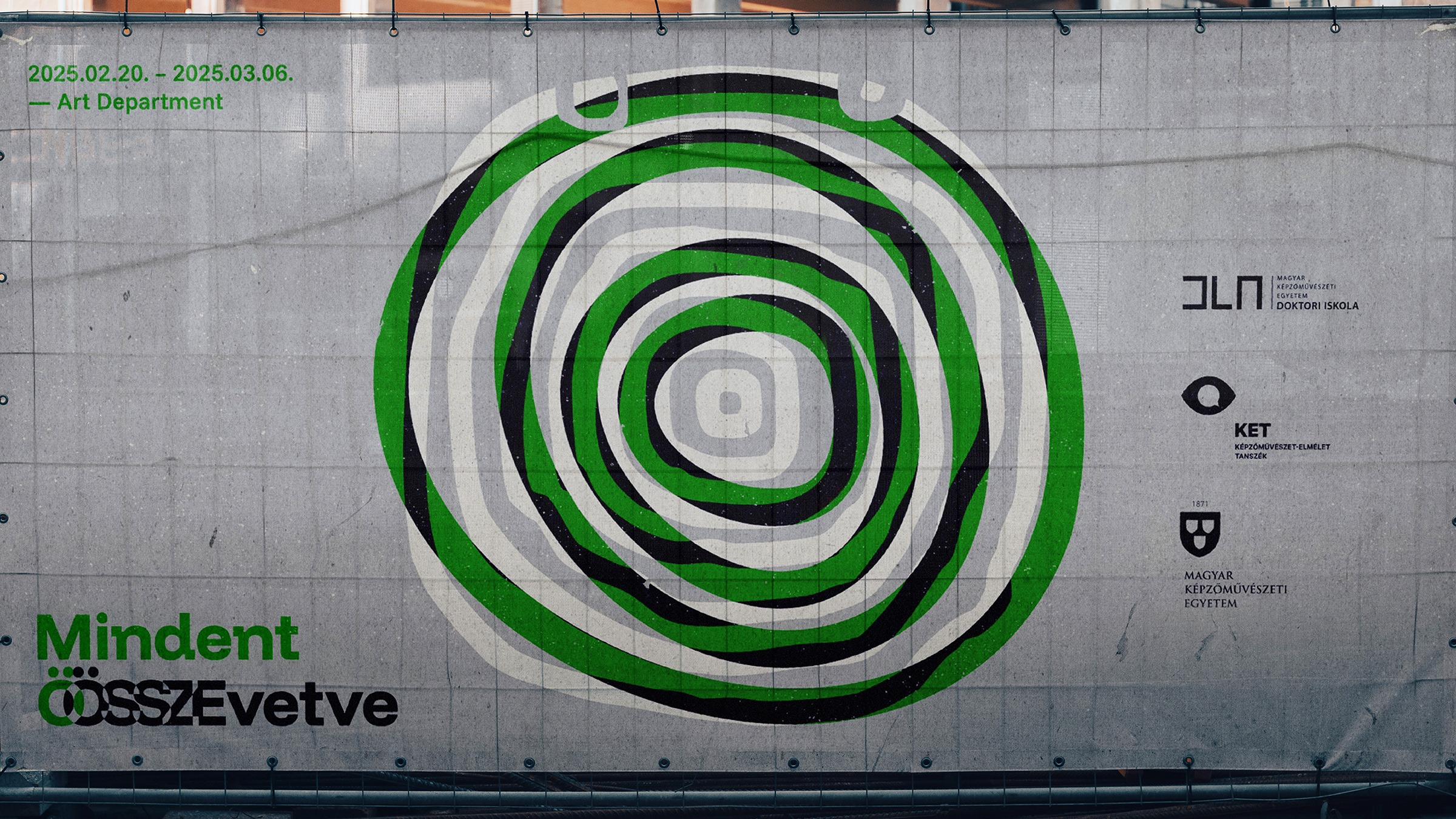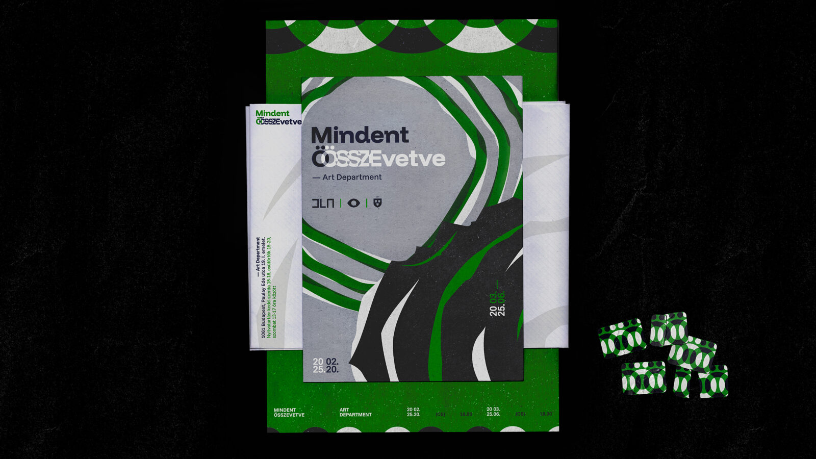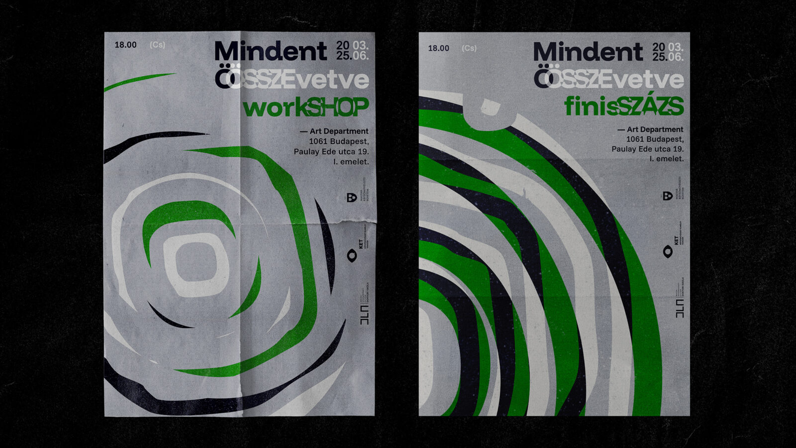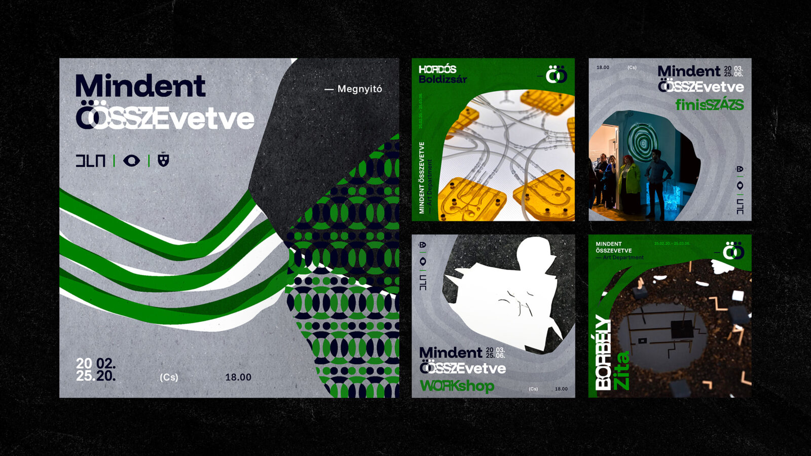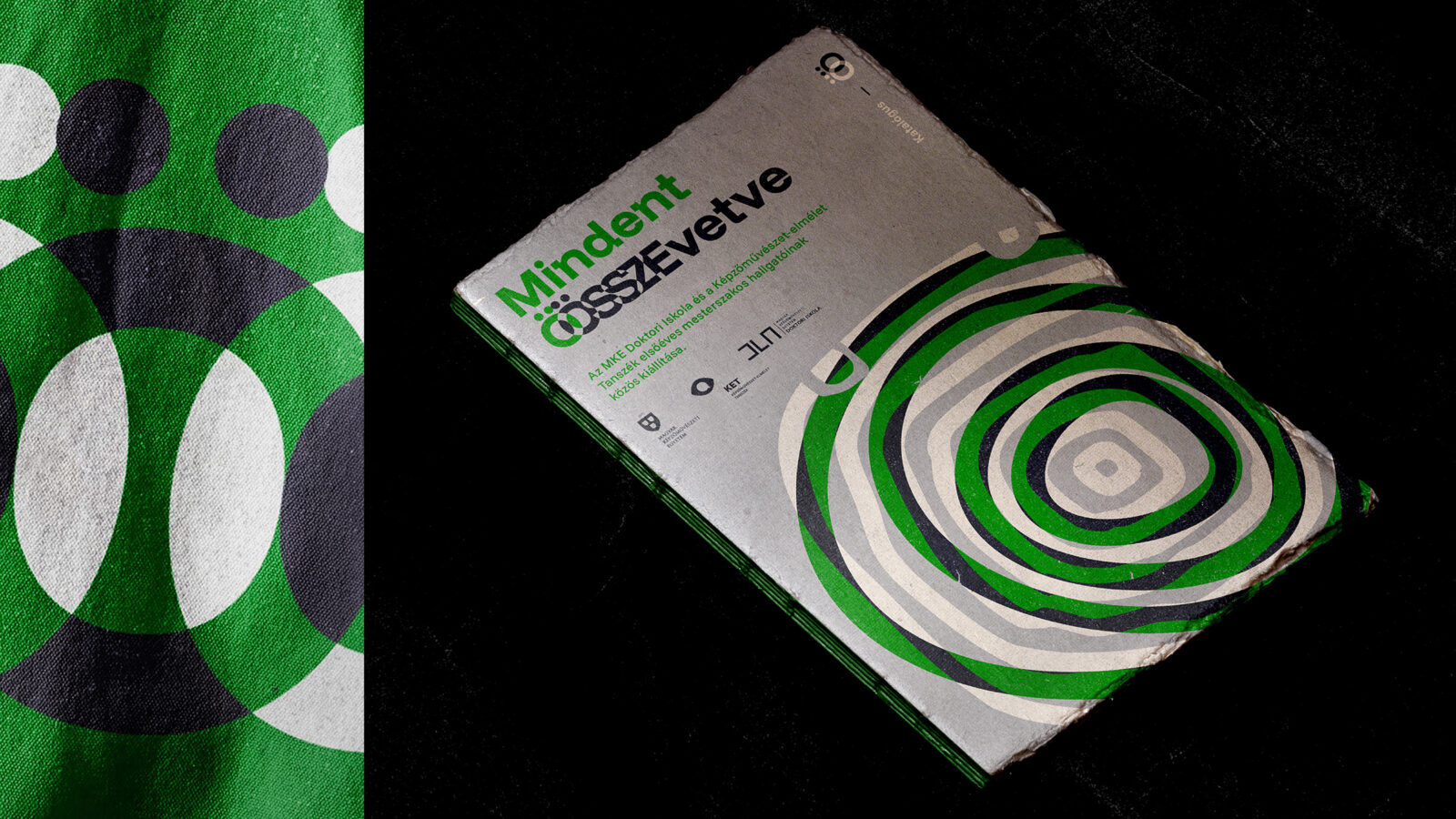The visual identity for the Mindent Összevetve (i.e. All Things Considered) exhibition came out for the collaboration between the Doctoral School at the Hungarian University of Fine Arts and the first-year MA students from the Fine Art Theory Department. The exhibition is a trace of a process: not a finished product, but a snapshot of an organic system. In this sense, it also reflects the workings of intellectual and creative workshops, where ideas and artworks continuously shape each other.