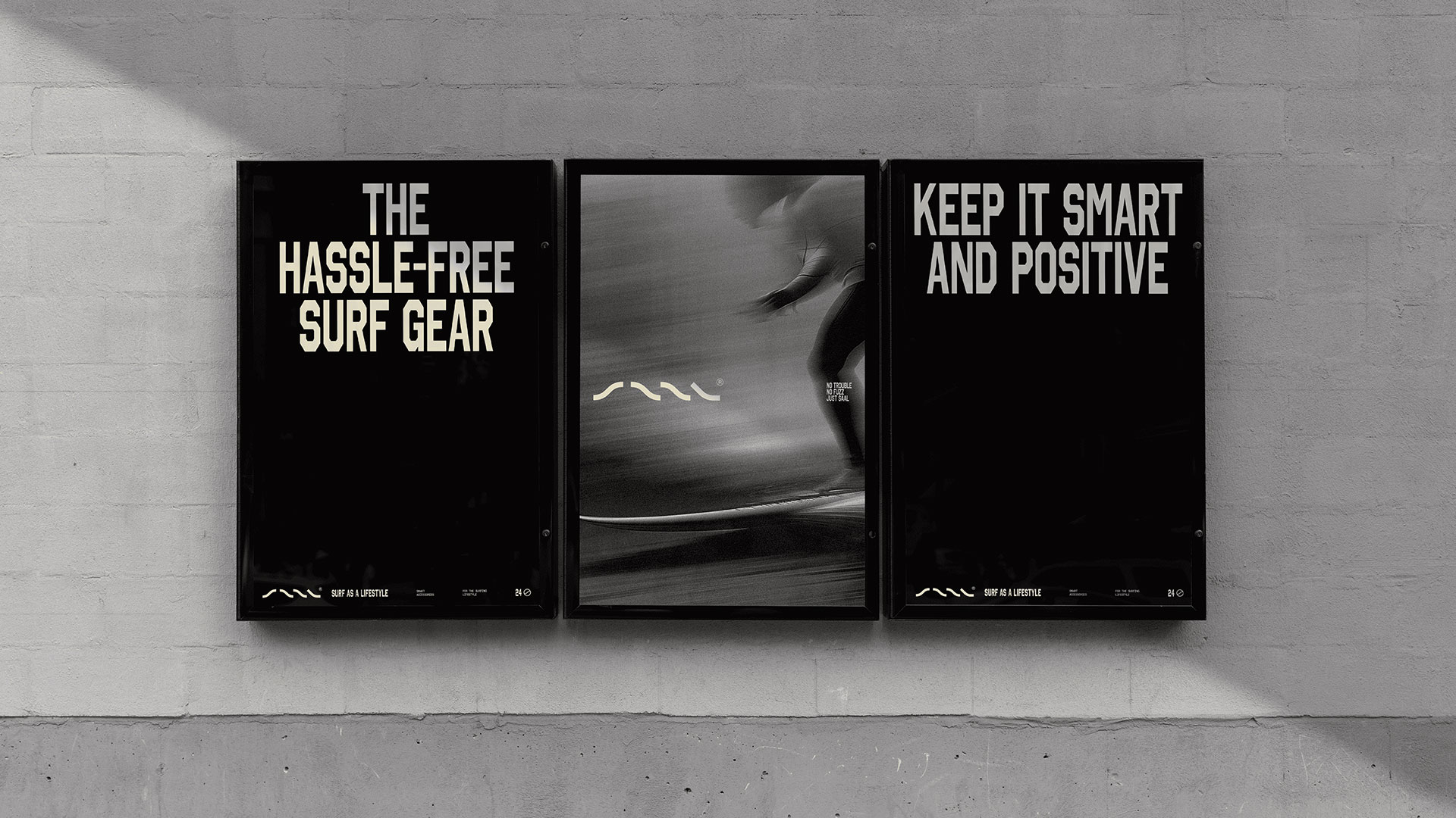 From this foundation, we developed a brand that fuses functionality, simplicity, and innovation. The visual identity was designed as an integrated system where the logo, typography, color palette, and photography express fluidity, movement, and a deep connection to the ocean. Organic shapes, high contrast, and action-oriented imagery translate the rhythm of surfing into a visual language, creating a bold and recognizable presence.
