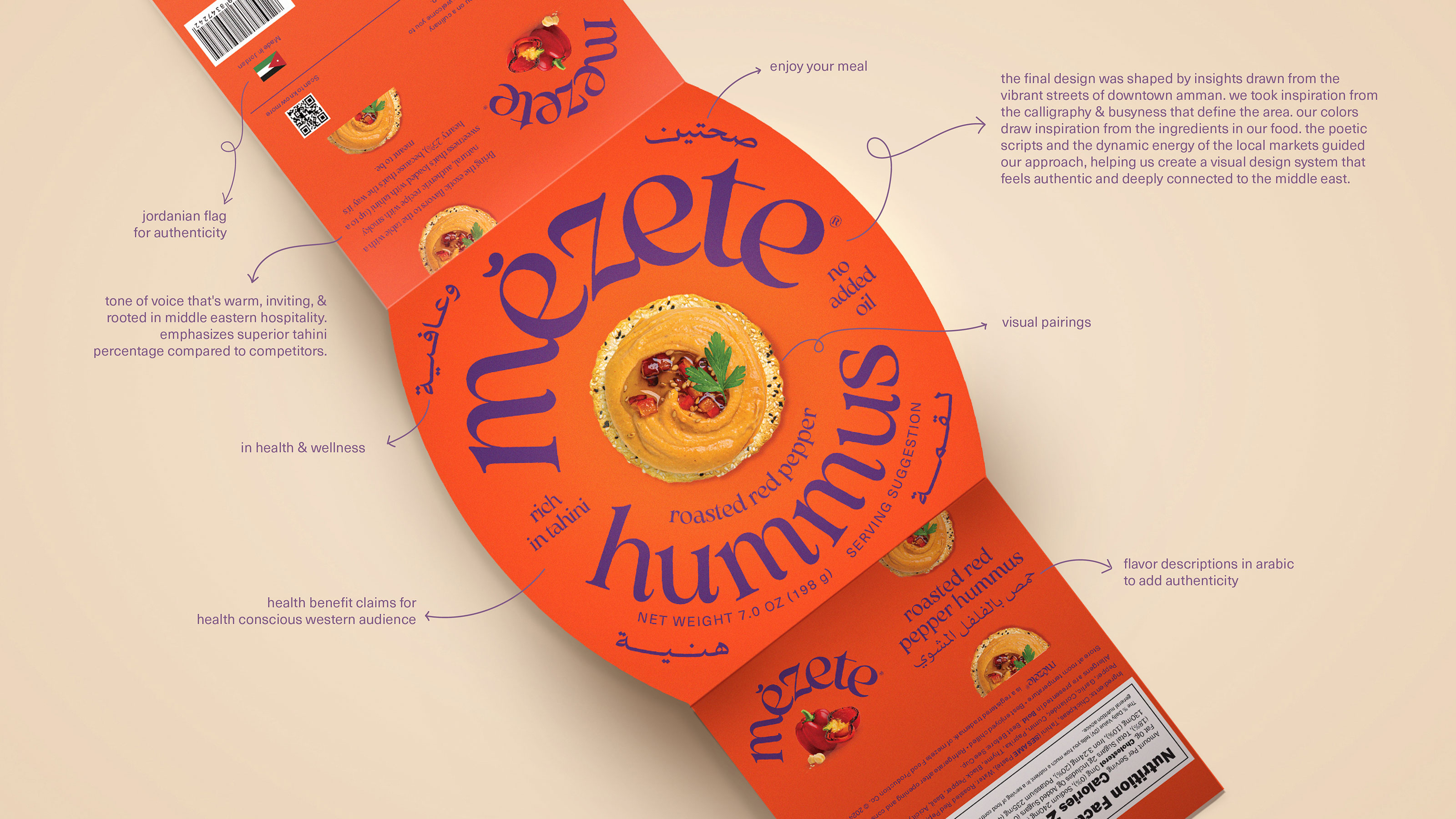 mezete’s redesign solves a fundamental problem – how does a Middle Eastern food brand prove it’s the real deal in a market flooded with western brands selling unauthentic versions of Middle Eastern food? mezete’s original packaging lacked cultural authenticity and visual impact, making it seem like an American or European product.
