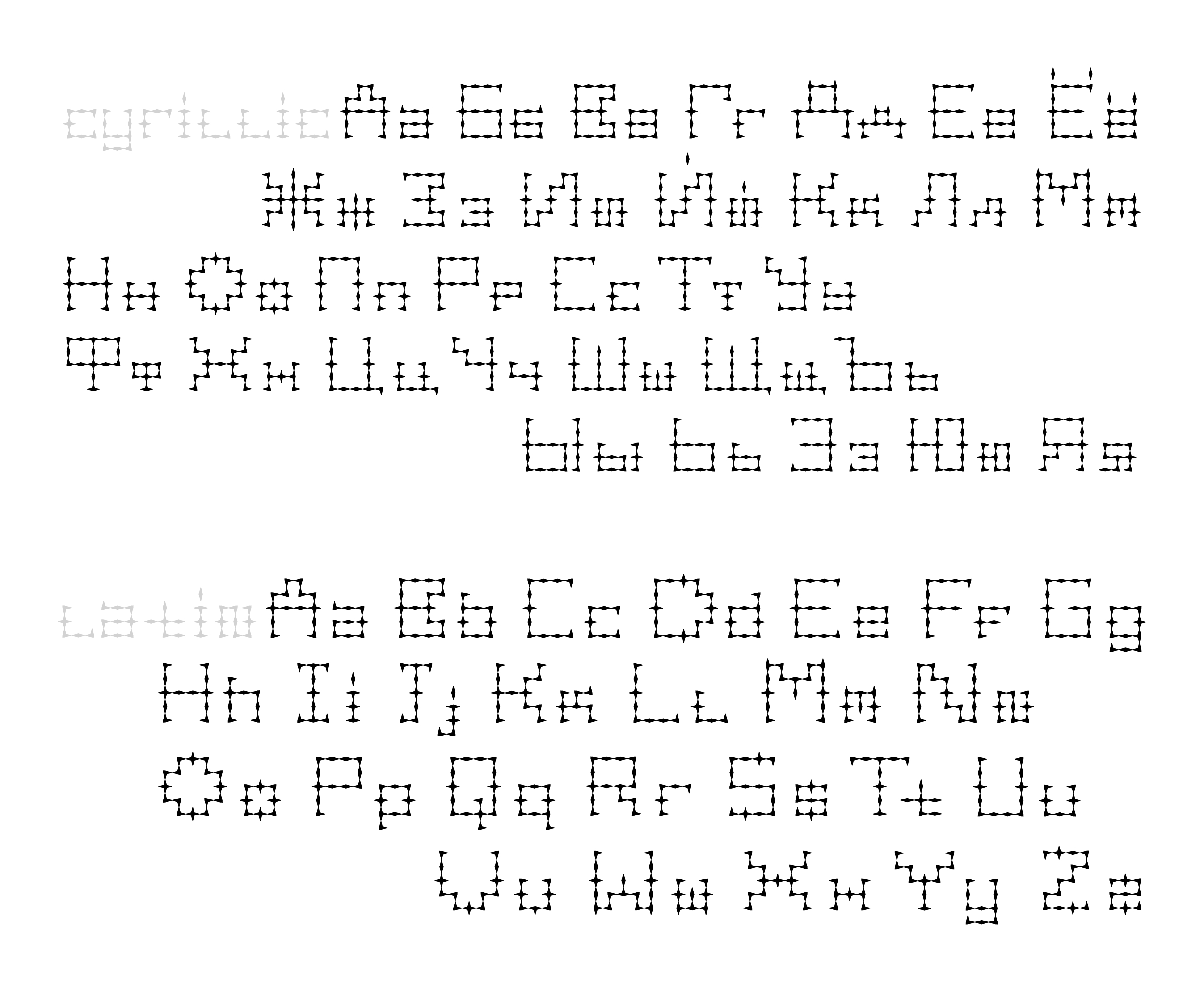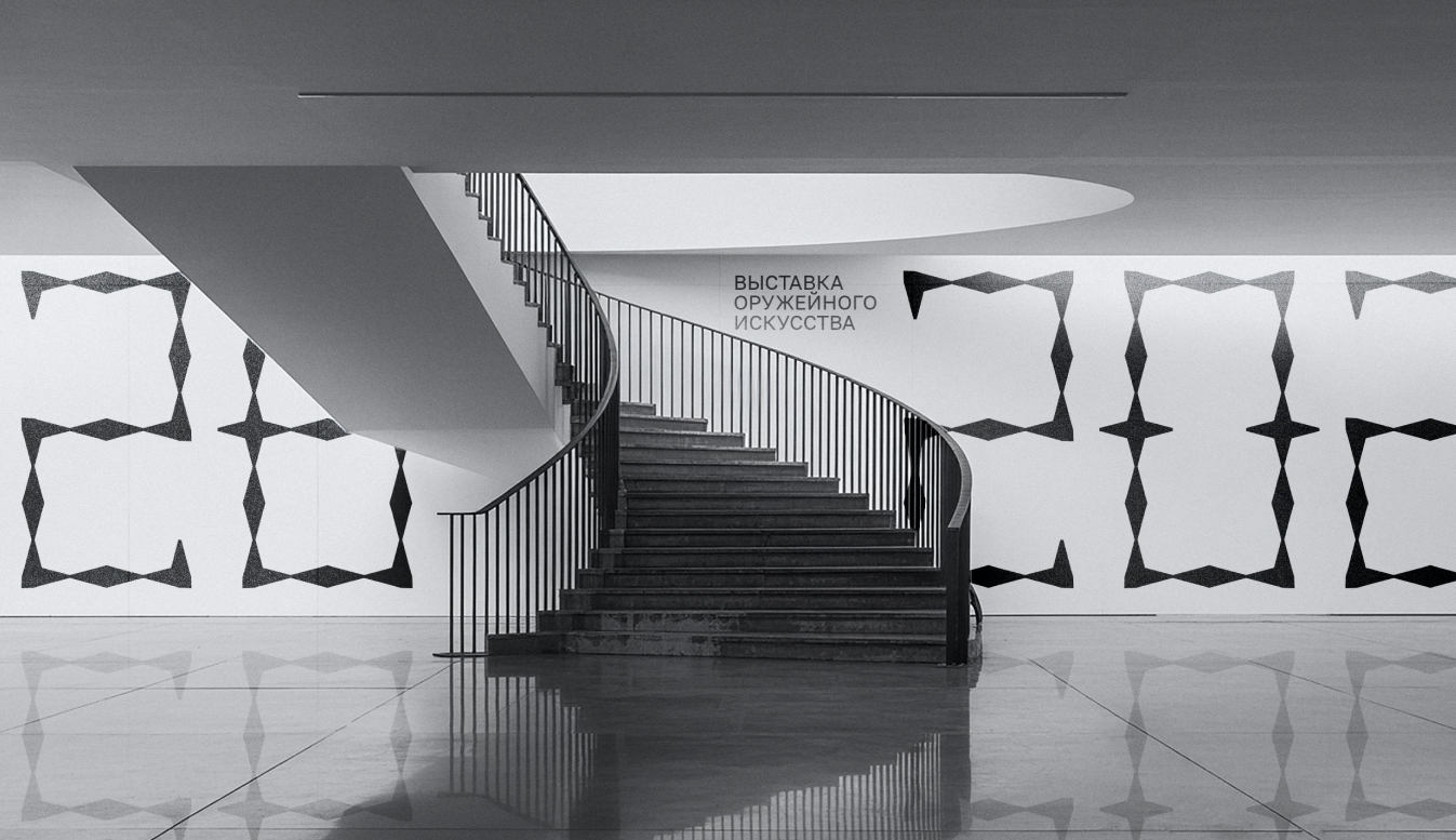 Spear Serif is a fully realized typeface with uppercase and lowercase characters, a comprehensive set of basic symbols, and a suite of stylized icons depicting abstracted weapon forms. To enhance its typographic sophistication and cultural adaptability, it includes a system of ligatures for both Latin and Cyrillic scripts. In these ligatures, glyphs visually interlock by connecting their horizontal serifs, mirroring the precise assembly of weapon parts. This comprehensive typographic system serves as the complete and versatile foundation for the entire exhibition identity.