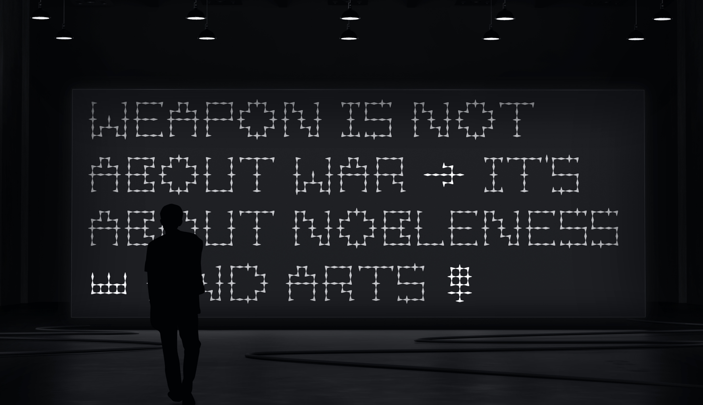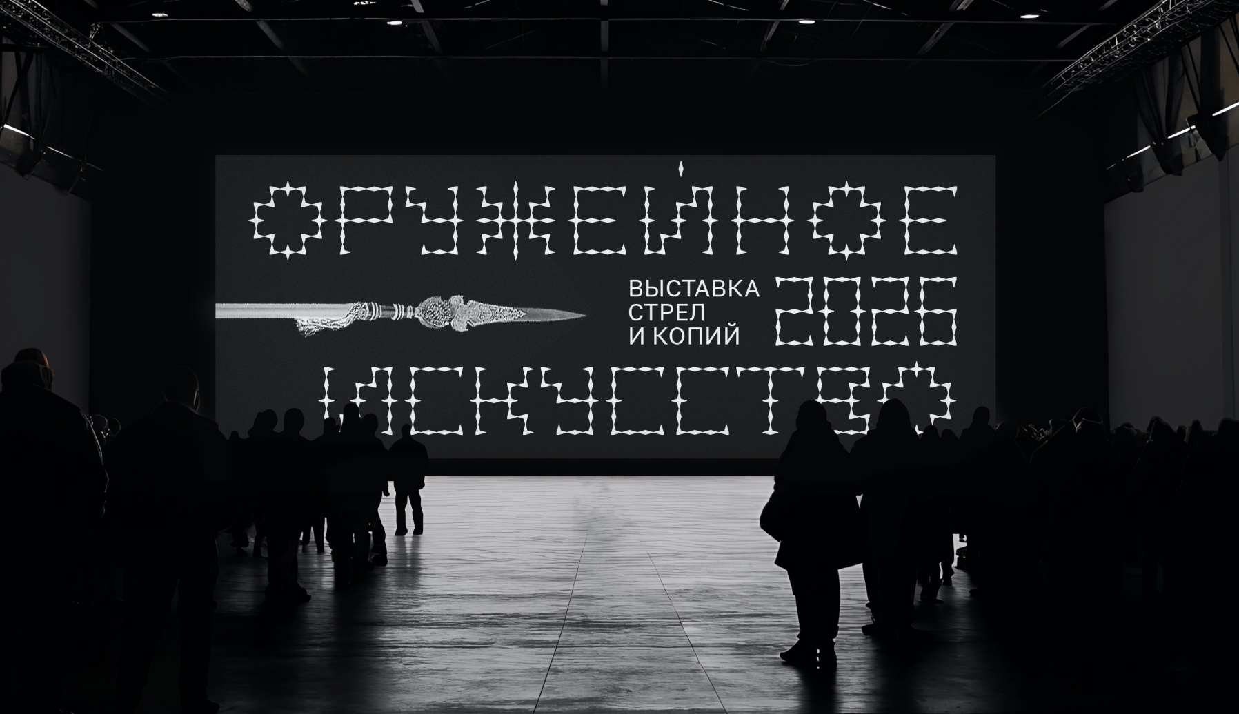 The exhibition’s visual identity is built upon Spear Serif, a bespoke modular typeface designed for the project. Its forms are a direct synthesis of two key principles: rough, industrial cuts and a refined, forged elegance. This duality is a deliberate visual reference to the core artifacts of the exhibition—arrowheads and spears—where lethal utility converges with striking beauty.