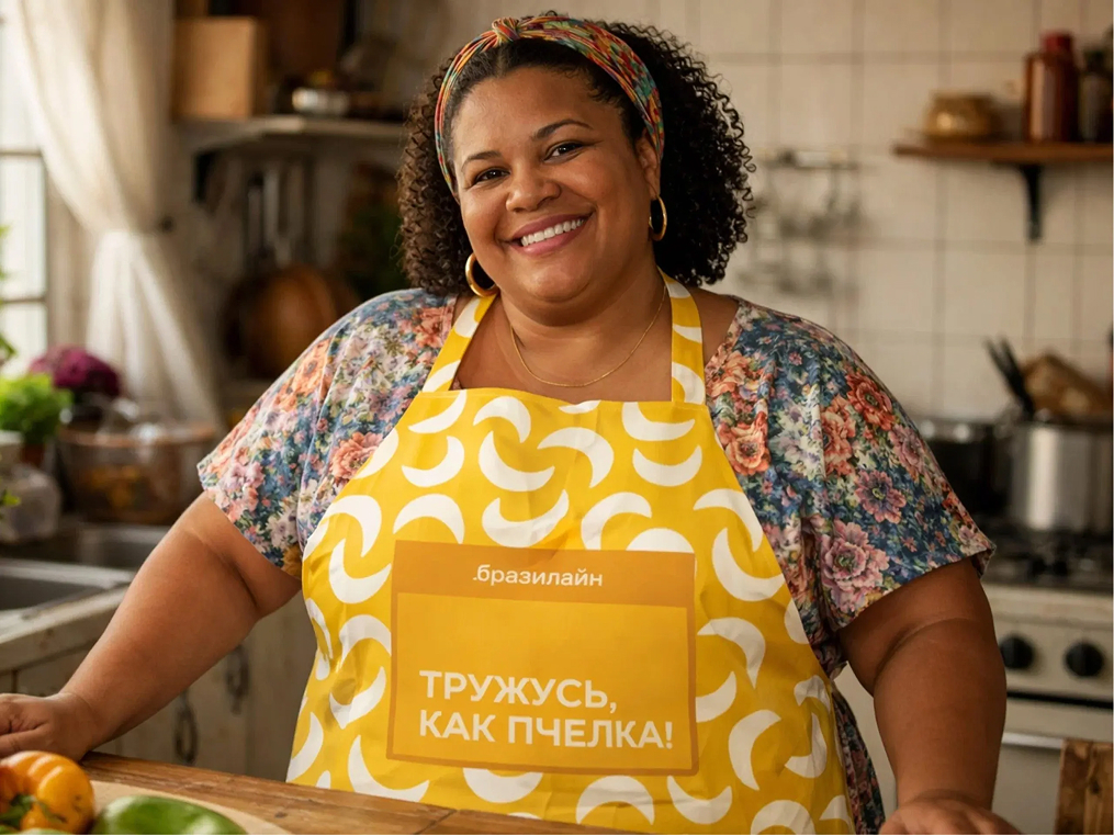 The core of the concept is built around the image of a Brazilian aunt – a charismatic donna who “comes over” and takes care of the household for you. The bottle itself is shaped to resemble the figure of the aunt in profile. The form becomes both a visual metaphor and a structural solution. A key design feature is the apron worn by the character. Its pocket serves a functional role: it contains the technical product information, ingredients, and usage details.