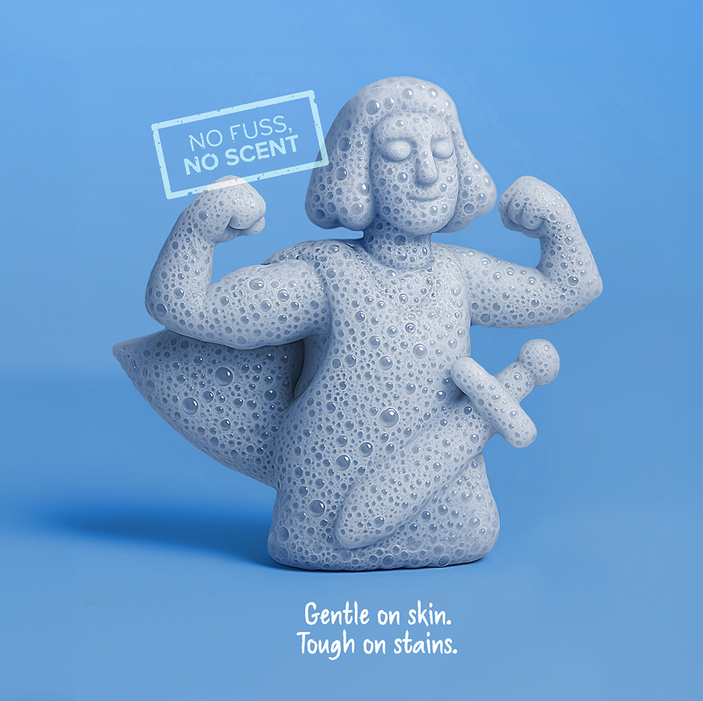 The packaging design for Spumos introduces a unique narrative character, Făt Spumos – a gentle hero inspired by Romanian fairy tales. Created entirely from foam, the character symbolizes softness, care, and effective yet skin-friendly cleaning.