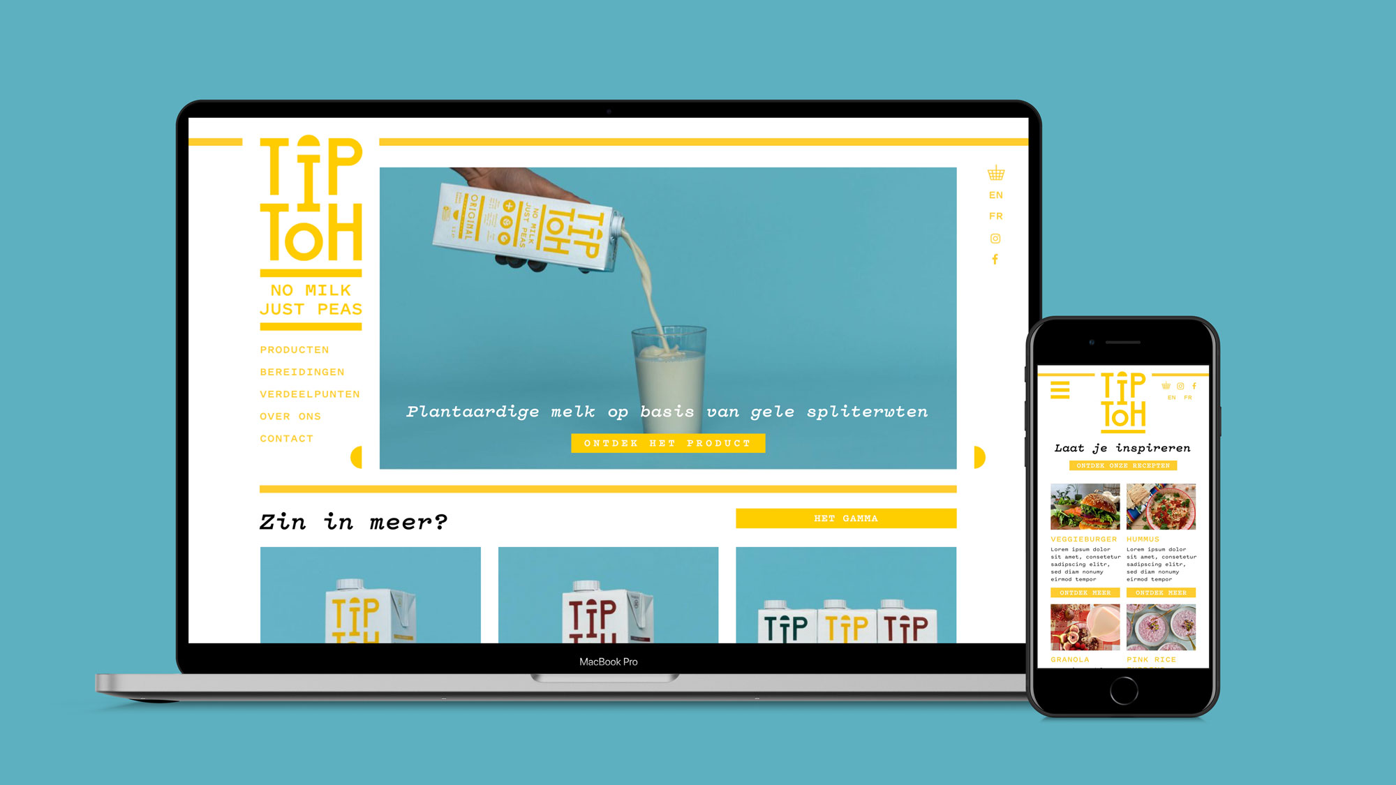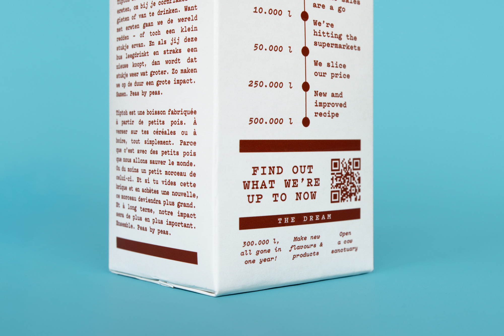 I chose the characteristic yellow color of the pea as the foundational base for the new identity and its first product: the Original. To build a cohesive family, each subsequent product in the Tiptoh range was given its own distinct spot color, combined solely with the clean white base of the packaging. This approach creates a striking, color-coded series designed to attract maximum attention and high recognizability on busy store shelves. One of the main challenges we tackled was Tiptoh’s ambition to communicate as transparently as possible. To achieve this, I transformed their unique road-to-market journey into a visual story, featuring it prominently on every carton. This narrative element turns the packaging into an educational tool, bridging the gap between the field and the fridge.