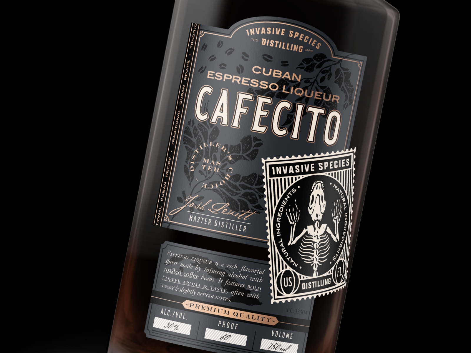 This label design for Cafecito, a Cuban espresso liqueur, is rooted in storytelling, heritage, and a subtle sense of intrigue. The concept draws inspiration from vintage apothecary packaging, old-world postage stamps, and botanical illustration, reinterpreted through a contemporary premium lens. The goal was to create a product that feels both artisanal and slightly mysterious—something that invites closer inspection and rewards the viewer with layered details.