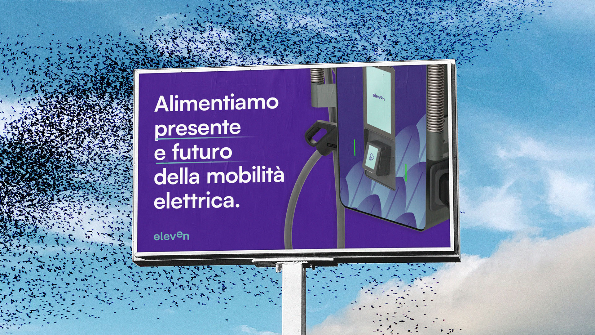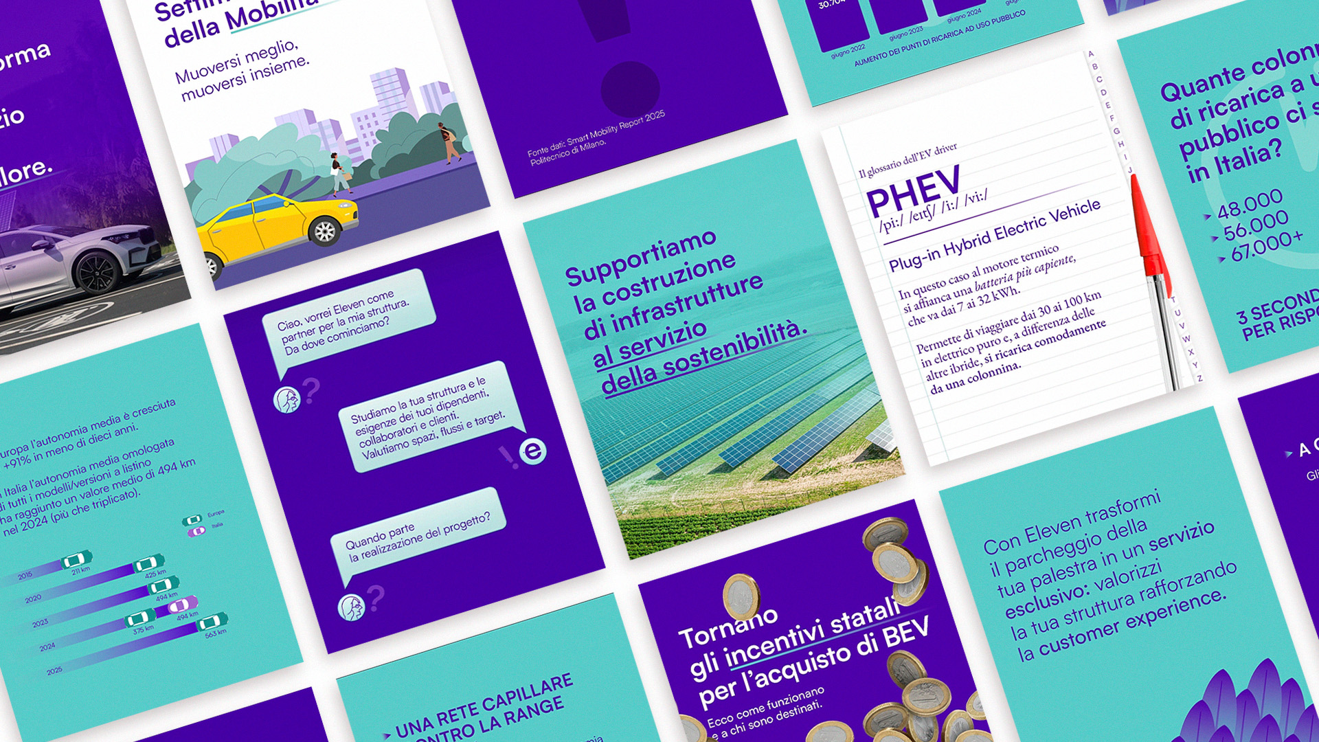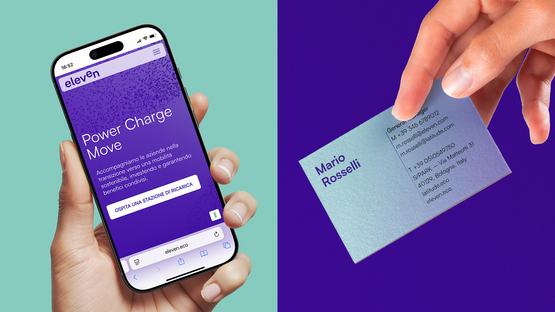For Eleven, the approach is more dynamic, embodying the rhythm of movement, the flow of connection, and the pulse of contemporary mobility. The graphic system features fluid lines and circular geometries that echo energy in motion. The color system — deep electric blue, bright lime green, and neutral greys — evokes technology, nature, and balance. This duality between motion and stability creates a recognizable and scalable identity across all touchpoints.