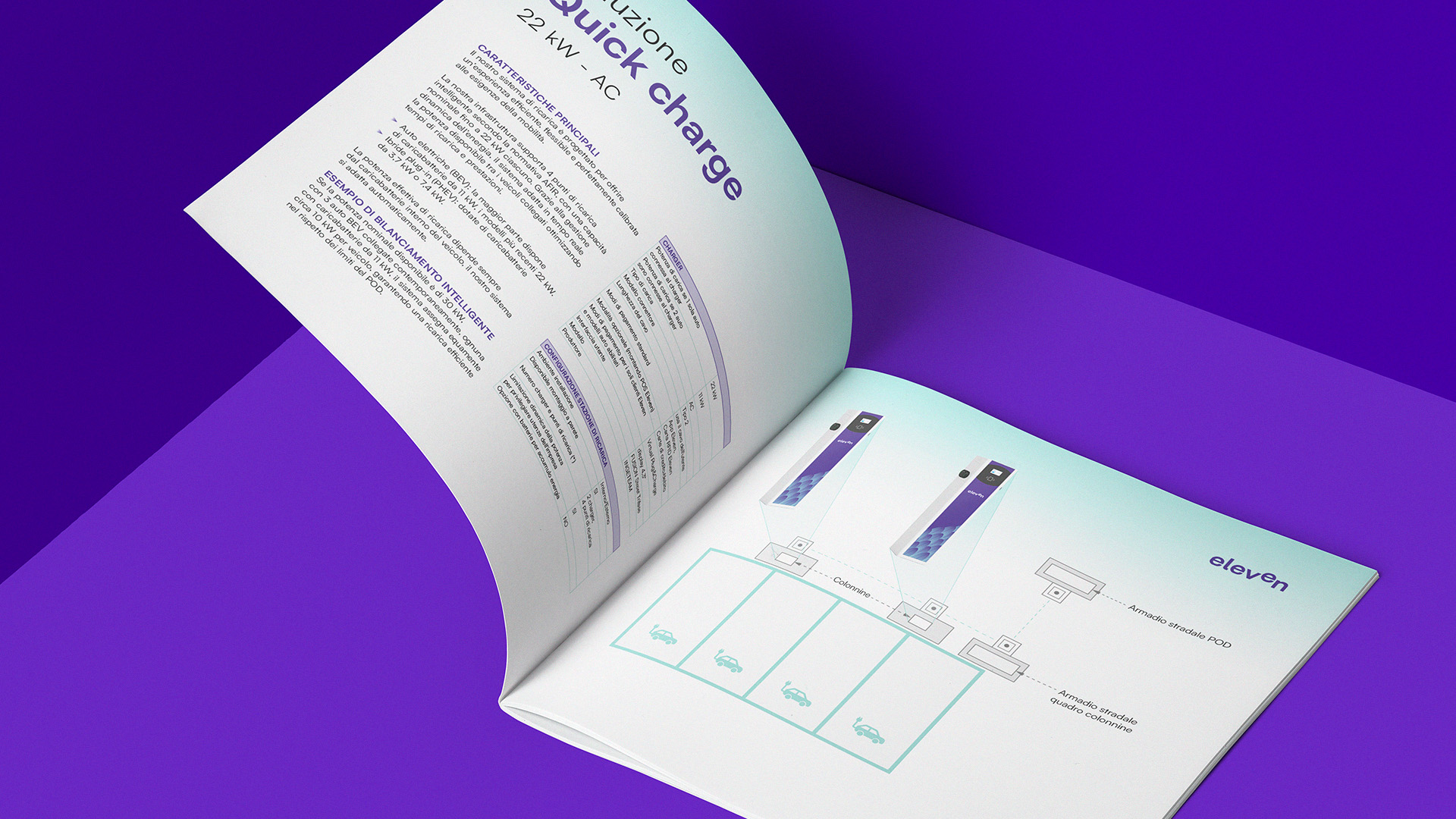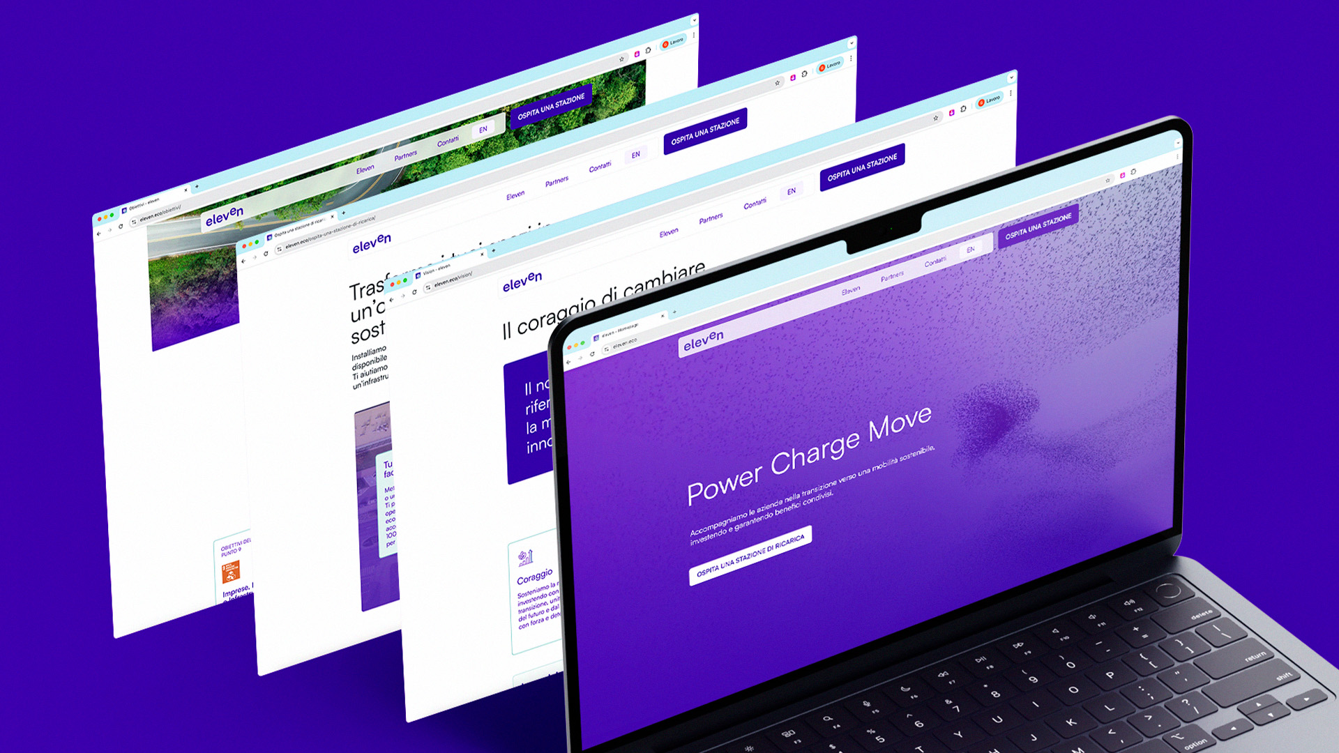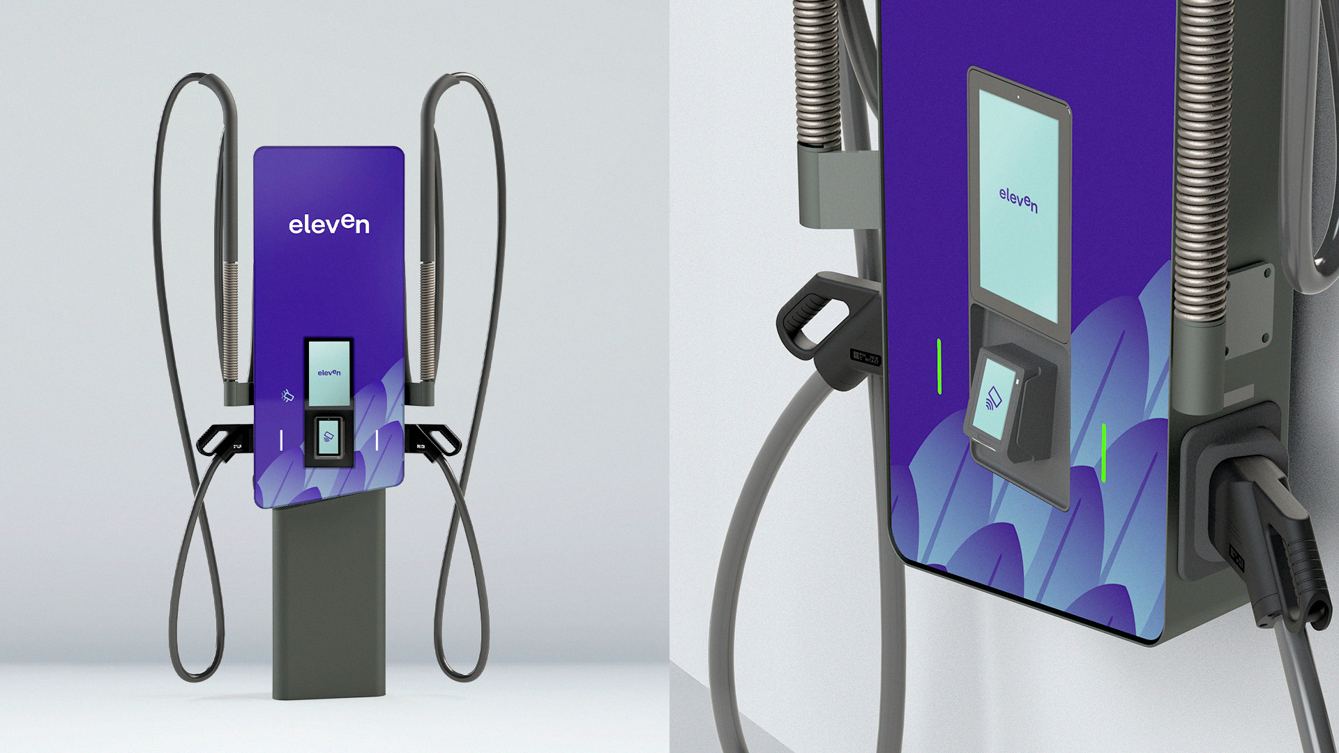For Eleven, the approach is more dynamic, embodying the rhythm of movement, the flow of connection, and the pulse of contemporary mobility. The graphic system features fluid lines and circular geometries that echo energy in motion. The color system — deep electric blue, bright lime green, and neutral greys — evokes technology, nature, and balance. This duality between motion and stability creates a recognizable and scalable identity across all touchpoints.