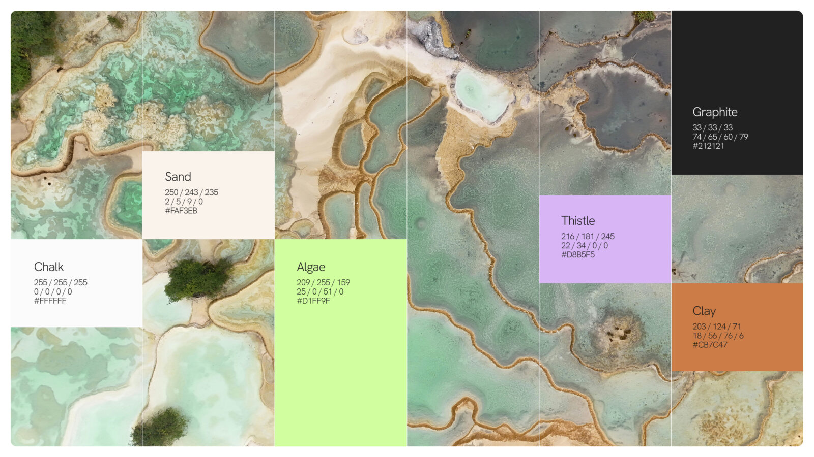 The colour palette draws on a plane’s-eye view of the earth: energetic greens, earthy pigments, and warm neutrals. Each shade is named after minerals and flora, rooting the identity in the natural environment. This is paired with textures from our natural landscape; tactile reminders of what’s at stake in the climate crisis.