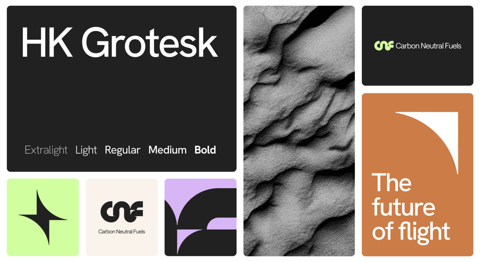 Workshops with the CNF founders uncovered a central theme of connection: between science and nature, people and planet, innovation and purpose. This guided the brand proposition and visual approach. The logo, an abstract rendering of the initials CNF, symbolises collaboration and momentum, with subtle aviation cues anchoring it in the sector. The colour palette is drawn from a plane’s-eye view of the earth, complemented by textures inspired by minerals, water, and sand. These natural elements are balanced with a high-precision treatment of the CNF mark, conveying scientific rigour.